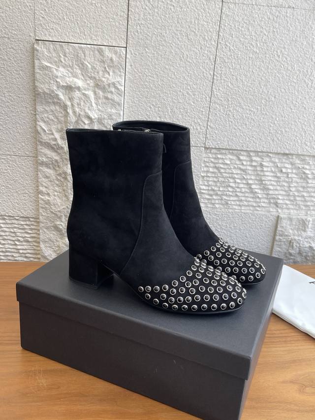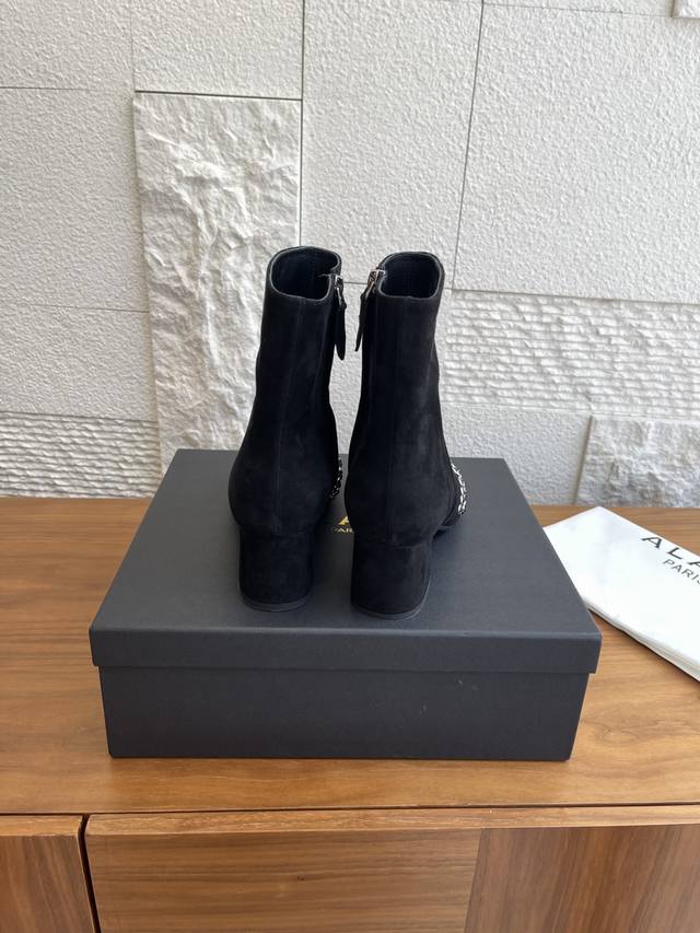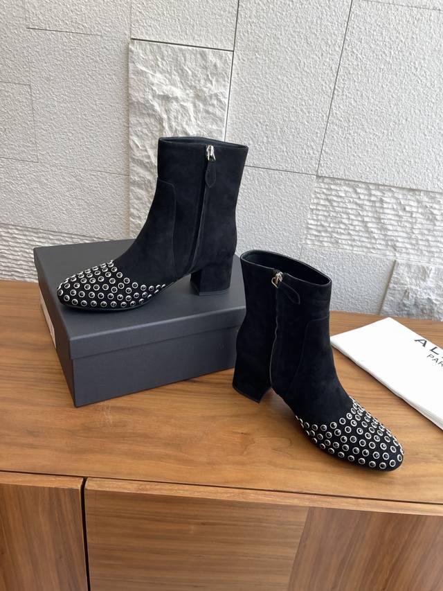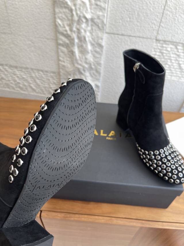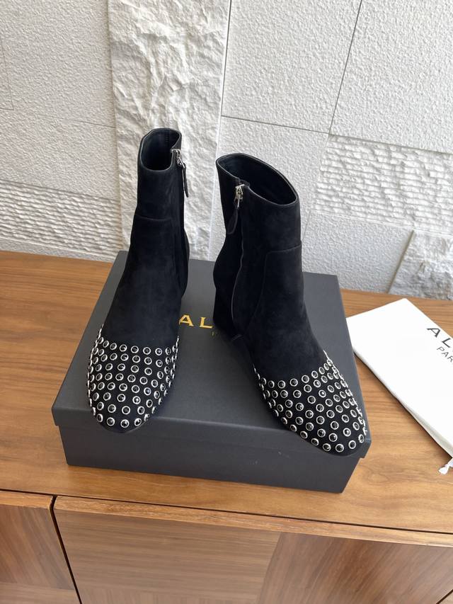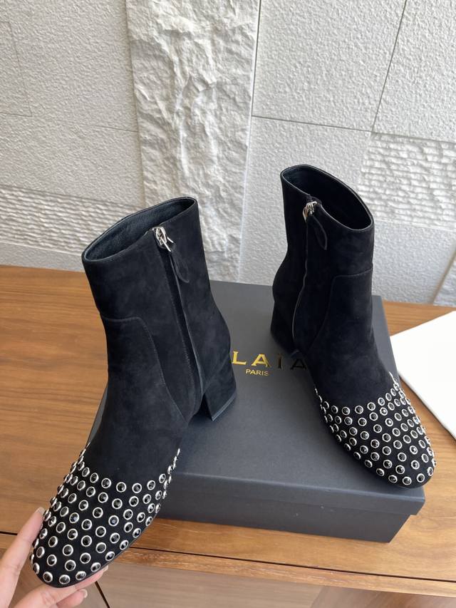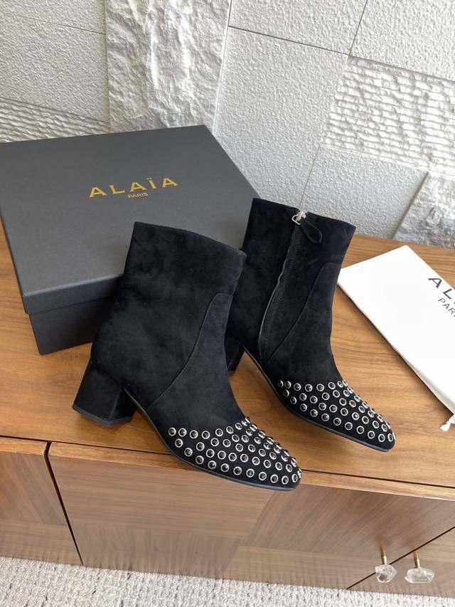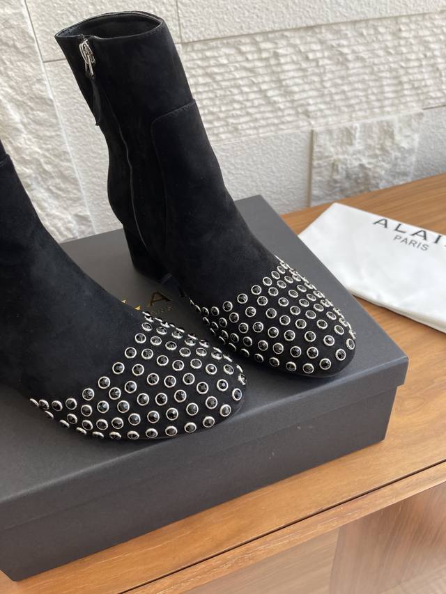 Alaia 25Ss Autumn/Winter New Round Toe Rhinestone Rivet Side Zipper Chunky Heel Ankle Boots. These Alaia ankle boots are absolutely stunning! Made of high-quality suede, the crystal rhinestone rivet design on the toe is incredibly eye-catching, and the side zipper detail is sleek and cool. They feature a 6cm semi-circular chunky heel, exuding fearless confidence and sculpted elegance. Wearing them instantly transforms you into the coolest kid on the block! Material: Imported suede, imported calfskin. Lining: Imported sheepskin. Outsole: Original molded rubber outsole. Heel Height: 6cm. Size: 35-42, 40, 41, 42 (Made to order, no returns or exchanges).