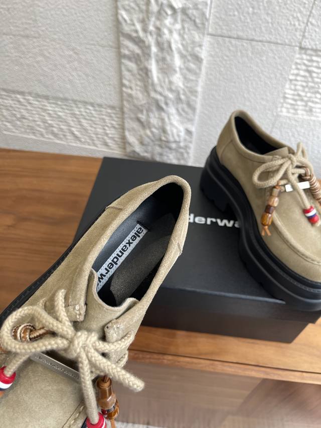 Top Version: Alexander Wang 25Ss Autumn/Winter New Retro Lace-up Platform Loafers Casual Shoes. These Alexander Wang platform loafers are made of suede, with laces featuring metal logo sliders and various bead embellishments. The simple and elegant design, combined with a 7cm platform sole, gives them a casual and stylish look. They are comfortable, lightweight, and allow for free movement, satisfying everyday individual style needs. Material: Imported suede; Insole: Imported sheepskin; Outsole: Original molded rubber foam outsole; Size: 35-40 (40 sizes are custom-made and non-refundable).