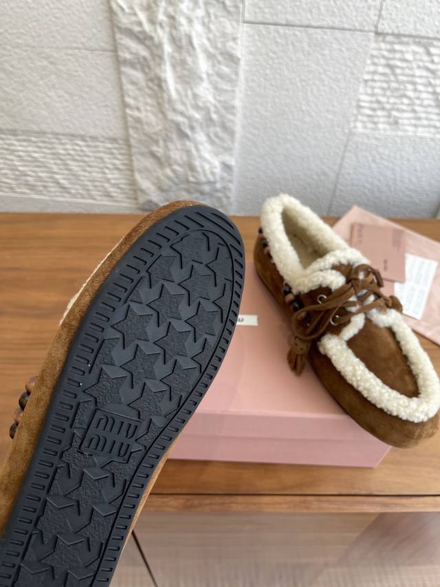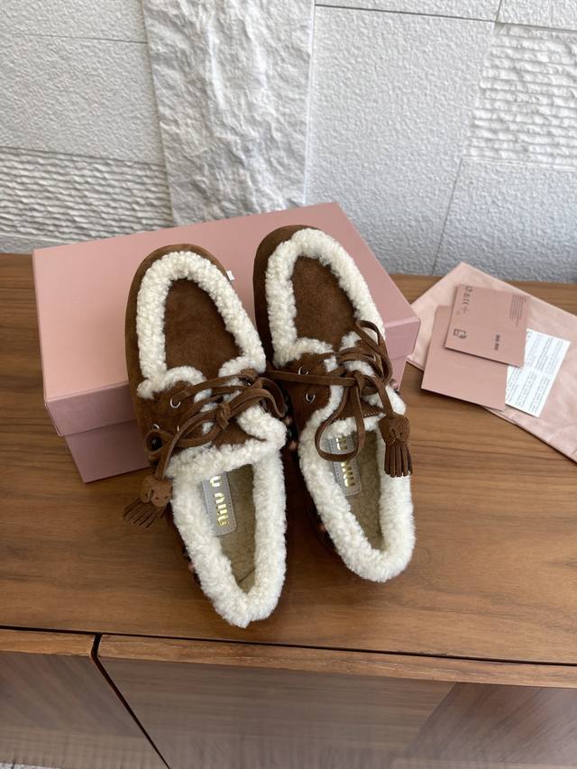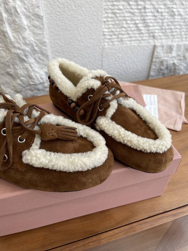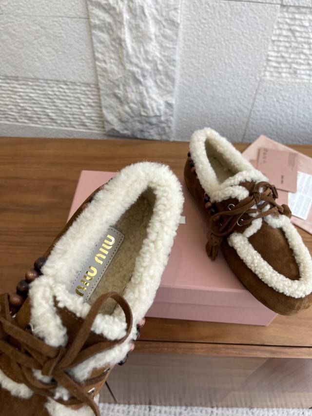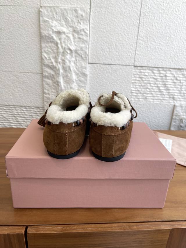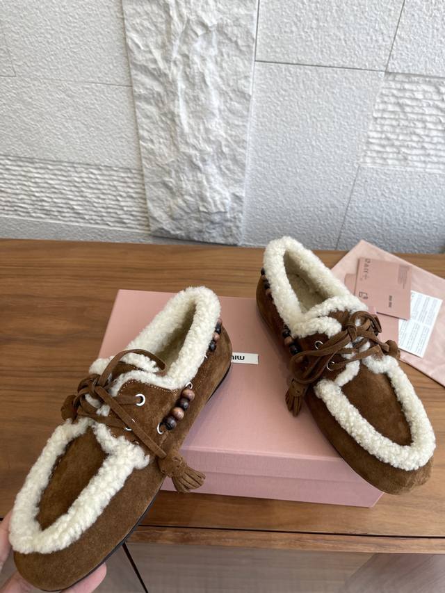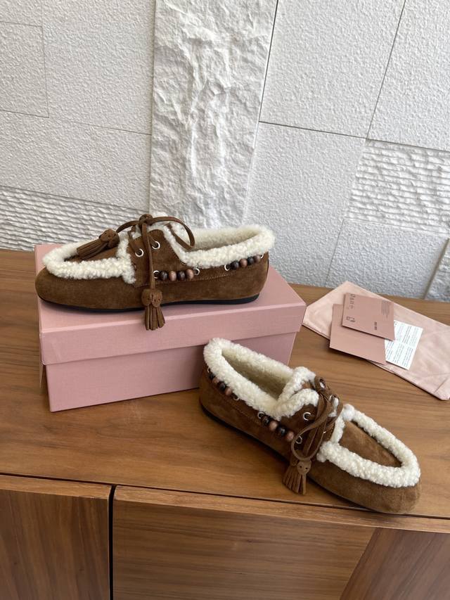 Top Version: Comes with a beautifully crafted box from a boutique. Miu Miu 25Ss Autumn/Winter New Arrival Wooden Bead Tassel Sheepskin Loafers. These tassel loafers feature a lightweight silhouette and exquisite details, including a wooden bead-decorated upper, a suede leather tassel apron, an embossed logo on the tongue, and a silkscreened logo on the insole. The suede leather is particularly striking, offering a distressed effect and authentic charm. Material: Original custom-made imported top-grain cow suede. Lining: Imported sheepskin. Outsole: Original molded rubber outsole. Size: 35-40 (40 sizes are custom-made and non-refundable).