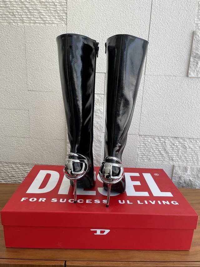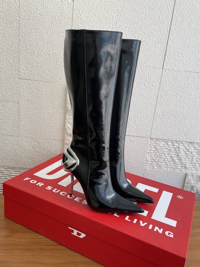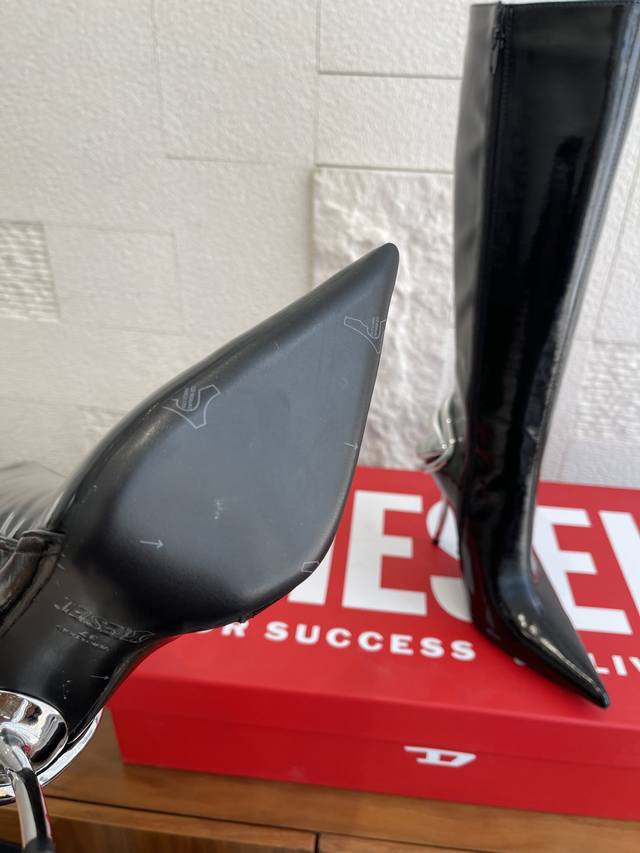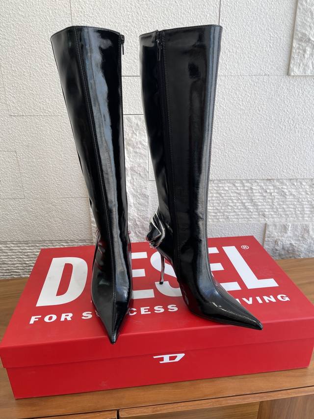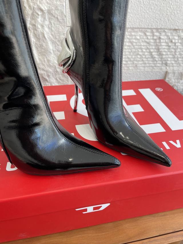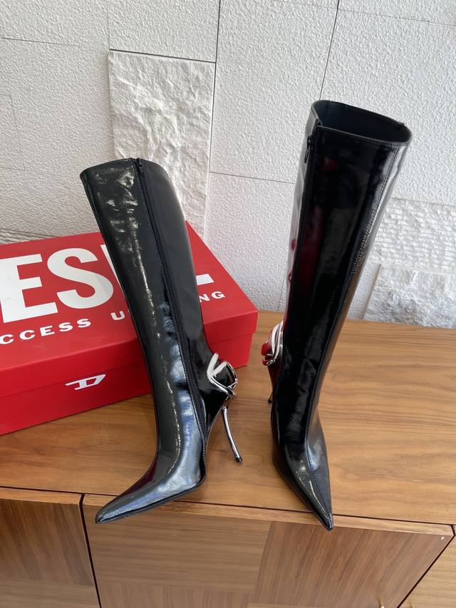 Top Version: DDD Diesel 2026 New D-Strap Pointed Toe High-Heeled Boots DDD These black patent leather high-heeled boots from Diesel have a strong mirror-like sheen. The pointed toe and stiletto heel design create clean lines and exude confidence! The knee-length design flatters the leg proportions, making you look taller and slimmer. They pair beautifully with skirts and trousers. The side zipper makes them easy to put on and take off, a detail that's perfect. Stylish and practical for autumn and winter, they're suitable for both commuting and formal occasions, making them an essential item to elevate your look! DDD Material: Imported patent leather DDD Lining: Imported sheepskin DDD Outsole: Imported genuine leather outsole DDD Heel height: 10cm DDD Size: 35-41 40 41 Custom orders are non-refundable and non-exchangeable DDD