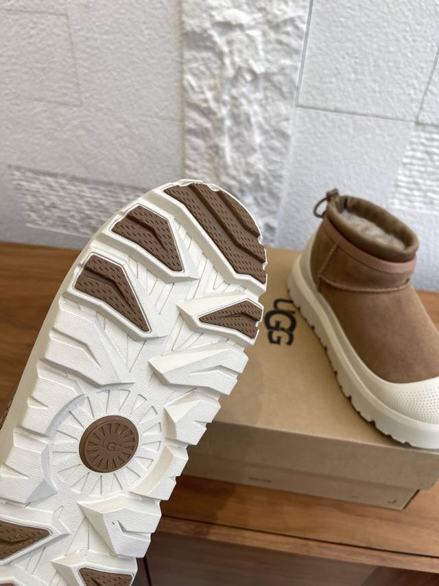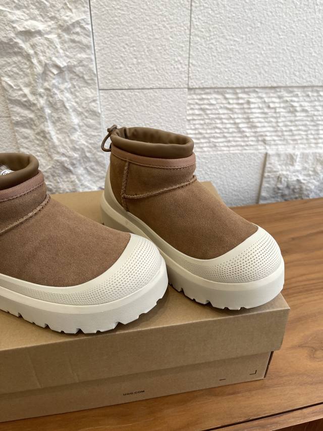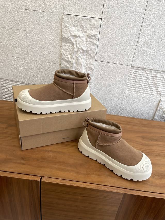 Ugg 2025 Autumn New Unisex Heritage Series Cl Ultra Mini Weather Hybrid Classic Waterproof Mixed Style Ankle Boots/Snow Boots. This unisex Heritage Series Cl Ultra Mini Weather Hybrid classic waterproof mixed style ankle boot features a trendy color-blocking design for an eye-catching look. It has a split cow suede upper, approximately 17mm Uggplush lining and insole, elastic laces and buckles, a high-top boot shaft, and combines functionality and warmth. The Eva outsole has a non-slip spider web rubber sole for excellent grip. Material: Imported cow suede; Lining: Sheepskin; Outsole: Eva foam outsole. Size: Women's 35-40, Men's 39-45. Size 45 is custom-made and non-refundable.