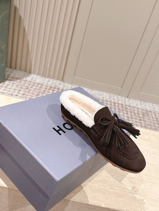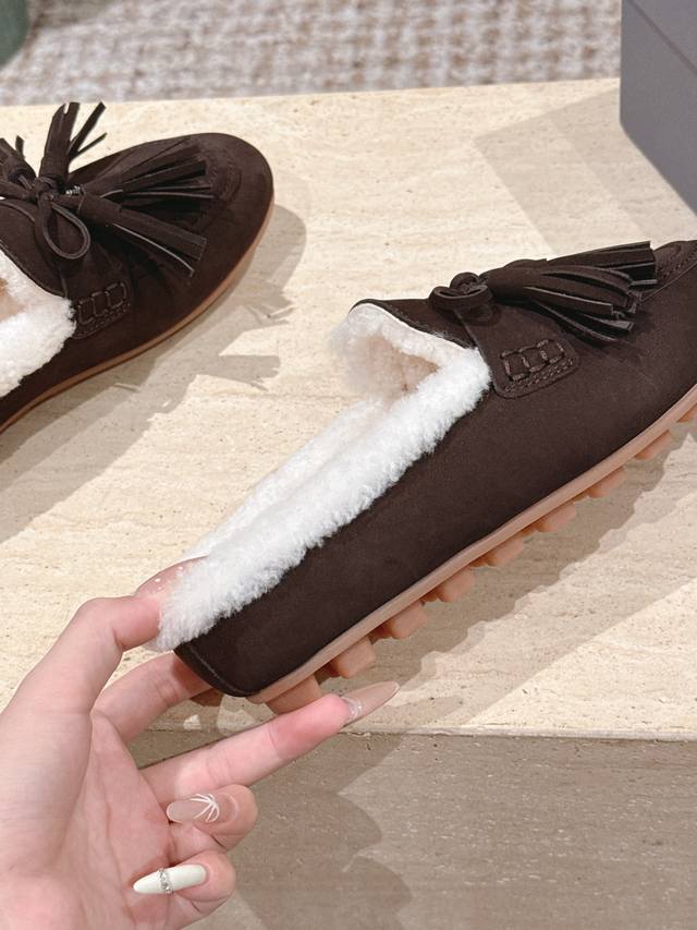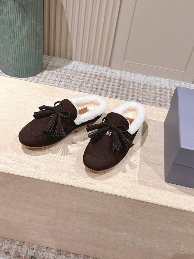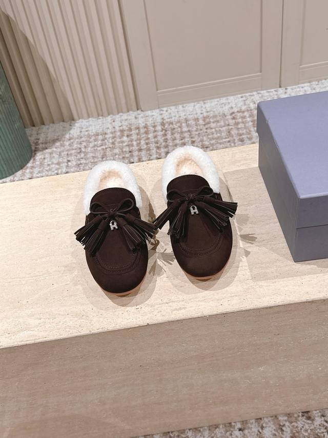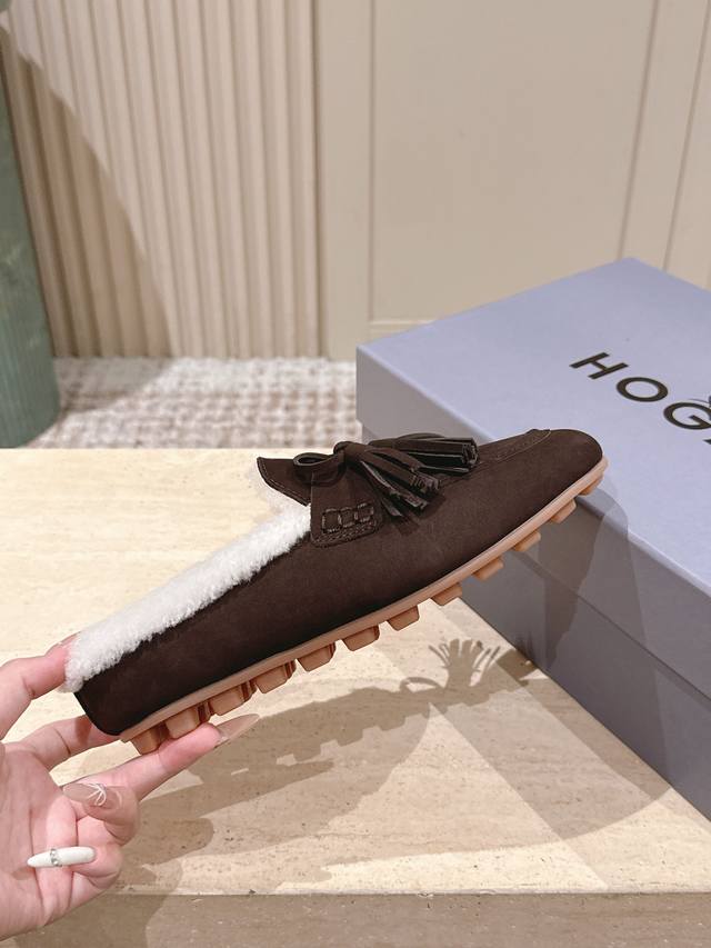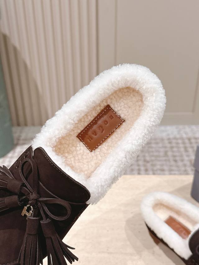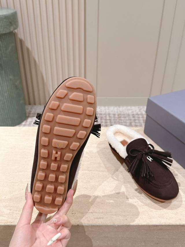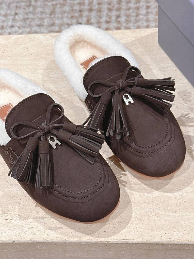 Top Version: Hoga* Suede Tassel Fleece-Lined Mules DDD Made of suede, the upper has a delicate texture; the fleece lining provides excellent warmth in winter, making them suitable for cold weather. Adorned with tassels and bows, the tassels add a retro and lively touch, while the bows make the shoes more delicate and cute, resulting in an overall retro yet playful style. DDD These are mules, with a backless design for easy on and off, while also exuding a casual and relaxed feel. Paired with high-waisted jeans and a loose sweater, they are both comfortable and stylish. The tassel design adds a highlight to the overall look, suitable for everyday outings or weekend leisure activities. DDD Upper: Cowhide DDD Lining: Wool DDD Outsole: Original molded outsole DDD Sizes: 35-41 Custom sizes 40-41 are non-refundable and non-exchangeable DDD