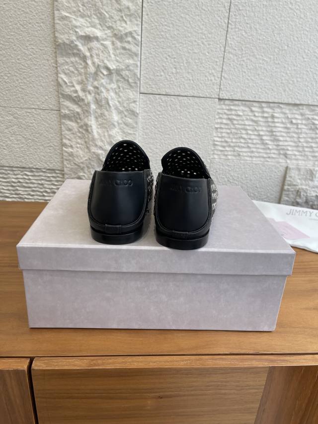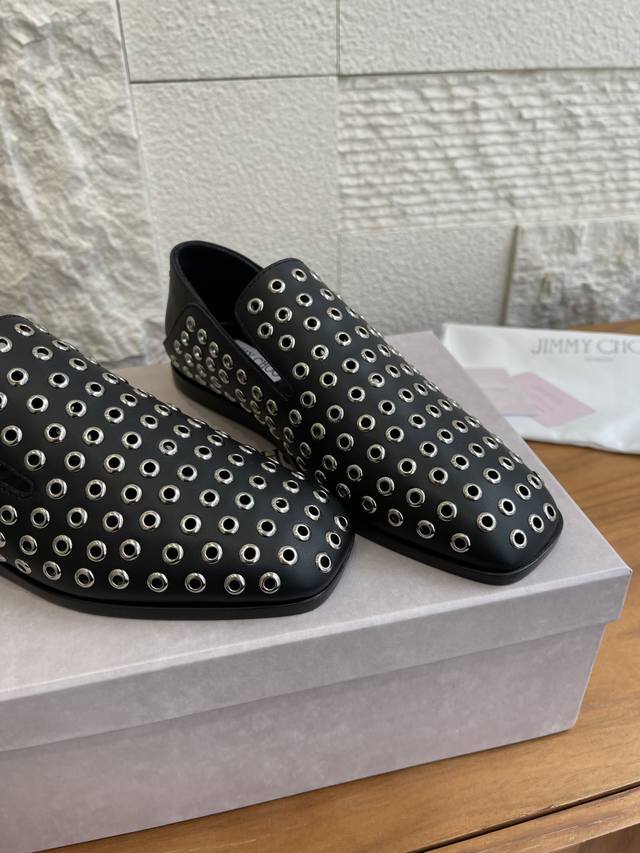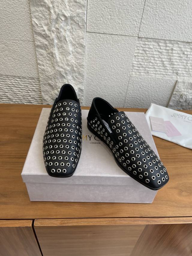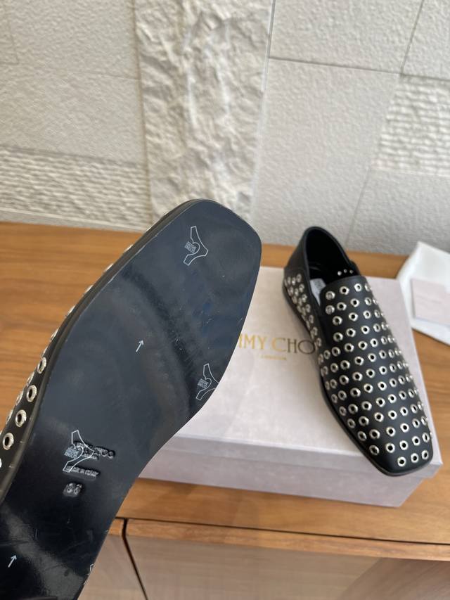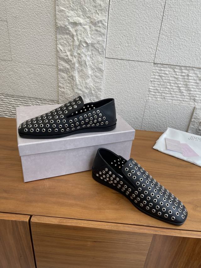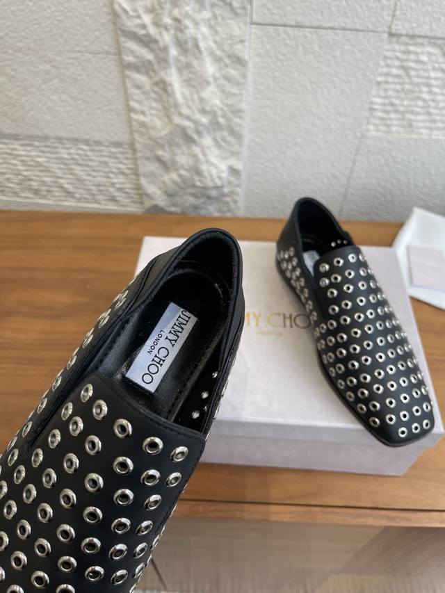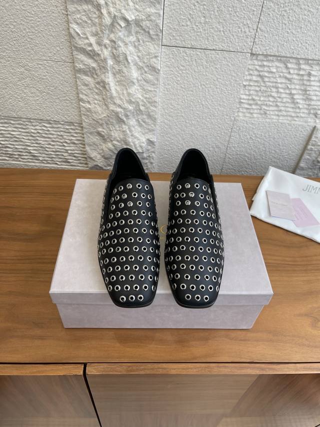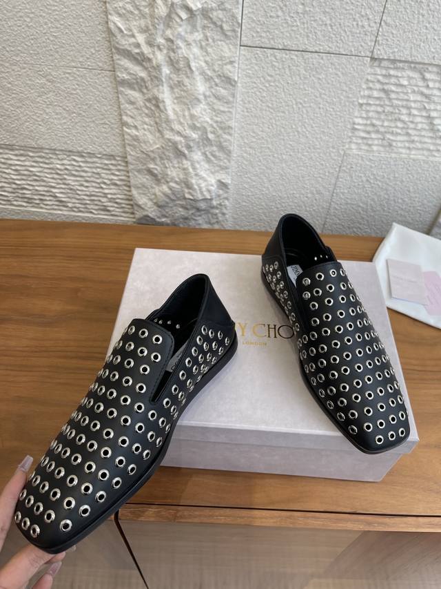 Top Version: DDD Jimmy Choo 2025 Wang Yibo's Eliot Slipper Flat Mid-Heel Shoes DDD Jimmy Choo Eliot series loafers, crafted from metallic leather and adorned with approximately 272 polished silver eyelets, feature a unique and eye-catching design, offering a modern reimagining of classic loafers. The stylish square toe and V-shaped upper, paired with a smooth leather lining with soft padding, provide a pillow-like softness. The foldable heel design and flat sole cleverly combine practicality and comfort, making them lightweight, flexible, and stylish, ensuring comfortable wear. DDD Material: Imported top-grain calfskin DDD Insole: Imported sheepskin DDD Outsole: Italian imported genuine leather DDD Size: 35-41 40 41 Custom orders are non-refundable DDD