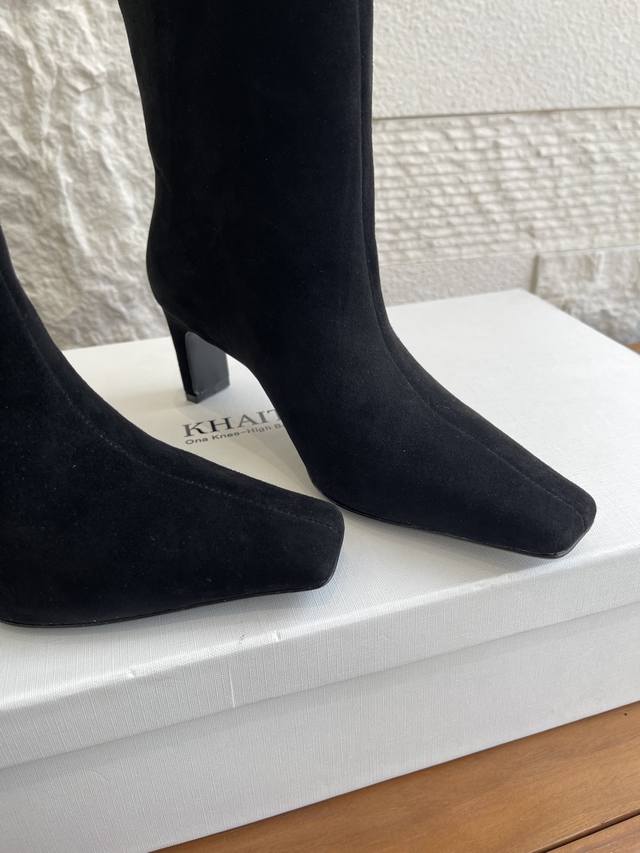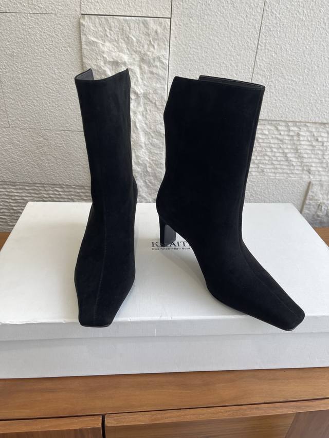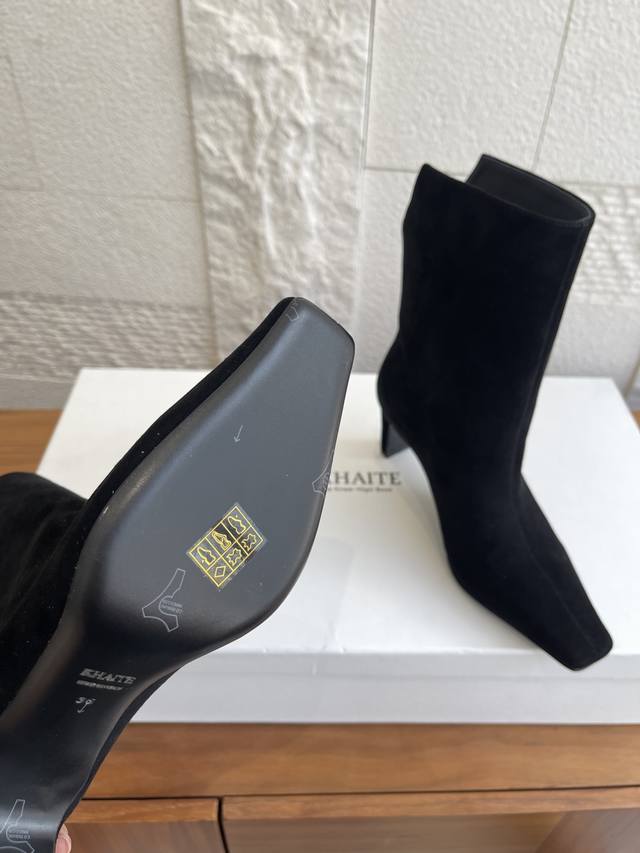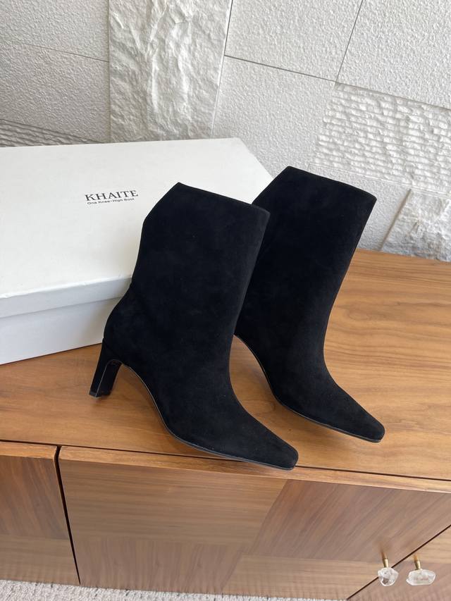 Khaite 2025 Autumn/Winter New Square Toe High-Heeled Ona Ankle Boots. The unique notched back design of these