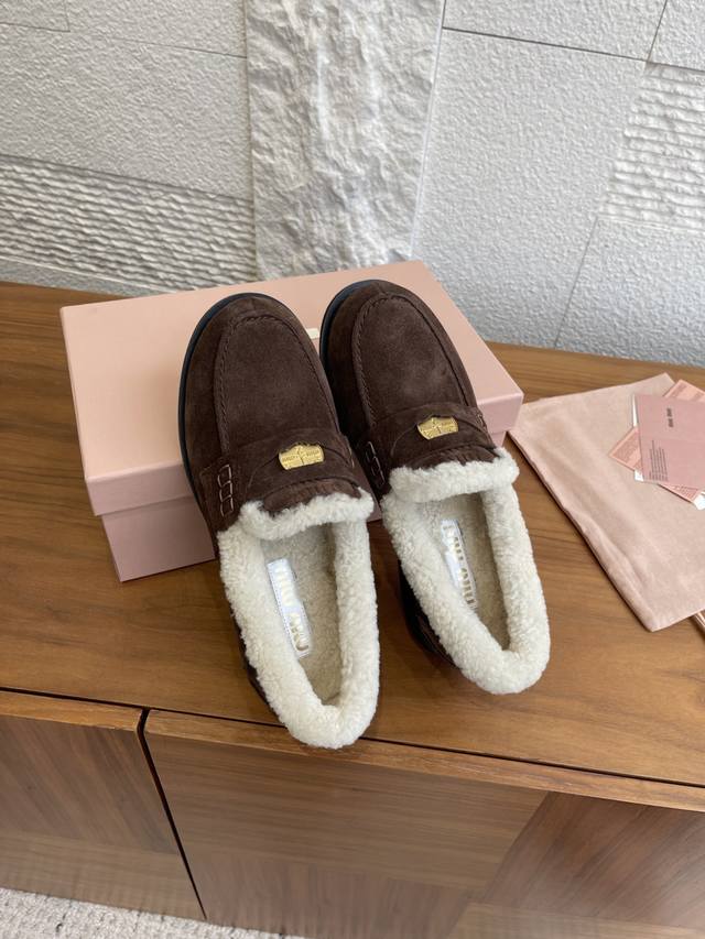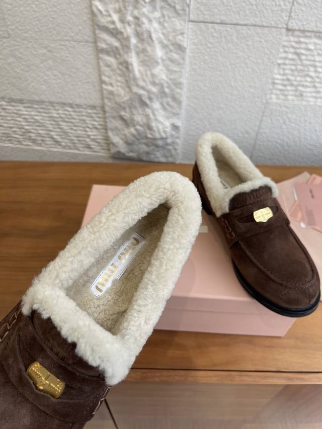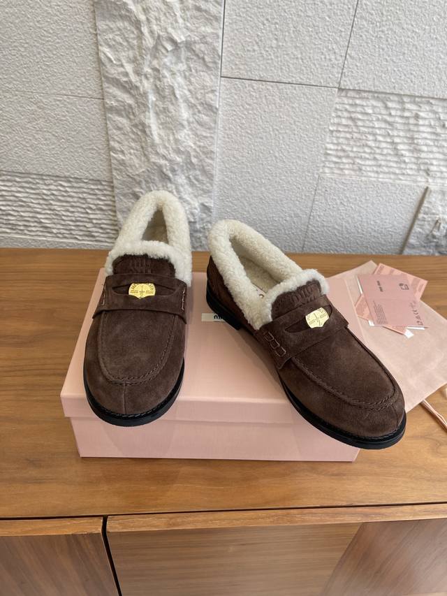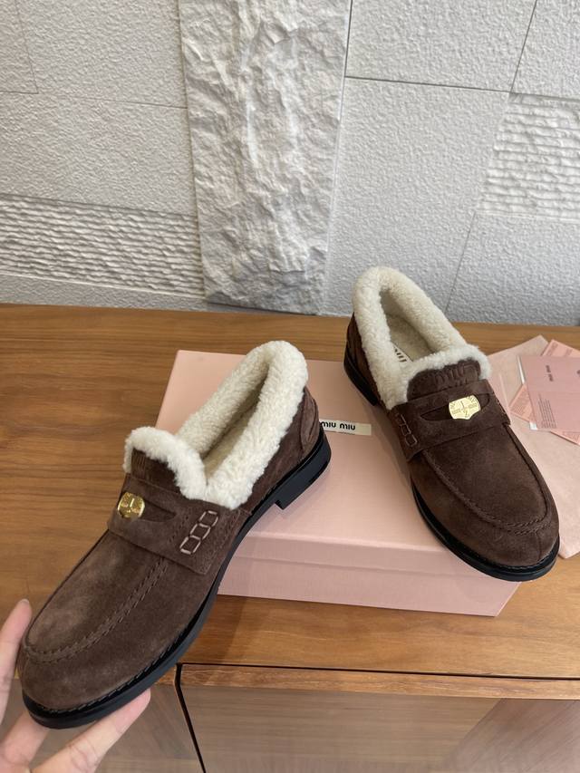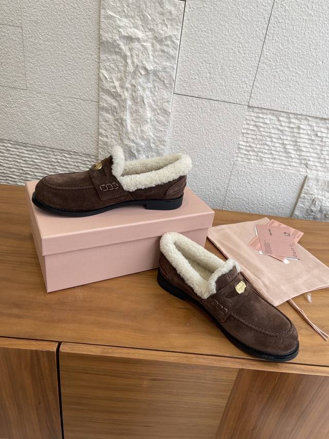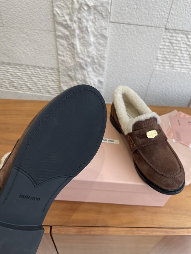 Top Version: Miu Miu 2025 Autumn/Winter New Gold Coin Wool Lined Loafers DDD These Miu Miu Autumn/Winter coin-patterned loafers feature high-gloss cowhide leather and a genuine wool lining, making them soft, warm, and incredibly comfortable for autumn and winter wear. The upper is decorated with classic "little coin" details, showcasing impeccable style. The round toe and slip-on design are retro and versatile, suitable for both work and leisure. The non-slip sole ensures a safer walking experience. Pair them with socks for a preppy look, or with a coat and sweater for a complete autumn/winter ambiance