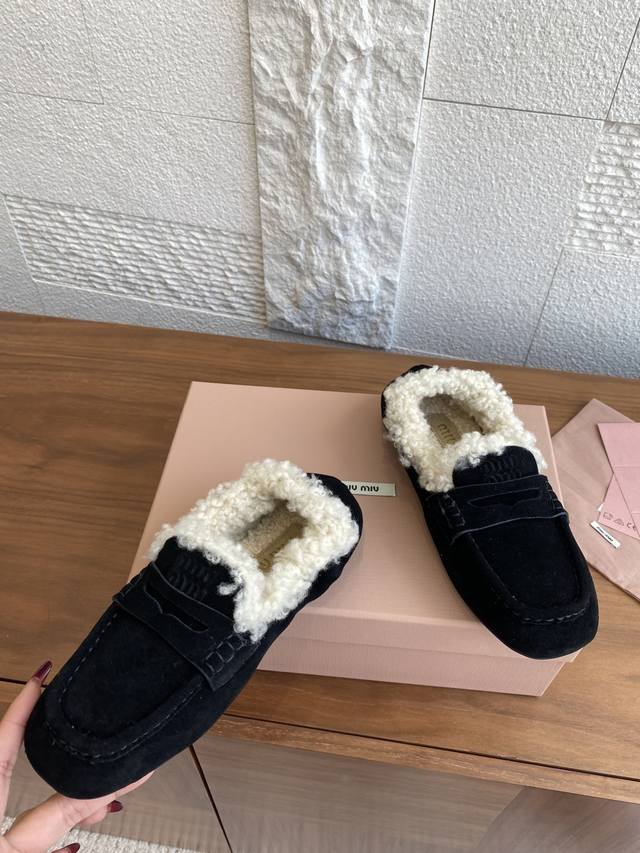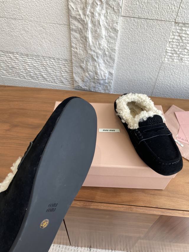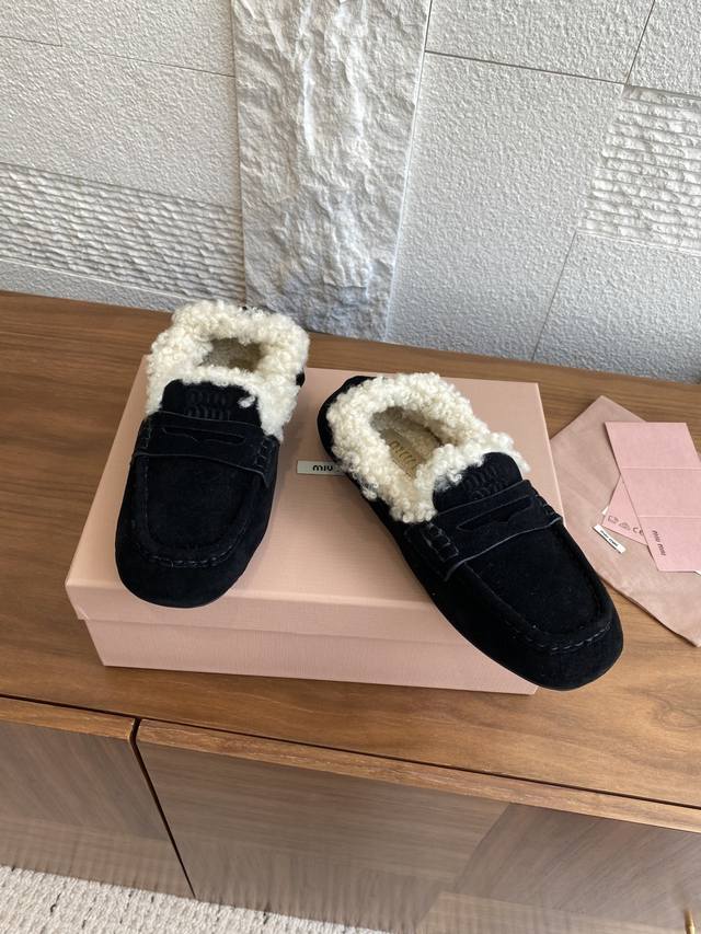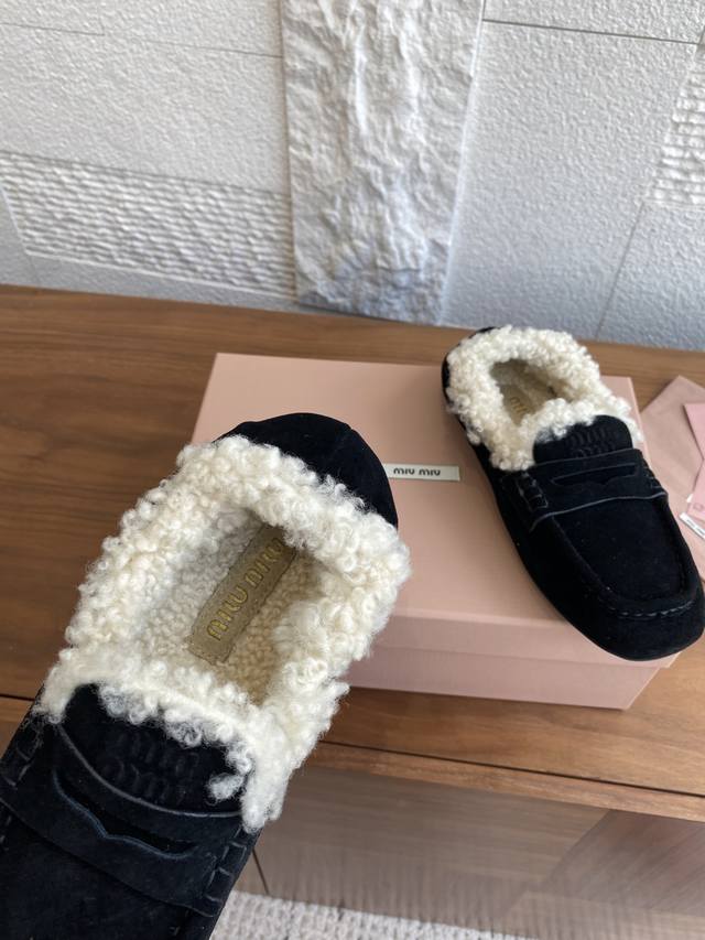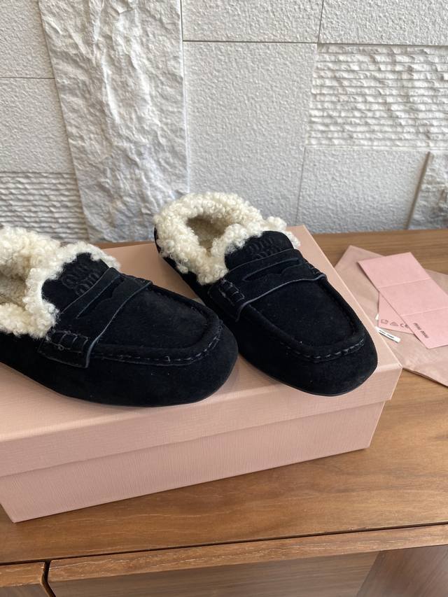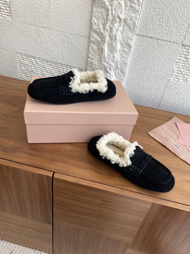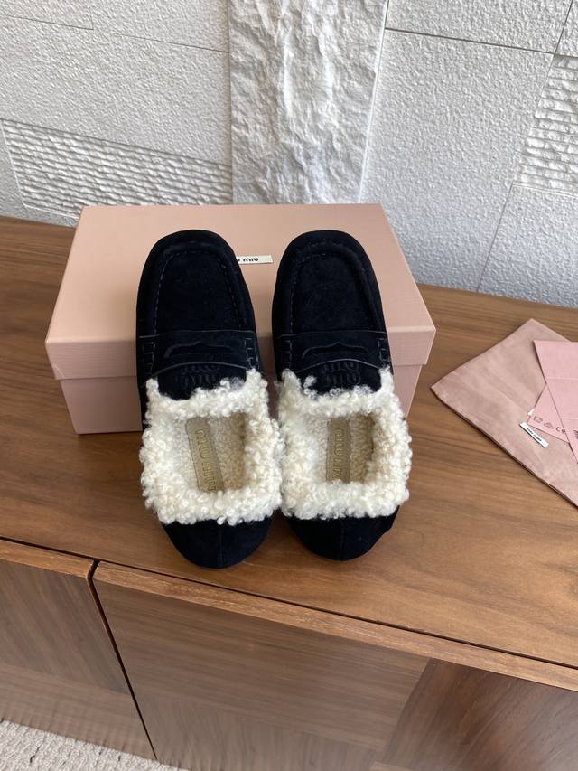 Top Version: Miu Miu 25Ss Autumn/Winter New Sheepskin Fur Lined Loafers. These autumn/winter loafers feature a high-gloss cow suede upper, presenting a delicate velvety texture, adding a soft and warm feel to the shoes . This material is not only comfortable to the touch but also has a certain degree of wear resistance and breathability. The lining is covered with white sheepskin fur, which looks very soft and fluffy, providing good warmth for the feet, making it suitable for wearing in colder seasons. Material: High-gloss cowhide split leather; Lining/Insole: Imported sheepskin fur; Outsole: Original molded rubber outsole; Size: 35-41 (40.41 is custom-made and non-refundable).