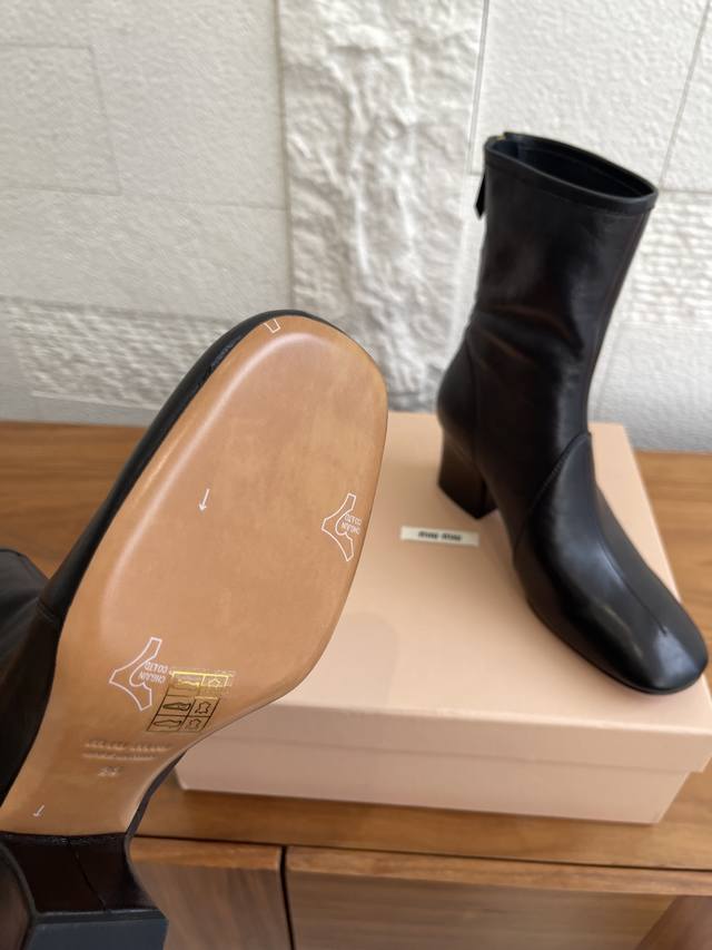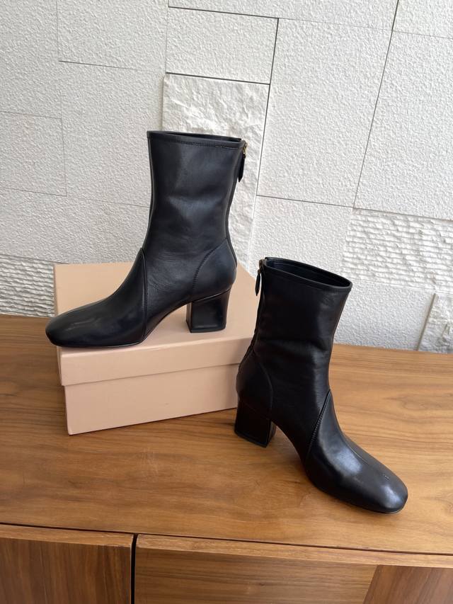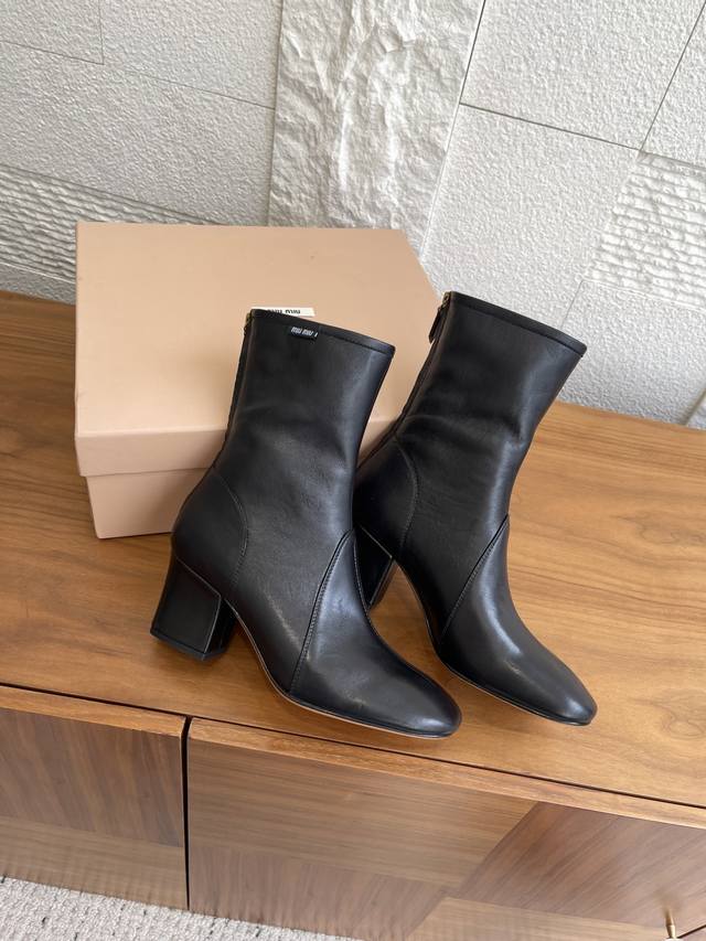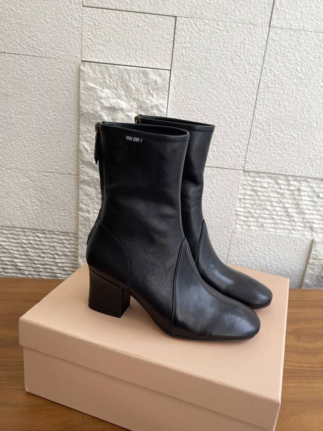 Top Version: Miu Miu 25Ss Fall/Winter Fashion Show Back Zipper Chunky Heel Ankle Boots. These Miu Miu Nappa leather ankle boots, with their glove-like fit, combine softness and iconic features. A classic piece in the Miu Miu wardrobe, they are designed to celebrate every interpretation of feminine charm with effortless elegance. Material: Imported calfskin; Lining: Imported cowhide; Outsole: Italian imported genuine leather; Heel Height: 6.5cm; Size: 35-41 (40-41)