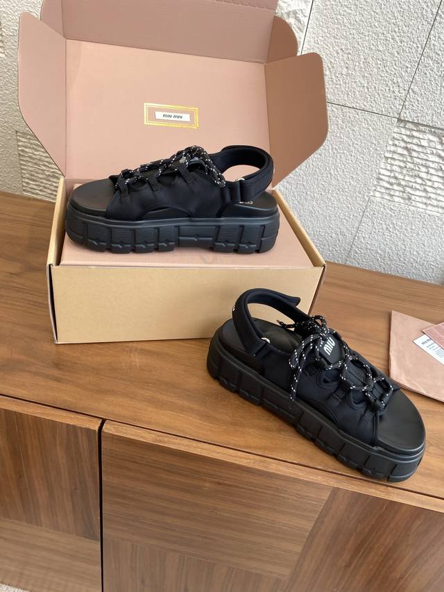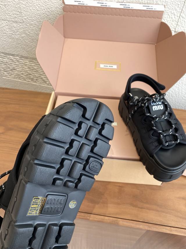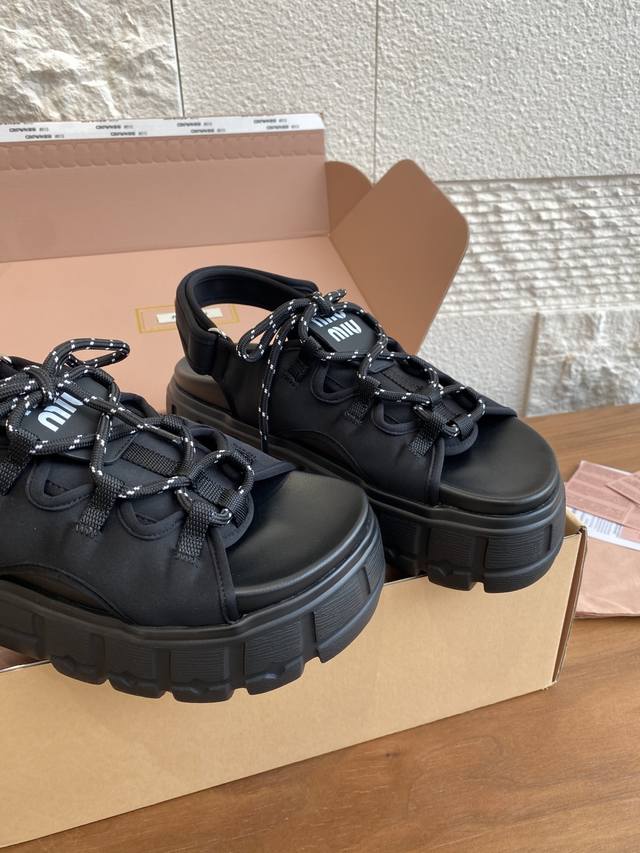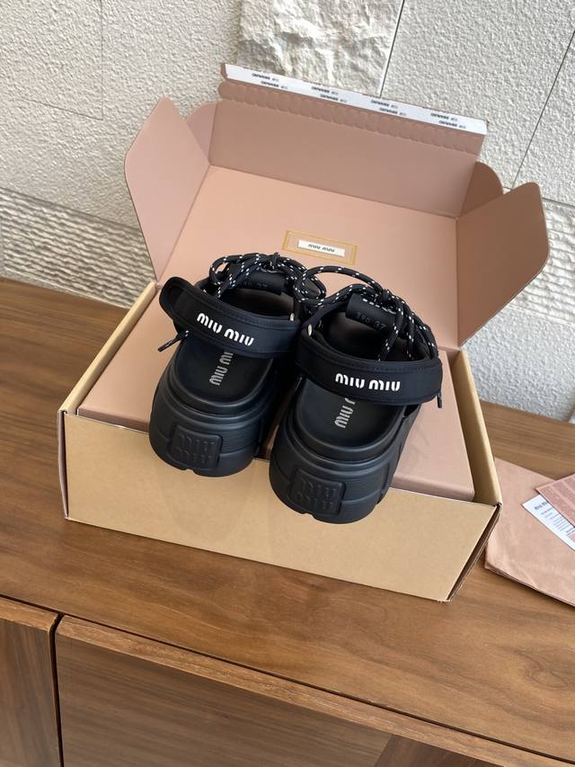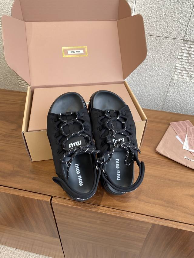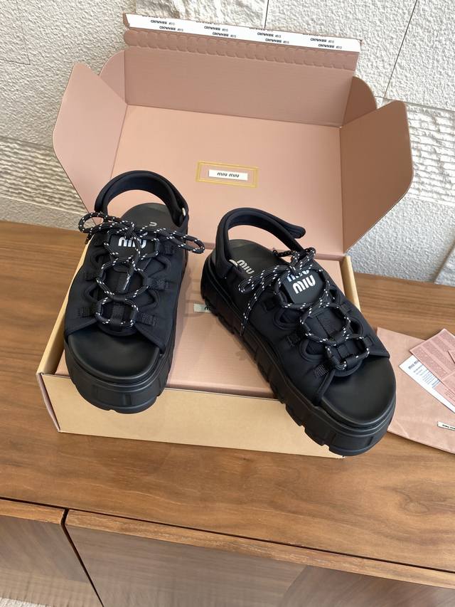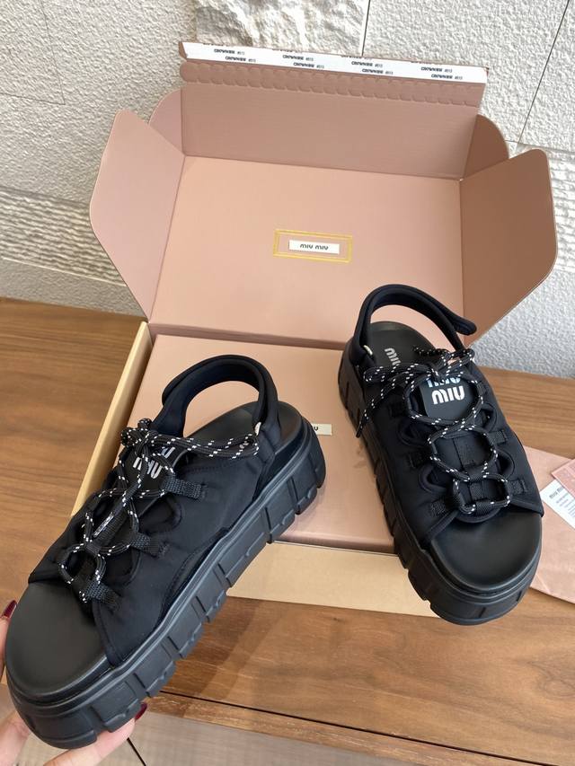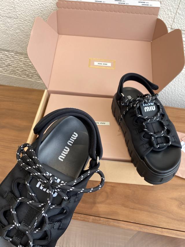 Top Version: Miu Miu 25Ss Summer New Lace-up Velcro Platform Sandals. These casual neoprene sandals feature a trendy, voluminous silhouette with two-tone laces, embodying the Miu Miu brand spirit. Highly recommended! A must-have for stylish and versatile ladies, these sandals are height-enhancing, slimming, and leg-lengthening. Super lightweight and comfortable. Features Miu Miu brand exclusive laces and a Miu logo on the upper. Material: Original custom Lycra. Outsole: Eva foam outsole. Size: 35-40 (40 is custom-made and non-refundable).