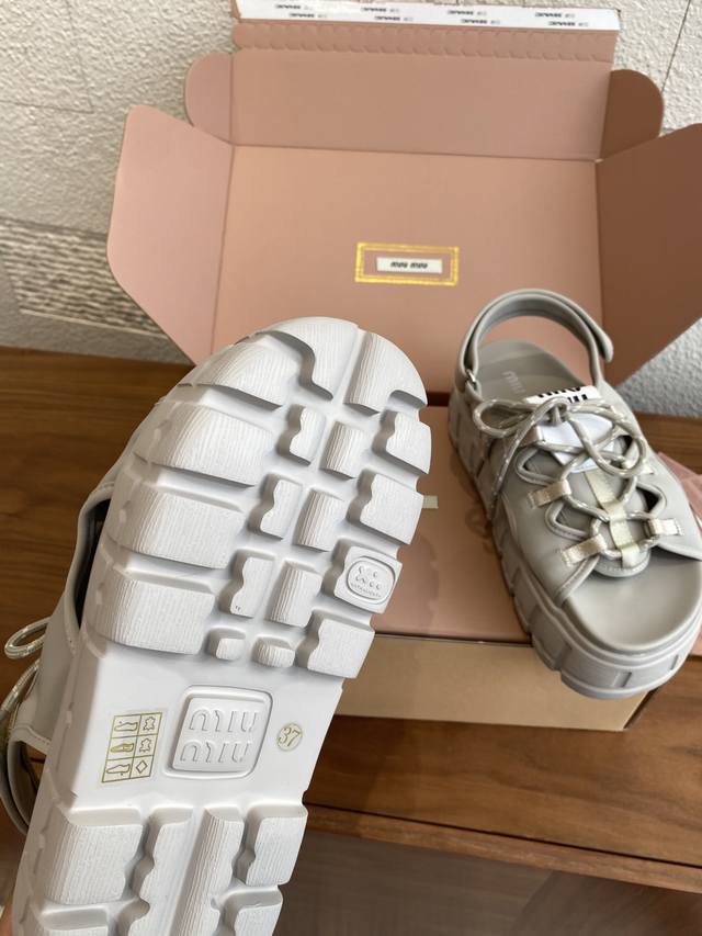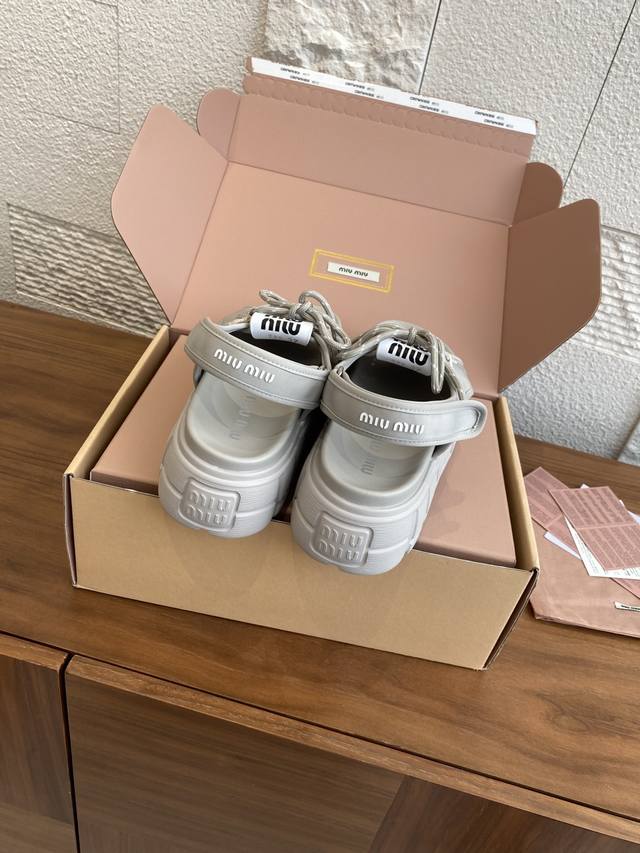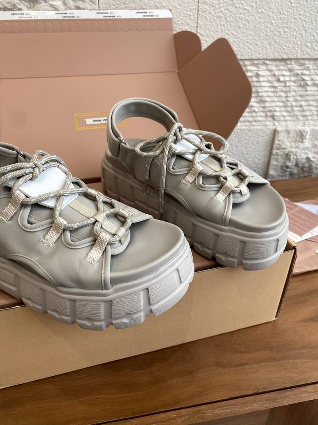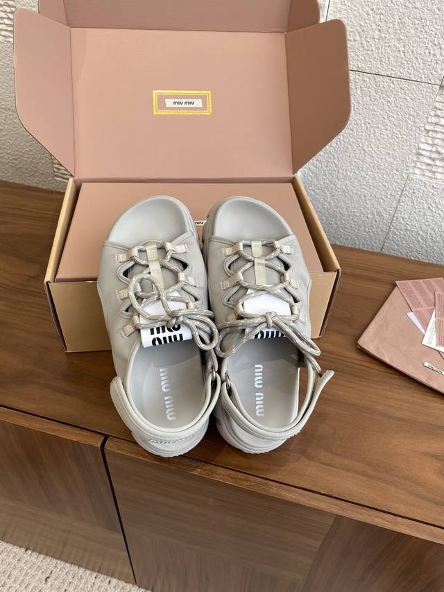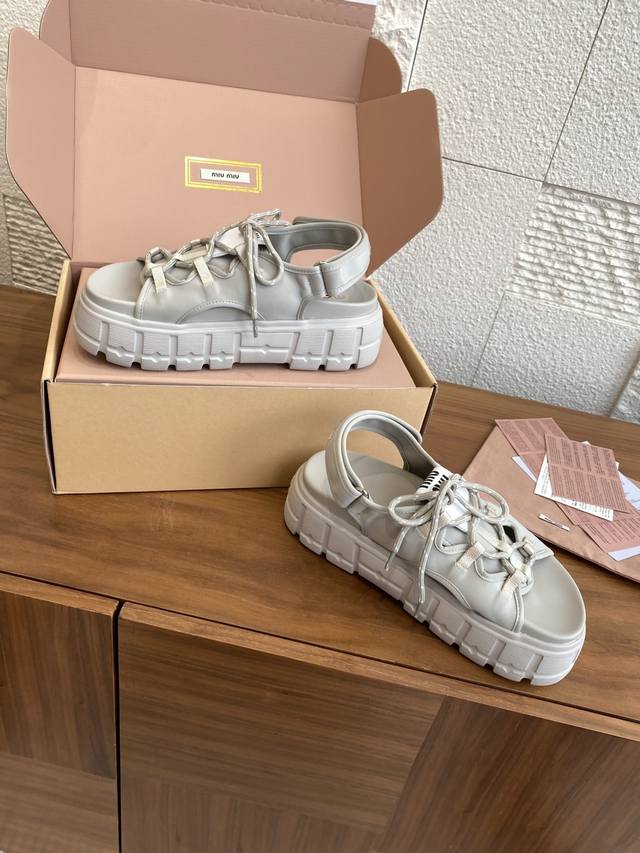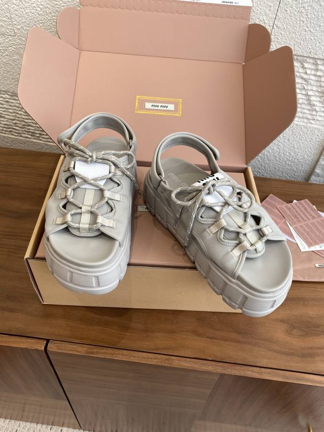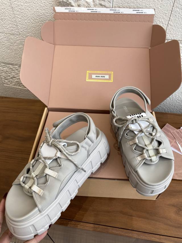 Top Version: Miu Miu 25Ss Summer New Lace-up Velcro Platform Sandals. These casual neoprene sandals feature a trendy, voluminous silhouette with two-tone laces, embodying the Miu Miu brand spirit. Highly recommended! A must-have for stylish and versatile ladies, these sandals are height-enhancing, slimming, and leg-lengthening. Super lightweight and comfortable. Features Miu Miu brand exclusive laces and a Miu logo on the upper. Material: Original custom Lycra. Outsole: Eva foam outsole. Size: 35-40 (40 is custom-made and non-refundable).