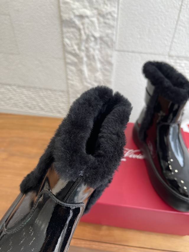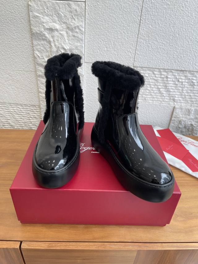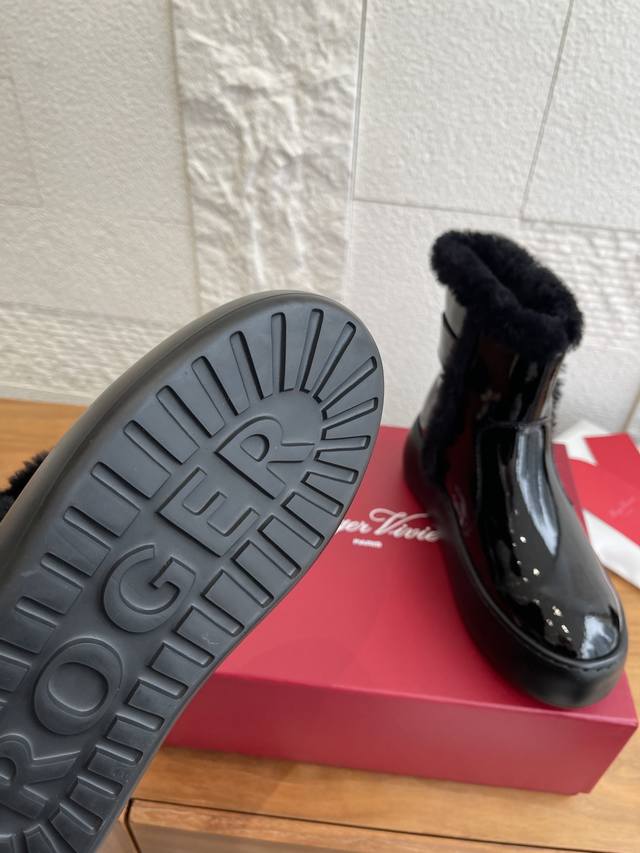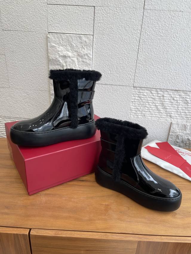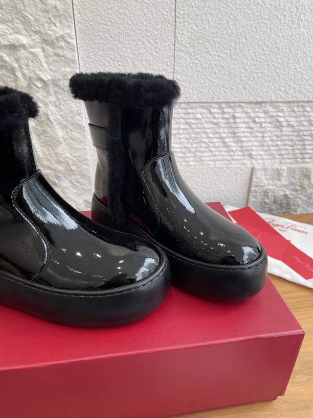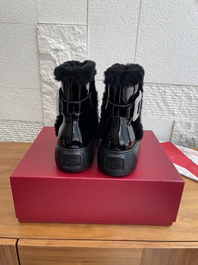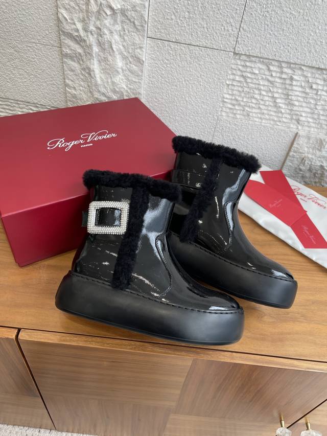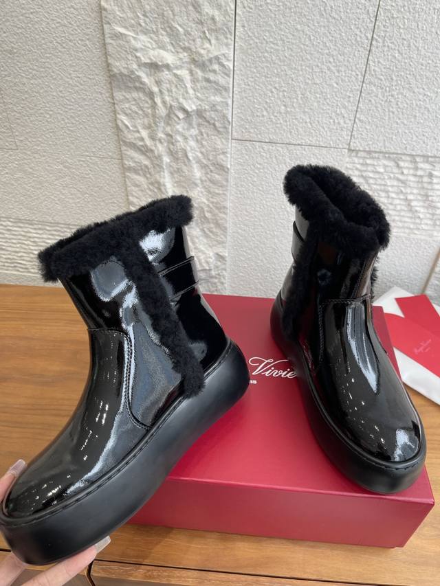 Top Version: DDD Roger Vivier 25Ss Autumn/Winter New Viv' Up Patent Leather Ankle Boots DDD The new Roger Vivier leather boots blend 60s space elements, lightweight yet stylish. The 5cm Eva platform sole is soft and comfortable, making you feel like you're walking on a yoga mat. The upper is made of patent leather with a shearling lining and is adorned with rhinestone buckles on the sides, easily adding a Viviennese flair to a casual look. DDD Material: Imported cow patent leather DDD Lining: Insole: Imported wool DDD Outsole: Original mold TPU rubber foam outsole DDD Size: 35-40 40 Custom orders are non-refundable DDD