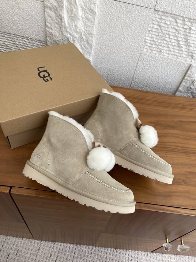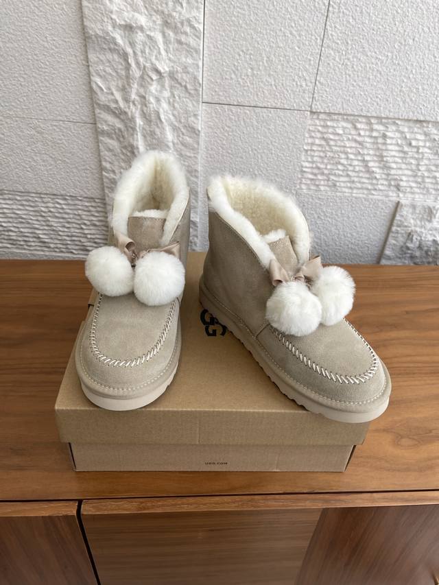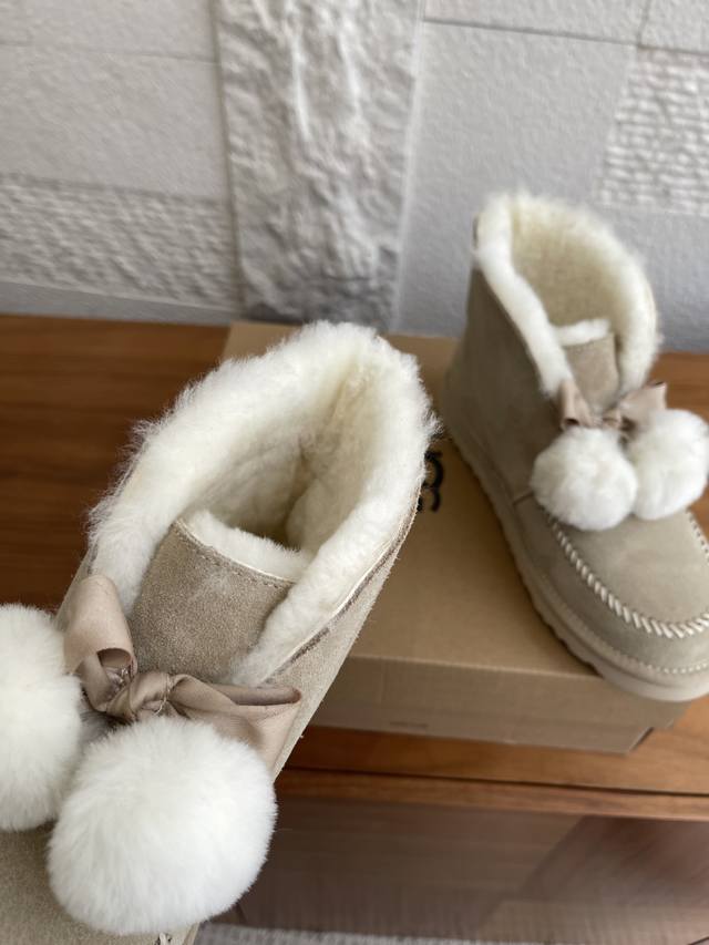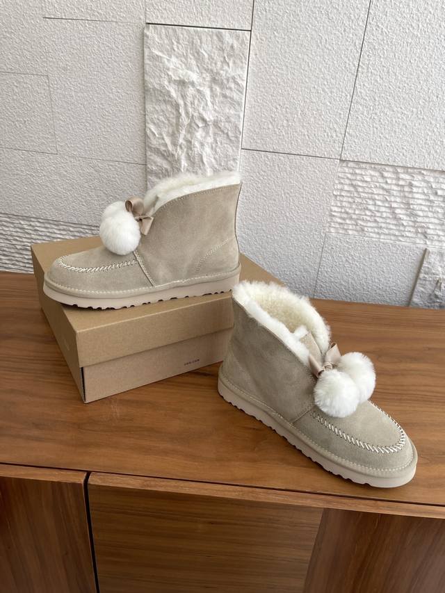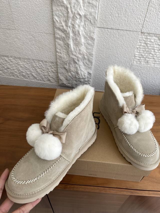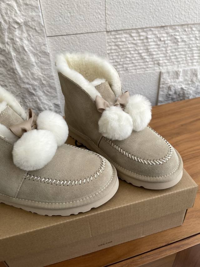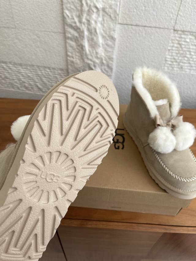 Ugg 2025 Autumn/Winter New Leisure Casual Series Kellen 2.0 Bow Furry Shoes. This Leisure Casual Series Kellen 2.0 features a split cowhide suede upper, approximately 10mm sheepskin lining, a foldable sheepskin collar with a fixed bow, and sheepskin pom-pom decorations. Playful, cute, stylish, and retro, perfect for a relaxed street style. Material: Imported cowhide suede; Lining and insole: Imported wool; Outsole: Original EVA outsole; Size: 35-40 (40 sizes are custom-made and non-refundable).