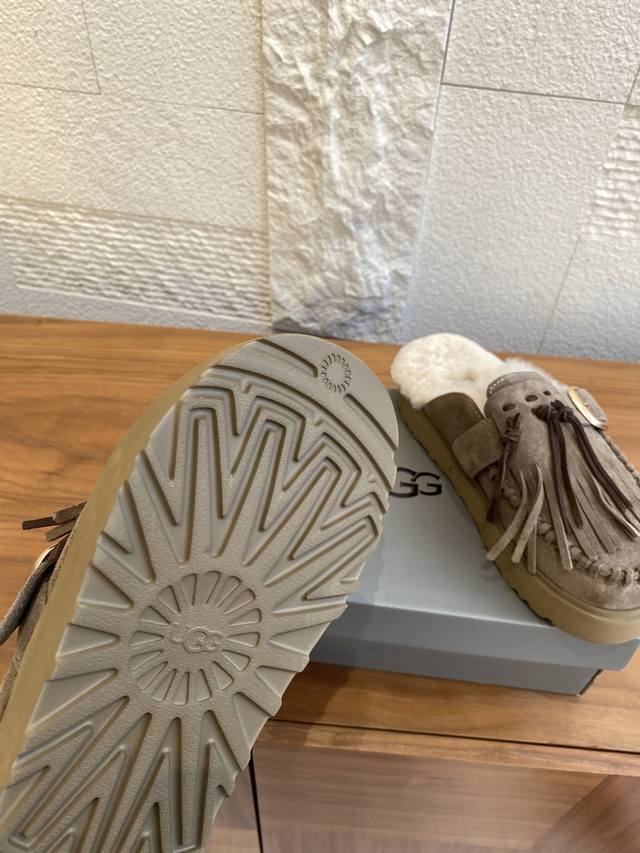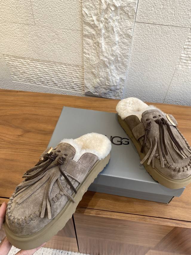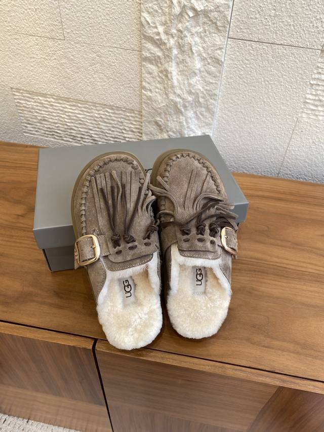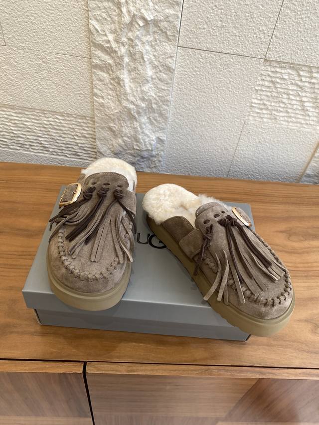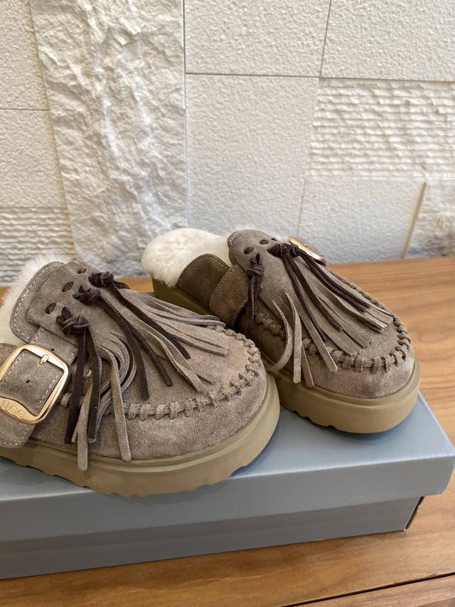 Ugg's new furry slippers feature ethnic-style tassel buckle straps, retro yet fashionable, super comfortable slip-on style, worn by many celebrities. Their popularity on Instagram and Xiaohongshu speaks for itself; they sell out as soon as the season starts! Made with thick, high-quality leather and fur! Unlike classic snow boots, these slippers are more of a half-slip-on style, easy to put on and take off, making them a favorite among lazy people. Material: Original custom imported top-grain cowhide. Lining: Original custom warm wool. Outsole: Original molded ultra-light EVA foam outsole. Size: 35-40. Size 40 is custom-made and non-refundable.