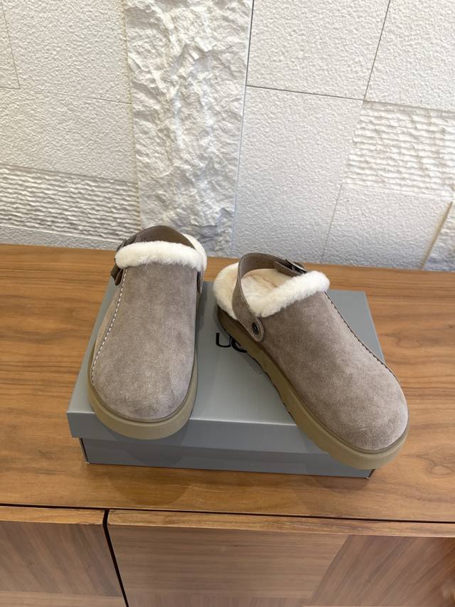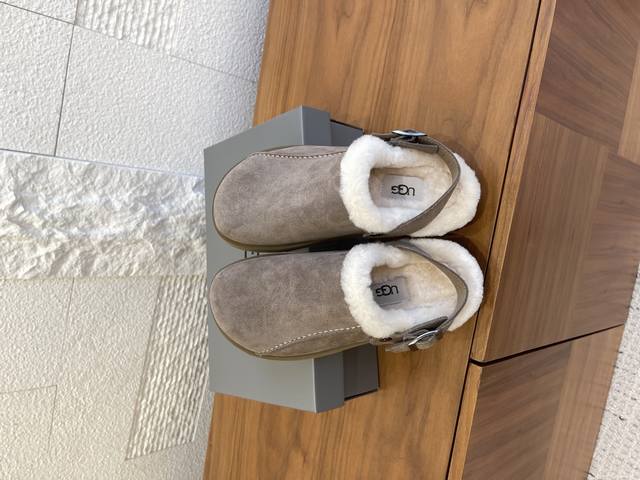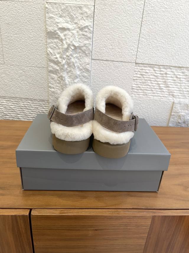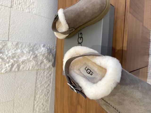 Ugg thick-soled plush mules feature a suede upper and soft sheepskin lining for warmth and comfort! The adjustable metal buckle fits all foot shapes. The thick sole provides height and cushioning, ensuring comfort even after long periods of wear. The beige color is versatile, easily complementing both American retro and preppy styles in autumn and winter. Practical and fashionable, it's a must-have item for winter outings.