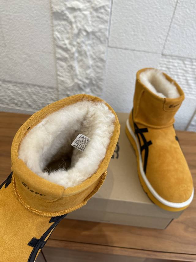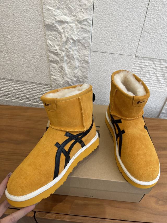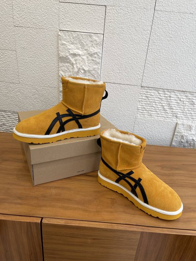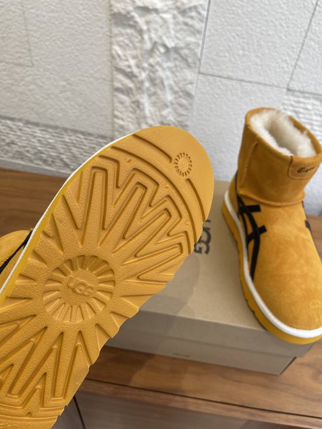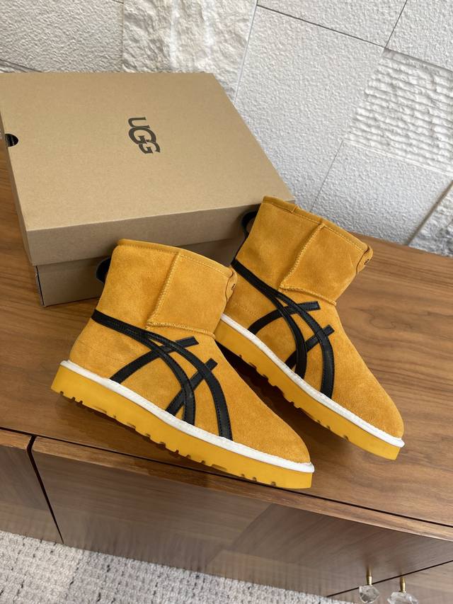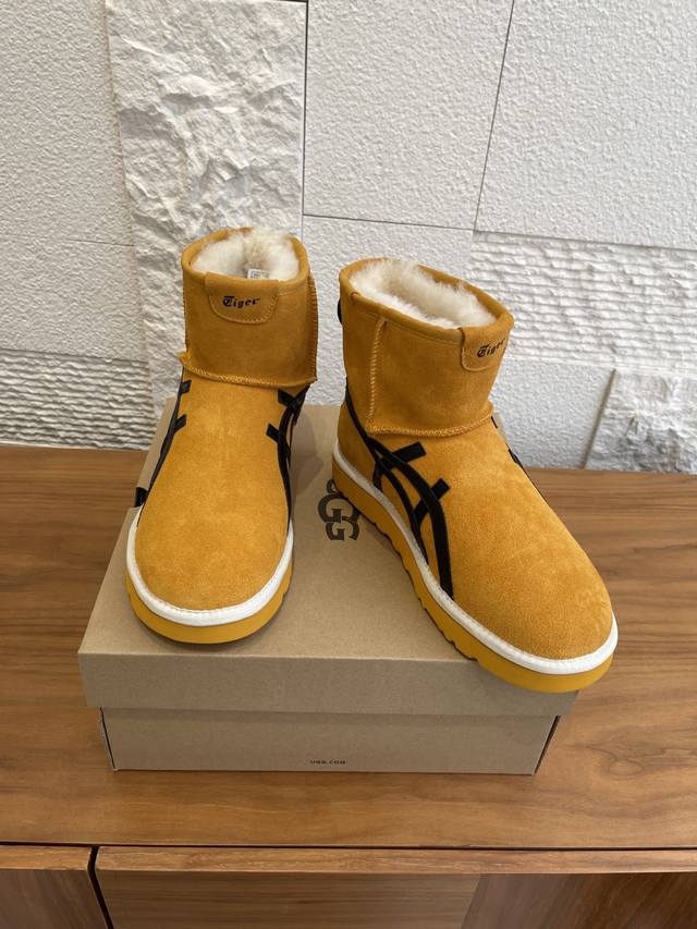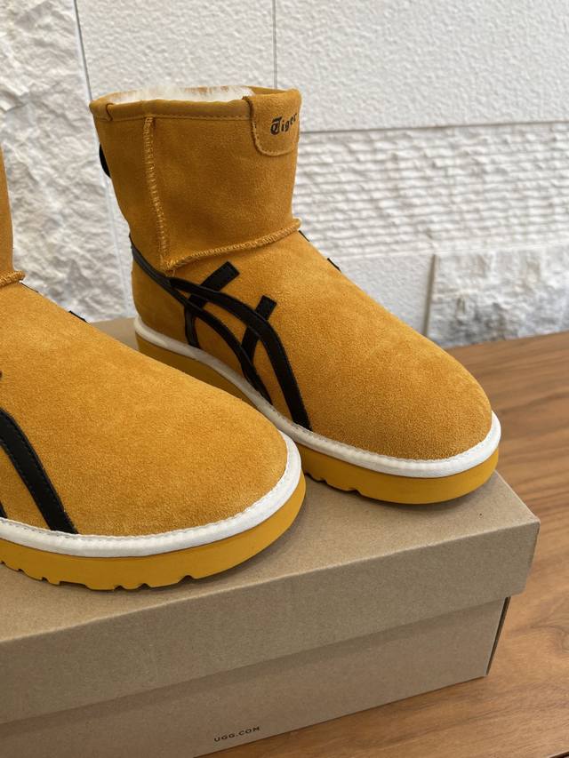Top Version: DDD Ugg X Onitsuka Tiger 2025 Fall/Winter Collaboration Snow Boots DDD This collaboration between Ugg and Onitsuka Tiger features yellow suede uppers with classic black tiger claw stripes, a retro yet trendy look. The thick Ugg sole provides excellent grip, comfort, and warmth. Super easy to slip on and off, combining style and functionality