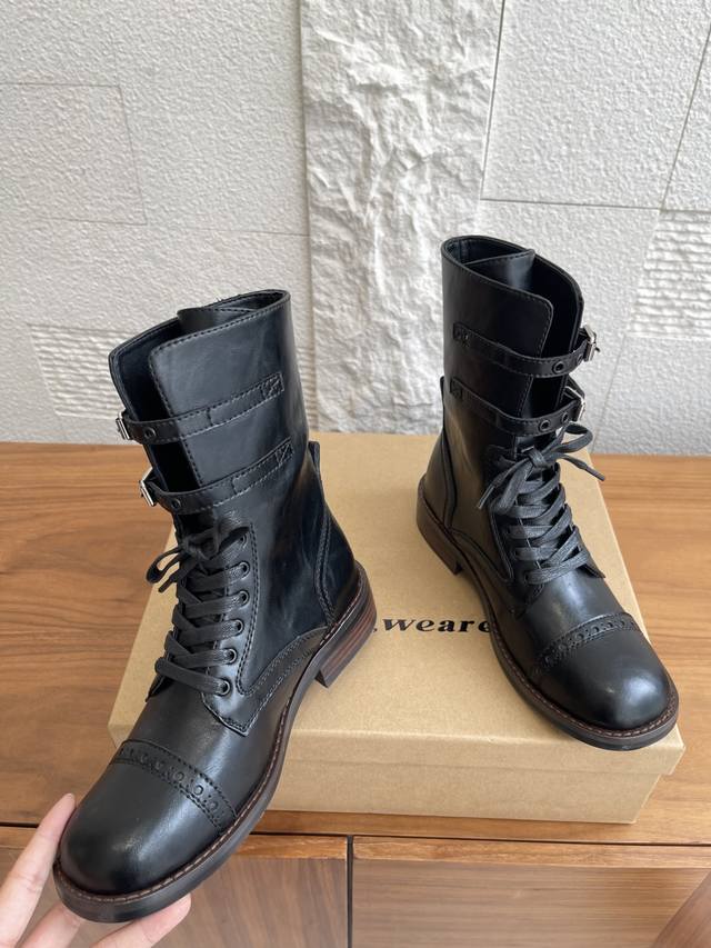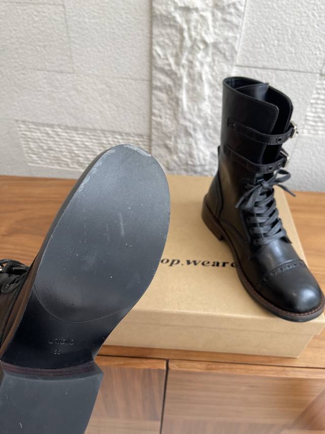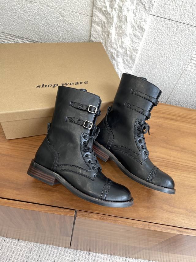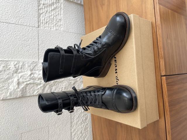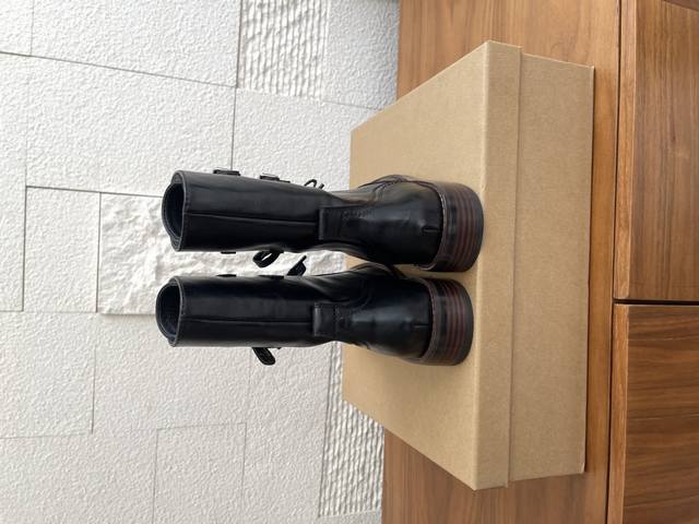 Ehoise lace-up buckle boots are based on the classic M1943 combat boot, characterized by its sturdy high-top design, leather upper, and rubber sole. After post-war modifications, it has remained popular. The Eloise design retains the classic high-top double buckle strap, softening the military ruggedness and incorporating retro and artistic elements. In addition to single-layer leather, the upper innovatively combines wool and leather, creating a layered effect with the soft materials, catering to the delicate aesthetics of women's wear. Hand-stitched leather welts reinforce the shoe shape, while the rubber sole retains its grip advantage while being lightweight. Classic elements of military boots are blended with the craftsmanship of handmade leather shoes. Paying homage to history with its retro silhouette, while the wool patchwork and sheepskin lining create an artistic atmosphere, the retro vintage style is suitable for everyday outings, allowing for a seamless transition between artistic retro and chic.