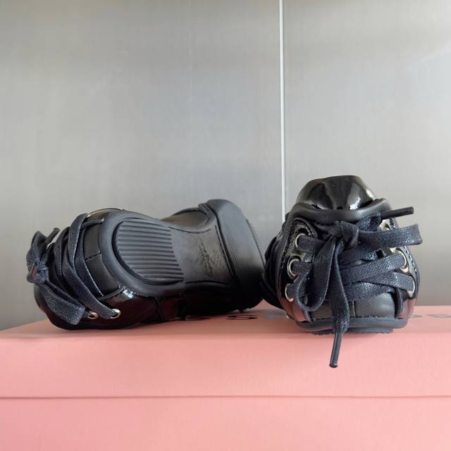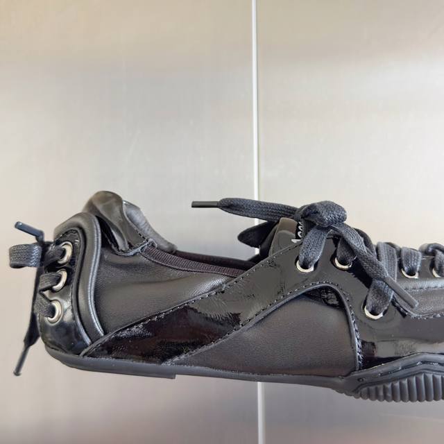 Original purchase, development and production The lace-up shoes reimagine the silhouette of ballet flats with denim-style finishes and decorative lace-ups at the rear The thick sole is made of rubber and leather