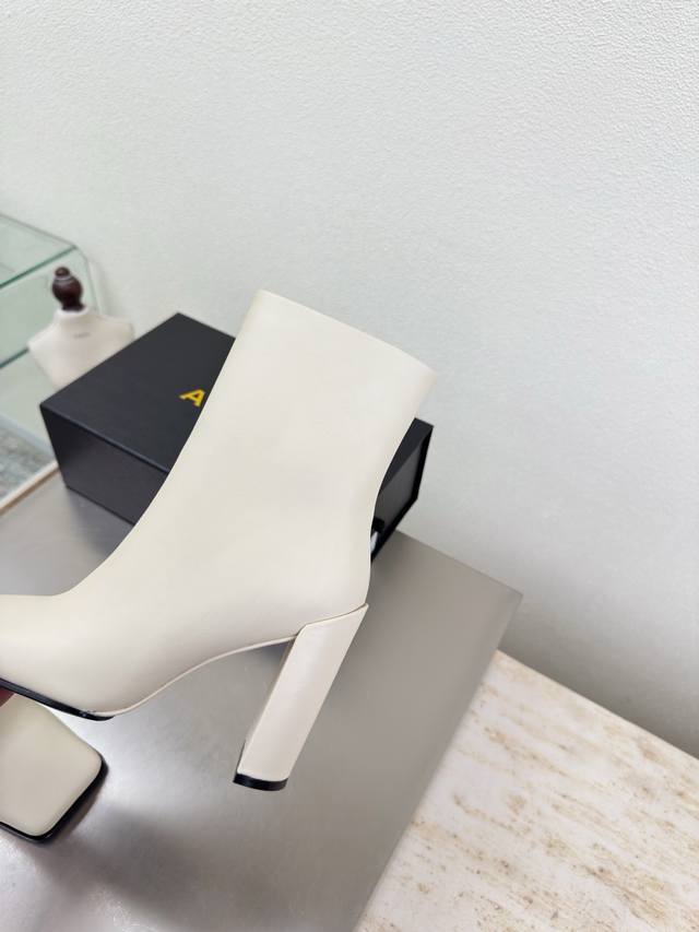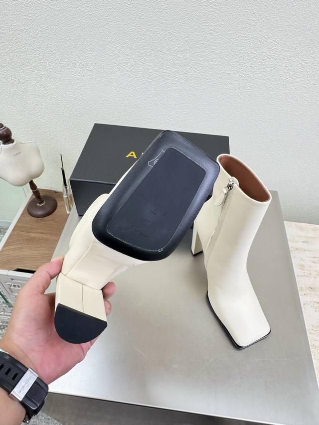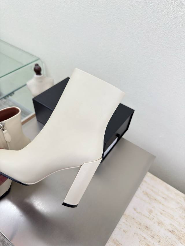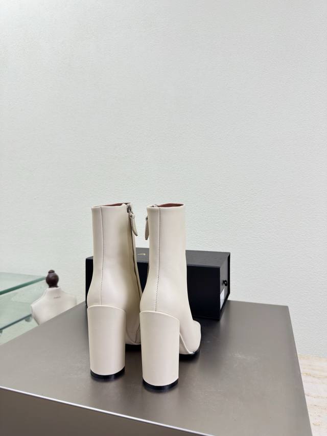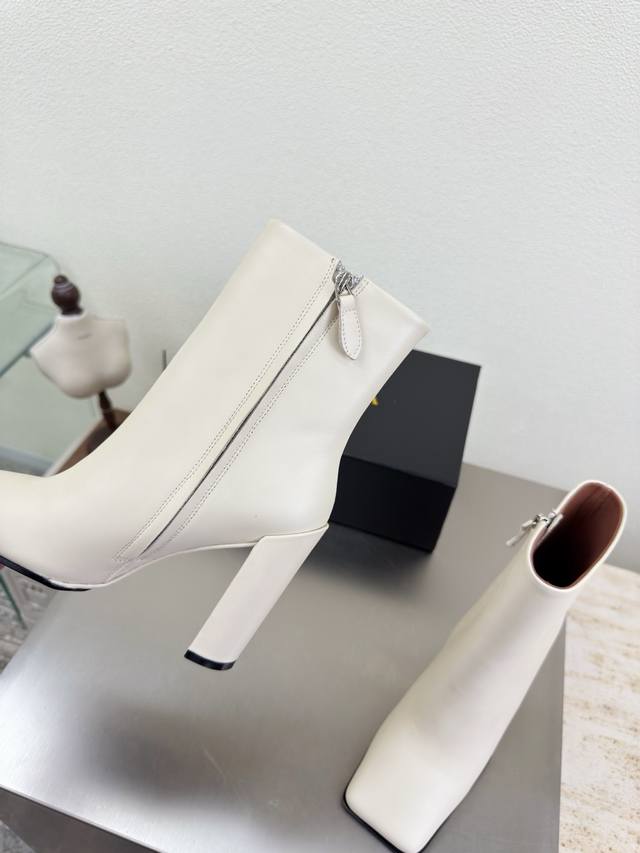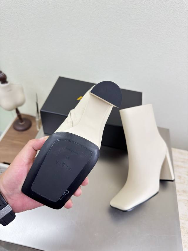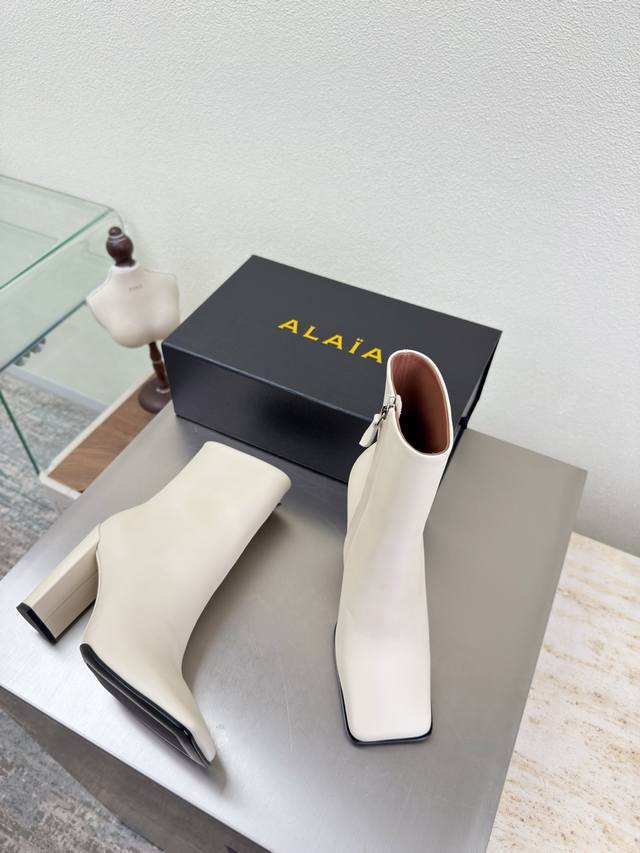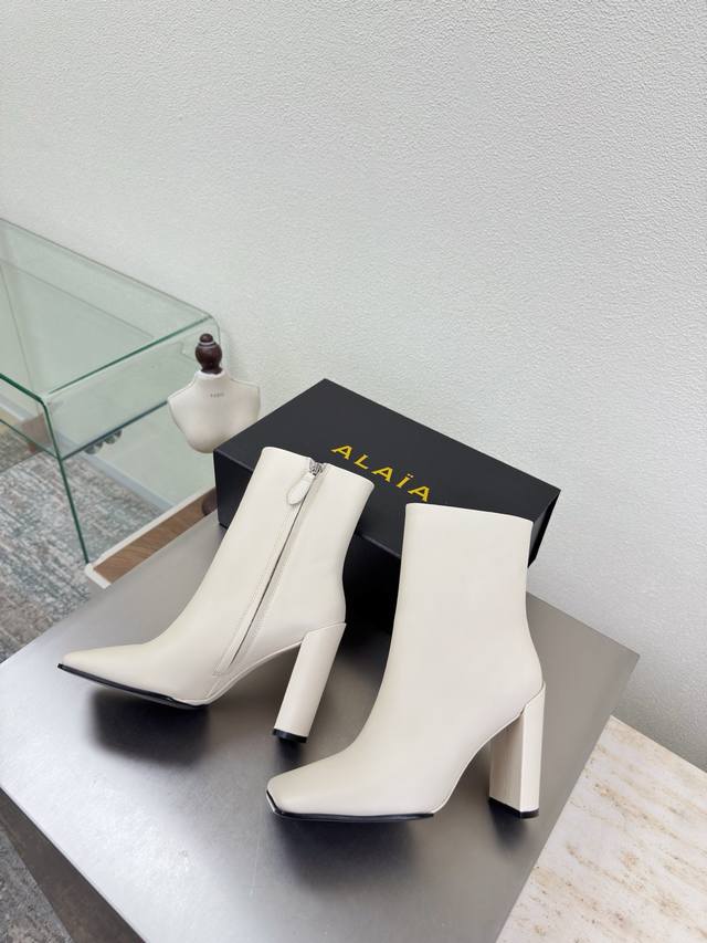 Top-grain cowhide inner zipper ankle boots, overlaid sole, square toe, 9cm high heel, slimming fit, Alaia boots, love at first sight from Paris, off-white top-grain cowhide, Alaia also has another sexy side, easily paired with different styles and looks, whether it's jeans, suit pants, or a pleated skirt, it can elevate your outfit to fashion, elegance, and excellence. Made with top-grain cowhide, sheepskin lining, genuine leather outsole (matching the original design). Available in sizes 34, 35, 36, 37, 38, 39, 40, 41. Comes with original packaging.