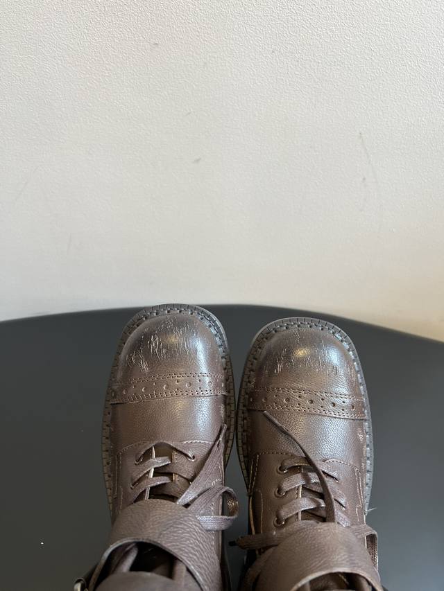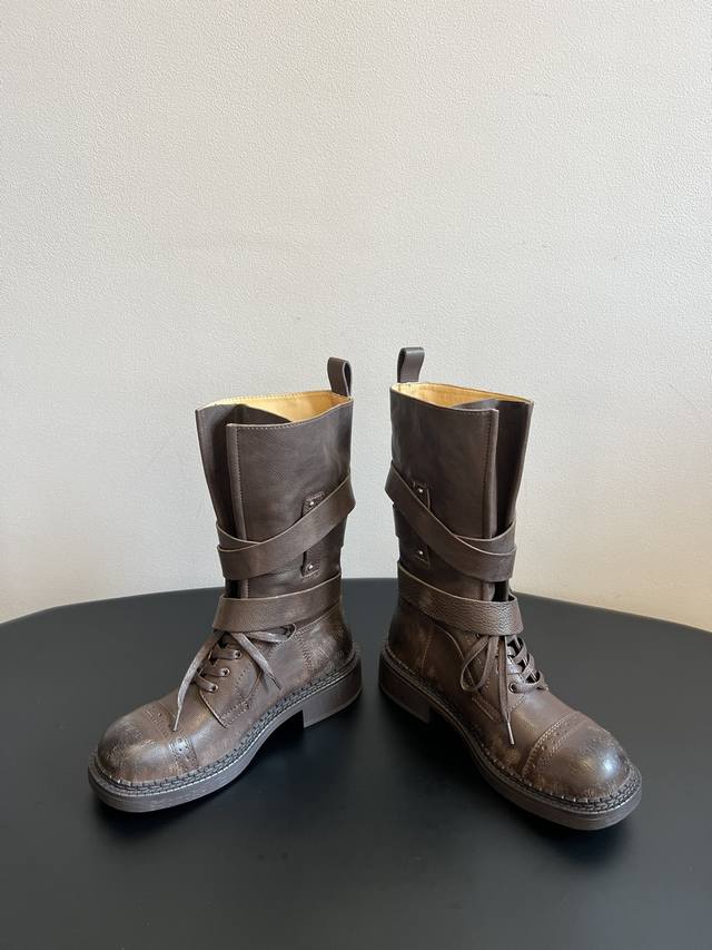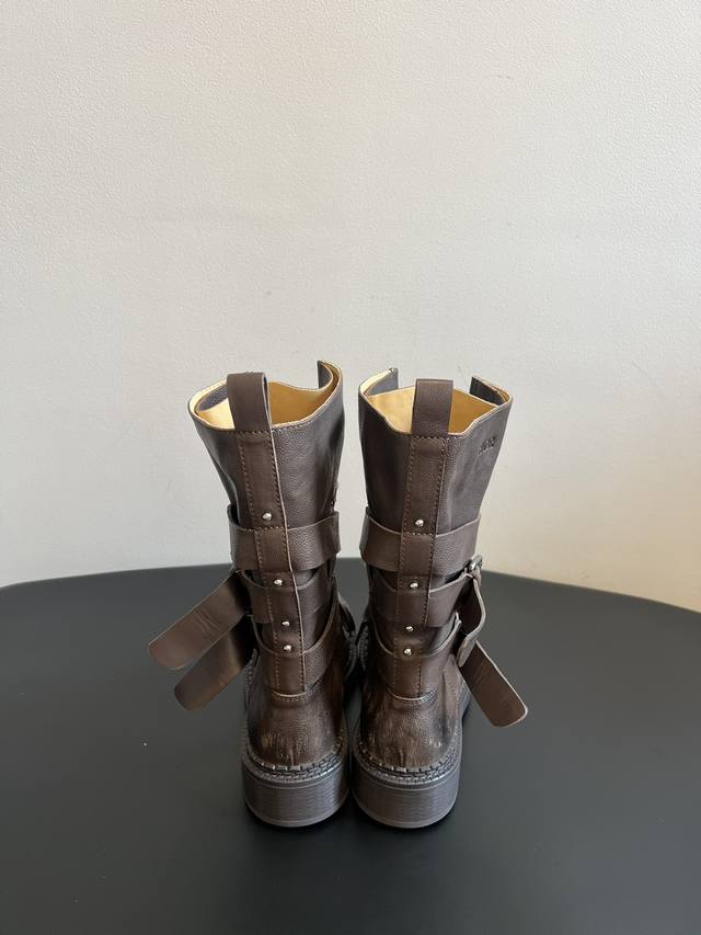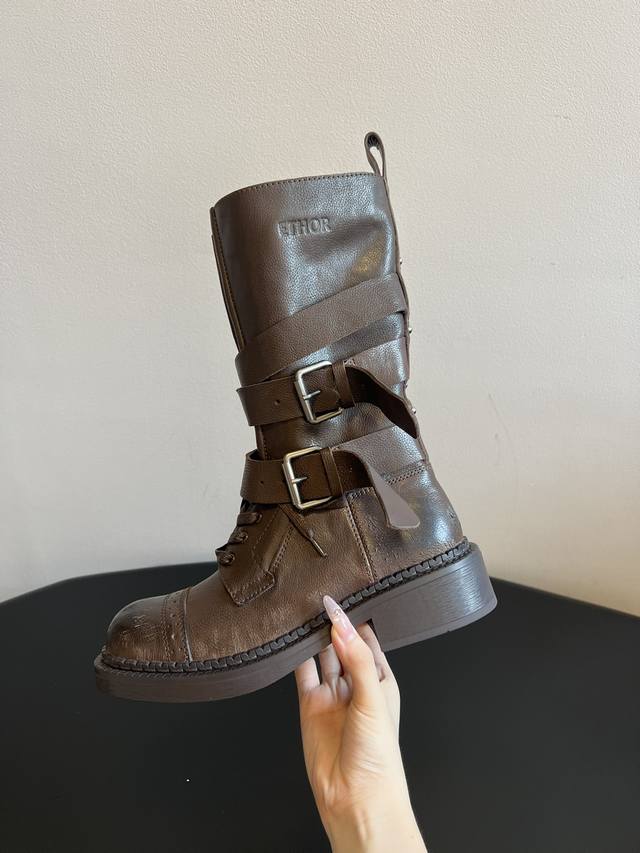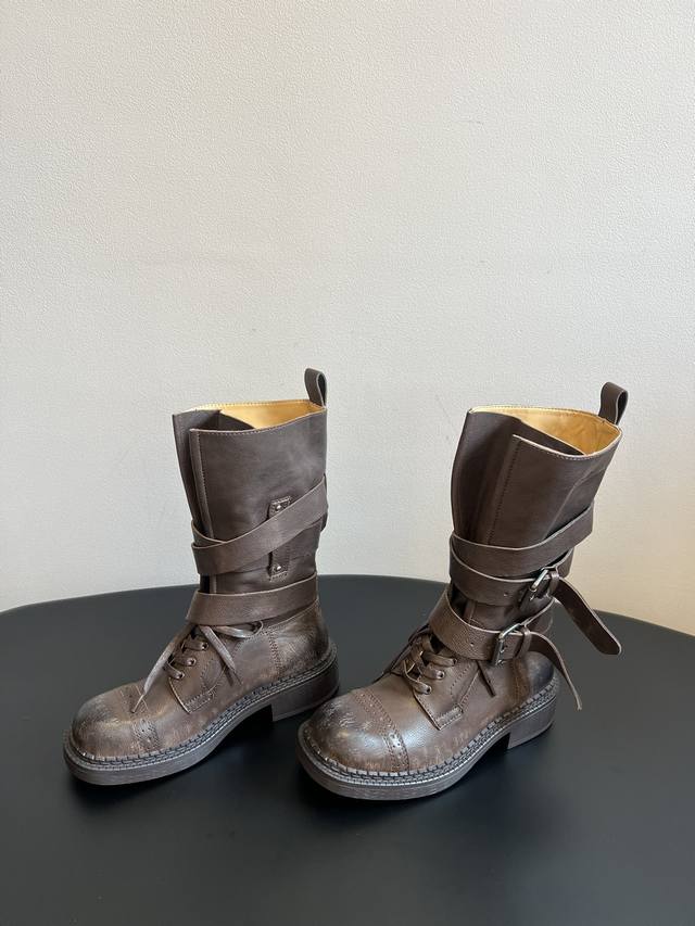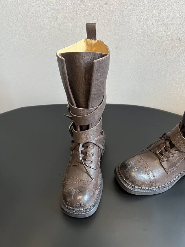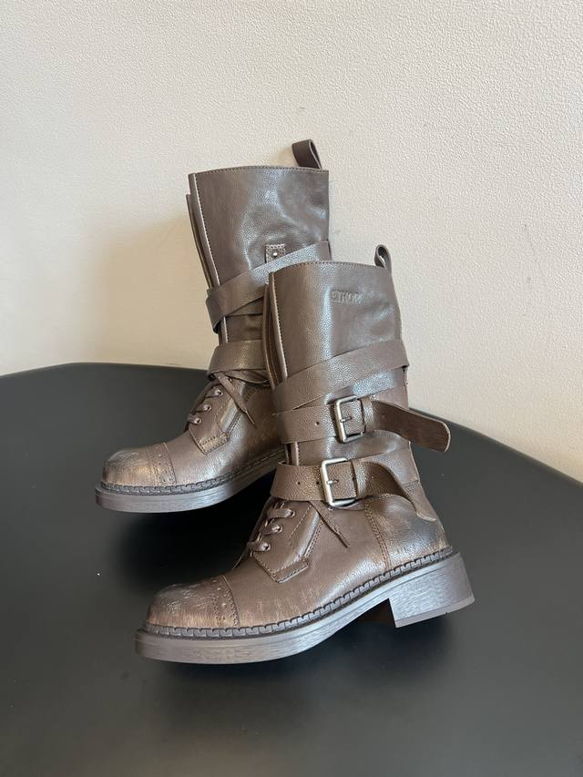 Ethor Spring/Summer Black and Brown Leather Buckle-Strip Motorcycle Boots, crafted from premium cowhide with a unique texture and rich feel. Irregular rubbing creates a battle-damaged effect, enhancing the wear and tear of time. Wide straps with metal fasteners enhance the silhouette and add an industrial touch. The irregular folded-over shaft and exaggerated tongue add a unique silhouette, creating a strong statement for a variety of styles.