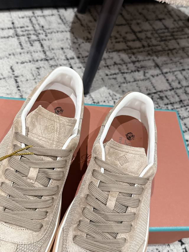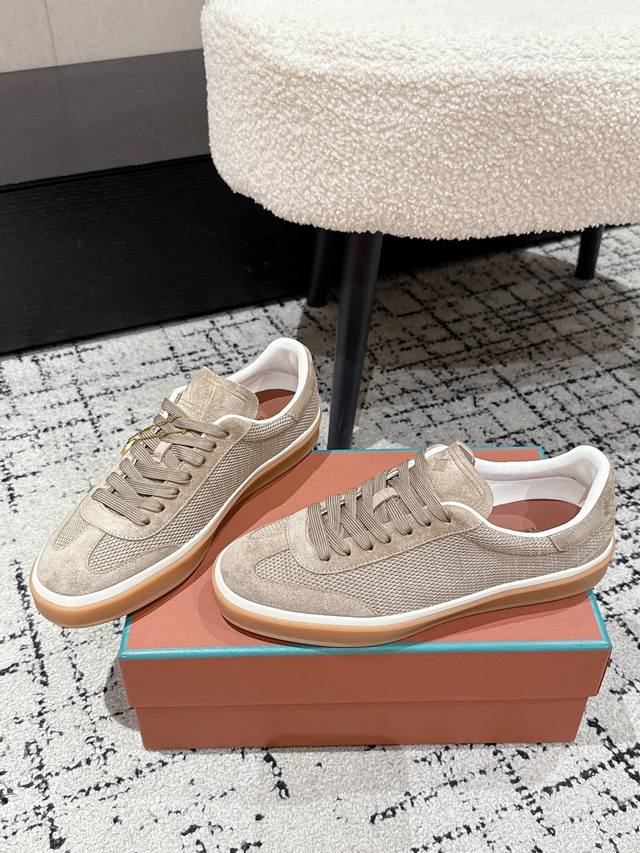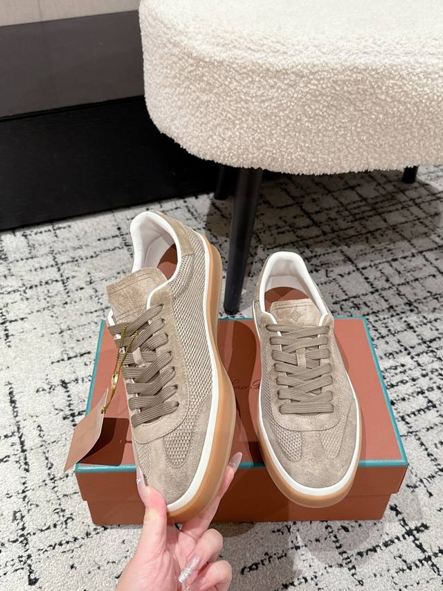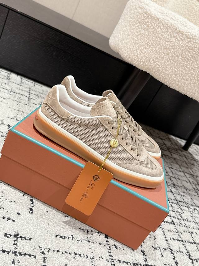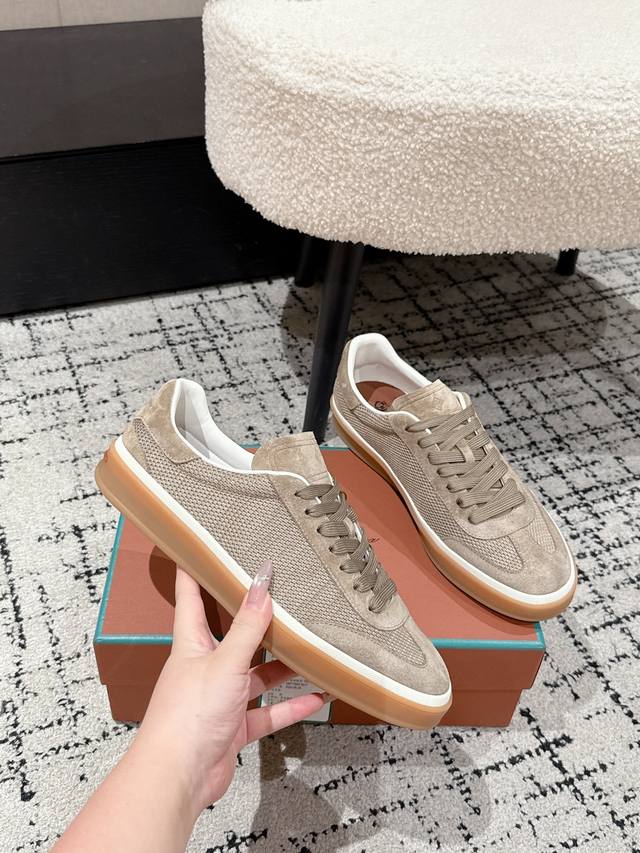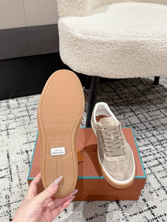 Top-tier couple's version Loro Piana 25 latest Tennis Walk series German training casual shoes. This new suede mesh shoe features an ultra-low-top design, suitable for year-round wear. The bound sole creates a relaxed and charming color combination, harmoniously blending functionality with understated style. An ideal footwear choice for urban attire. Features include a Kummel-colored inlay at the heel, a soft calfskin tongue, embossed logo, cotton laces, split suede upper, rubber lining, and calfskin. Comes with exquisite boutique packaging. Material: Original custom top-grain cowhide. Lining: Custom calfskin lining. Outsole: Original molded anti-slip rubber material. Sole thickness: 3cm. Size: 35-46 (Women's 40, Men's 45, 46). Custom orders are non-refundable.