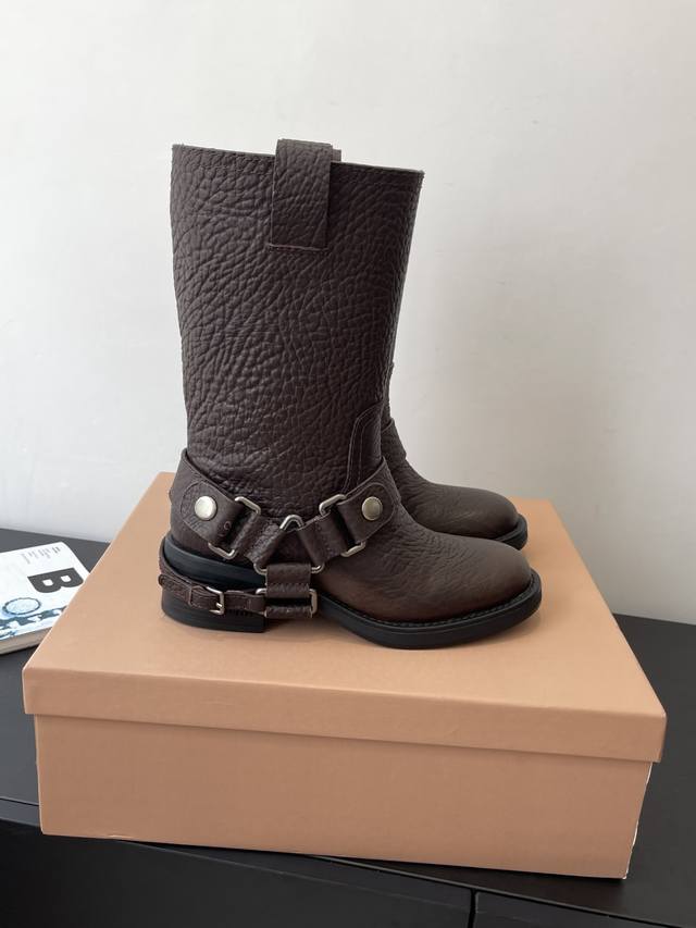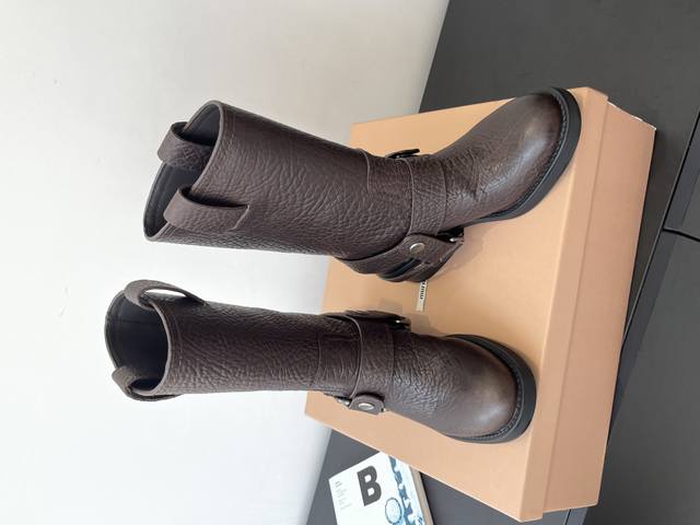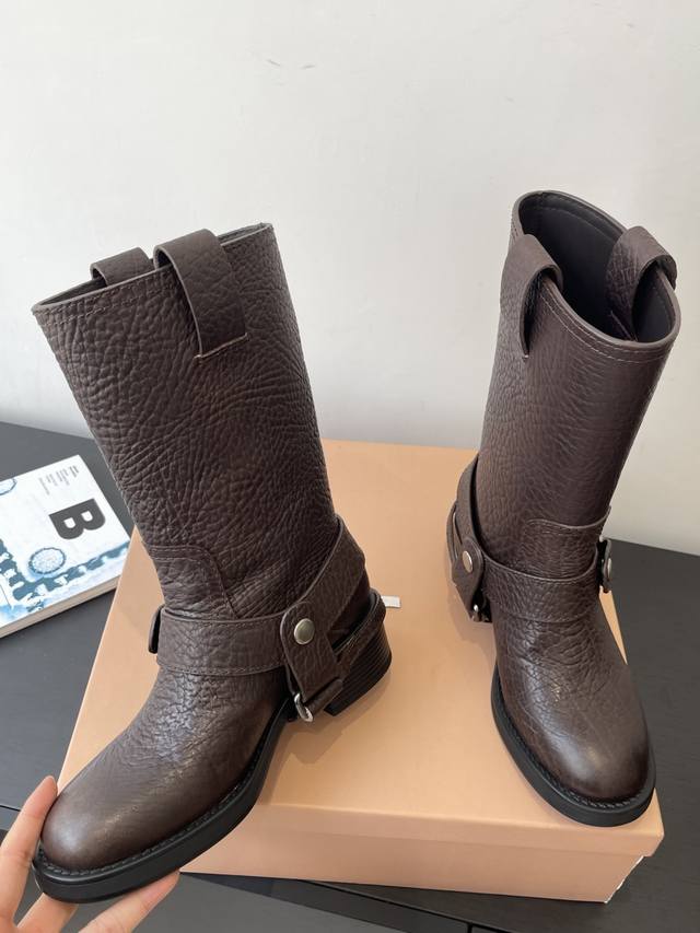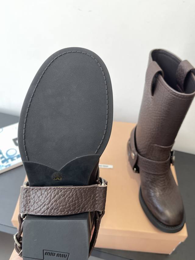 Top-tier factory version. Miu Miu 25Ss Fall/Winter New Heavy-duty Motorcycle Rider Boots. This year's must-have boots, bar none. Adorned by numerous internet celebrities and stars. Miu Miu's Fall/Winter collection is undeniably cool and sexy. Limited edition, extremely hard to find in stores. Looks stiff, but actually very soft and comfortable. Amazing feel on the feet. Wide boot shaft, suitable for both thick and thin legs, providing a relaxed fit and making legs appear straight. Made with elephant leather upper, cowhide lining, original mold, and rubber sole. Sizes: 35-40. Size 40 is custom-made and non-refundable.