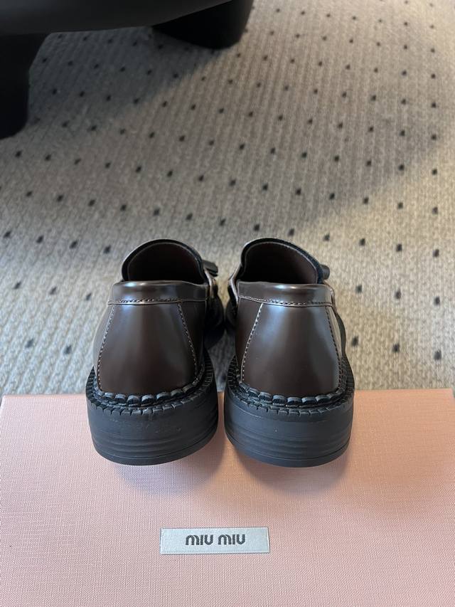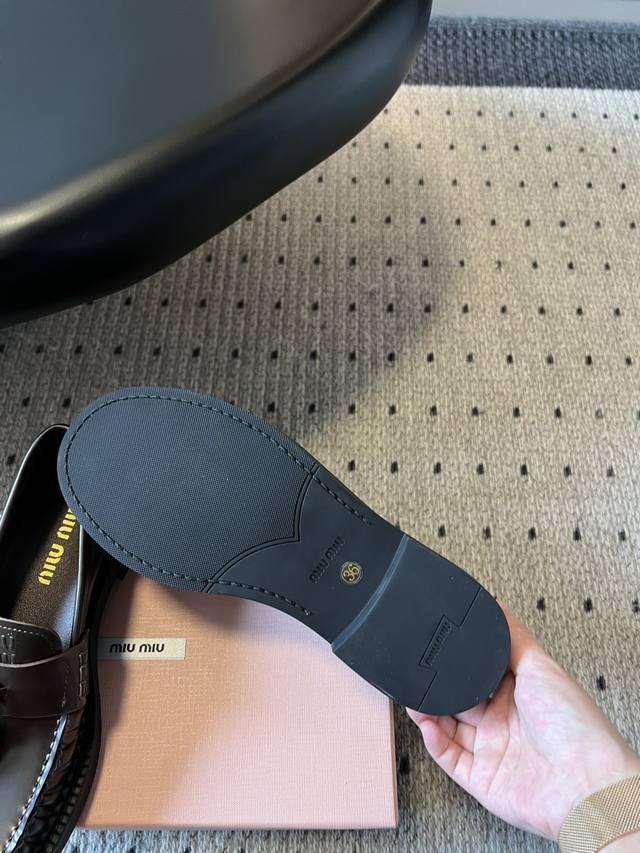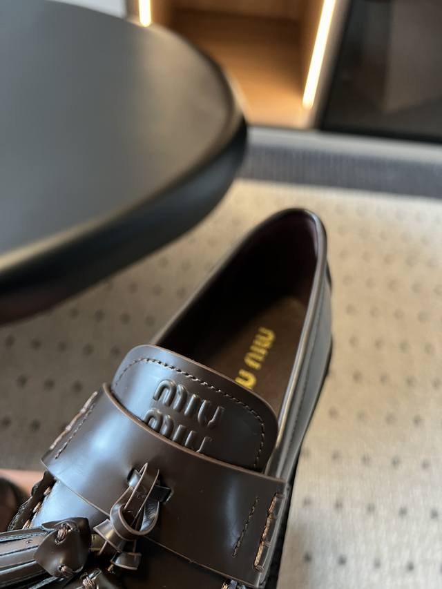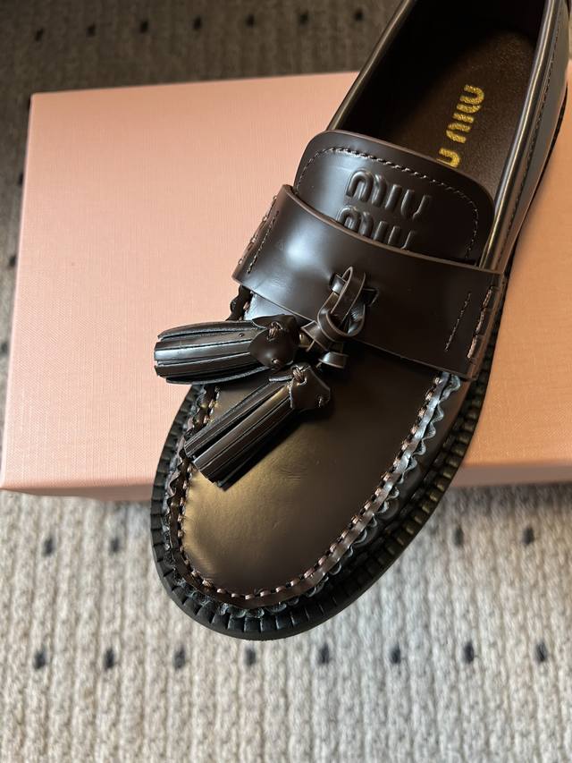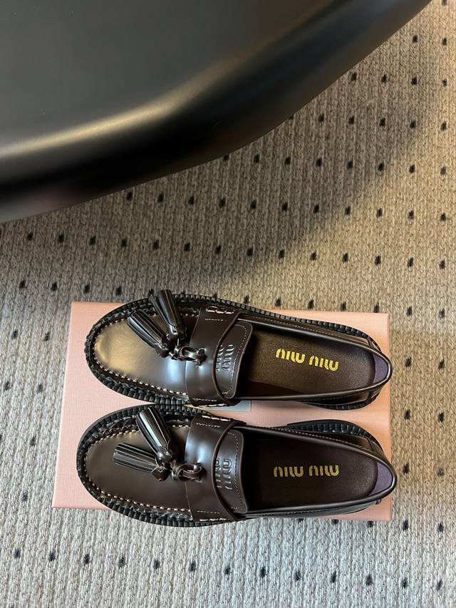 Top-tier Miu Miu 25Fw New Heather Color Tassel Loafers DDD These new loafers are so comfortable! This winter, you need a pair of retro-style shoes to add a touch of style. The 3.5cm heel height is just right, the color is sophisticated and versatile, the style is playful and fashionable, and they're comfortable and slimming on the feet DDD Loafers: The soul of preppy style! A white pleated skirt balances the heaviness of a sweatshirt, and the tassel details on the loafers echo the hat, creating a perfect balance of sweet and cool~ DDD Material: Open-label cowhide DDD Lining: Sheepskin DDD Outsole: Original molded outsole DDD Size: 35-40, 40 custom DDD