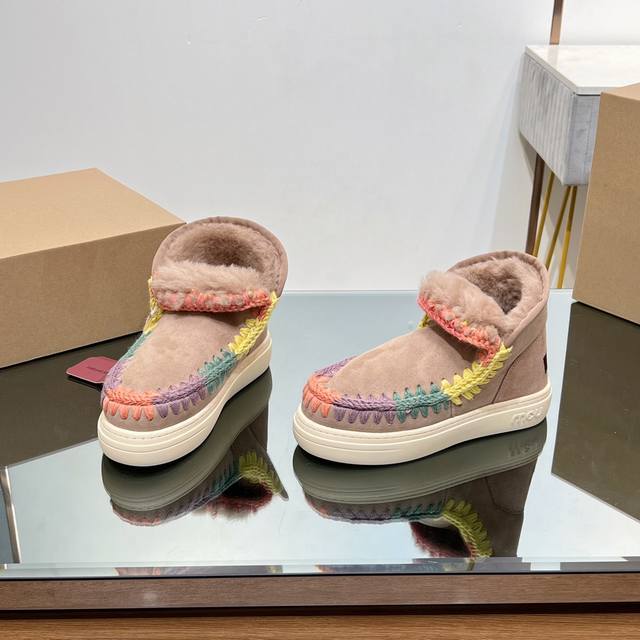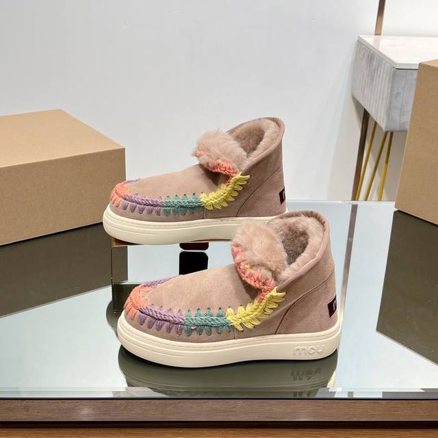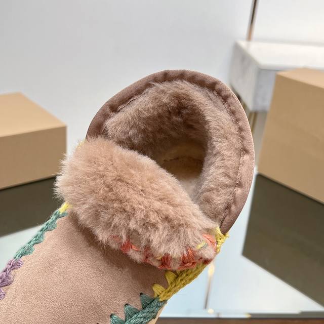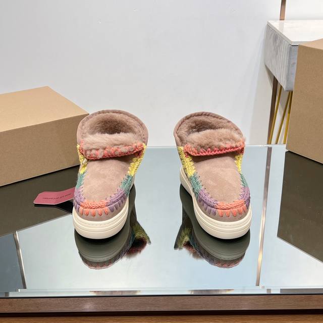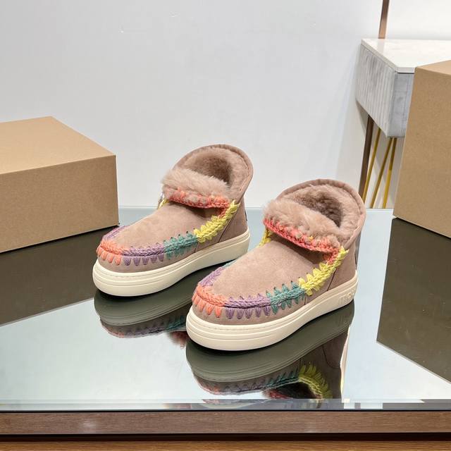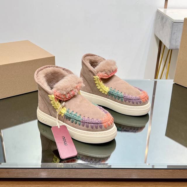 Top-tier Mou series available. Mou Autumn/Winter New Snow Boots, Thickened and Warm with Sheepskin and Fur. Recognize our attention to detail and quality; original custom-made, perfect details, A-grade sheepskin and fur. Mou girls' style: trendy and cool street casual look with snow boots. Lately, the morning and evening breezes are still a bit chilly. Try a pair of simple yet comfortable sheepskin and fur shoes. A harmonious pairing with a sweatshirt. Effortlessly create a street casual look. Exquisite hand-crocheted floral patterns enhance the overall sophistication. Suitable for everyday wear without being over the top. Want to dress simply and comfortably? Low-saturation colors look comfortable and high-end. The overall look is casual and relaxed. Heavy-duty ethnic-style hand-quilted edges!