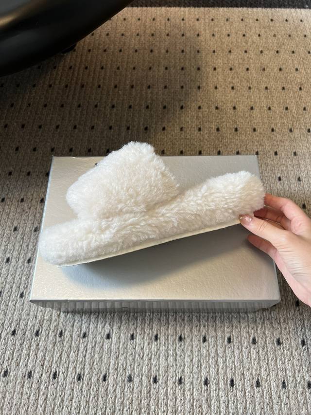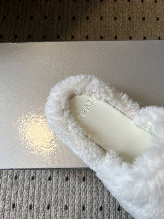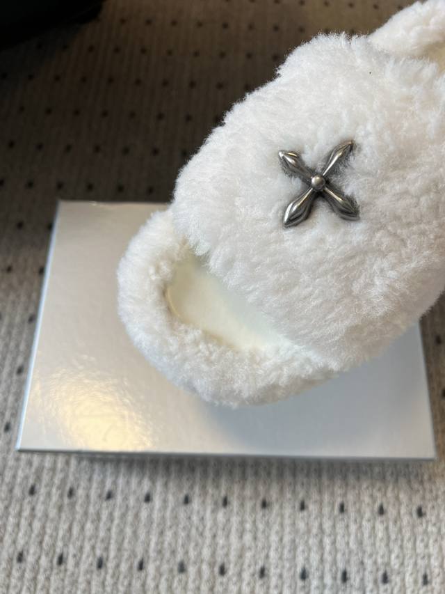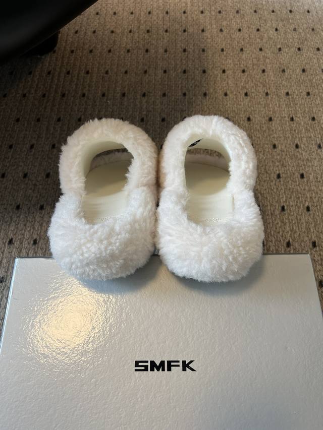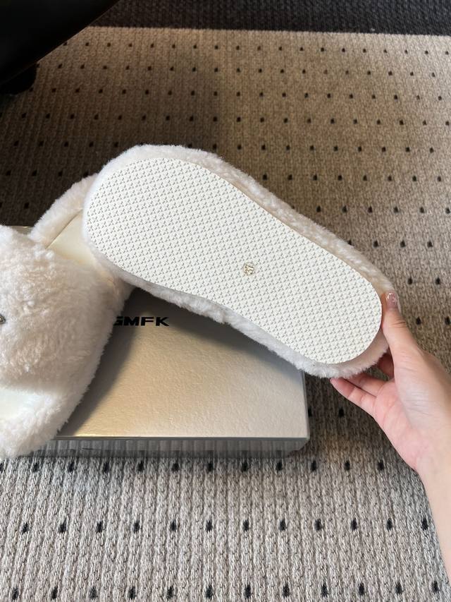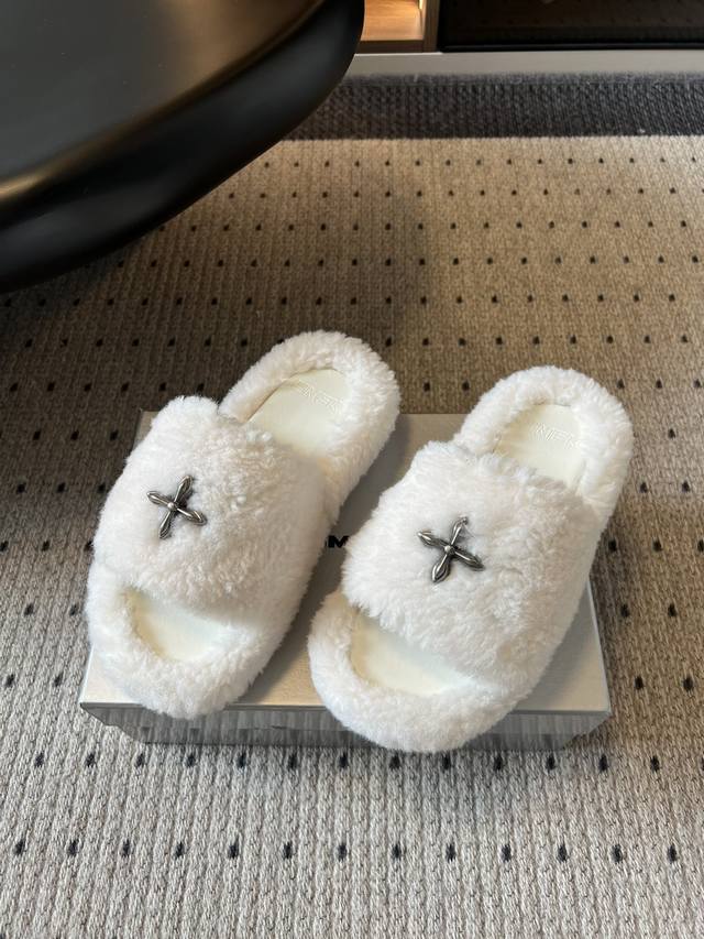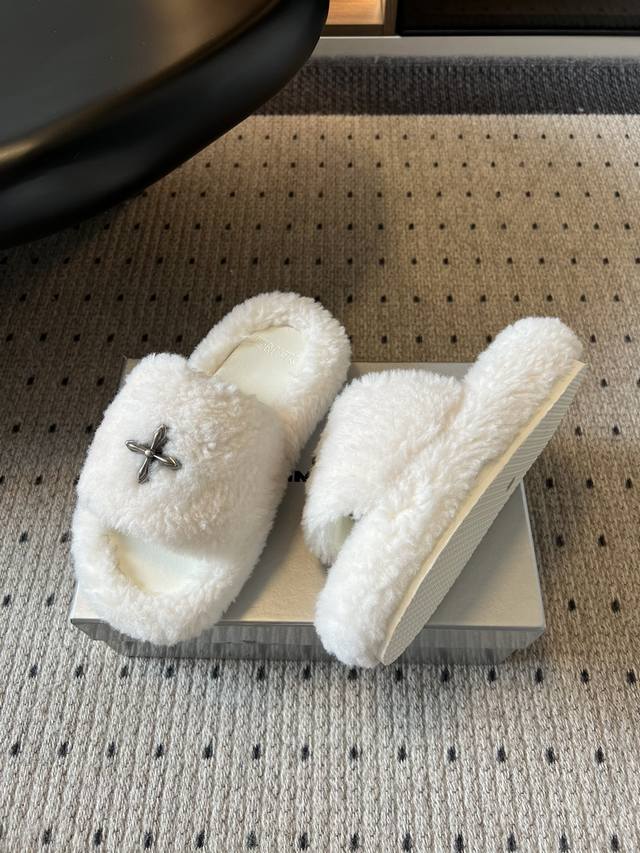 Top-tier Smfk 25Ss platform plush open-toe slippers. Made of faux lamb's wool, these slippers are soft, fluffy, and warm. A metal cross decoration on the upper adds a touch of design and sophistication. These open-toe slippers offer a casual and relaxed style, while the metal embellishments add a touch of sweet coolness, making them a versatile fashion item suitable for both lounging at home and going out. Pair them with matching plush pajamas or loose grey loungewear for a comfortable and stylish look at home. Alternatively, choose black denim shorts and a black fitted top, layered with an oversized grey sweatshirt and black slippers for a casual yet cool street style. Material: Wool; Lining: Fabric; Outsole: Rubber combination; Size: 35-40 (40 sizes are custom-made and non-refundable).