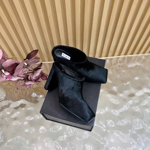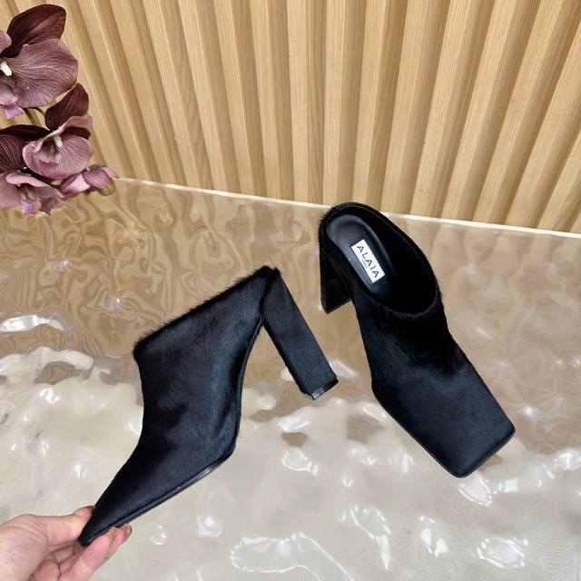 Alaia minimalist chic square-toe pony hair high-heeled sandals, neat, sophisticated, and elegant
