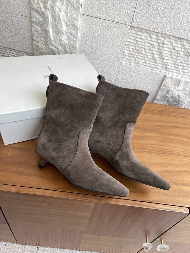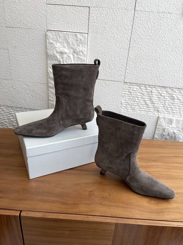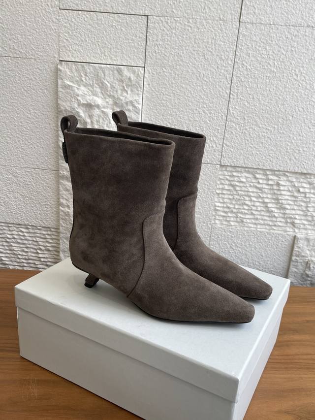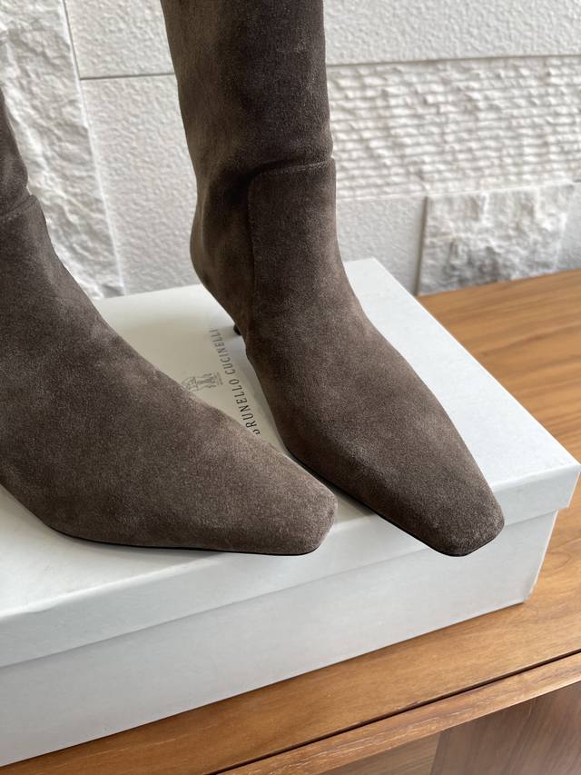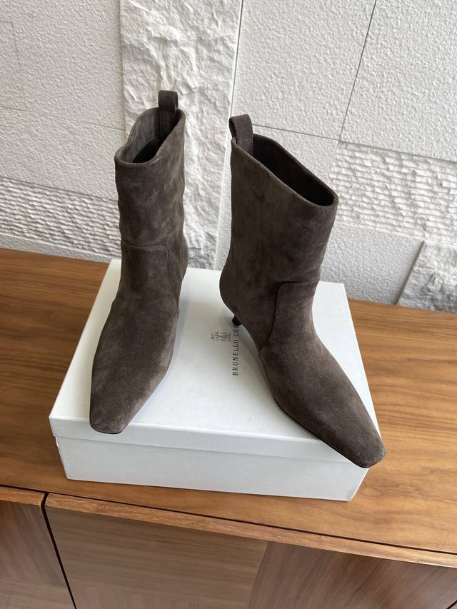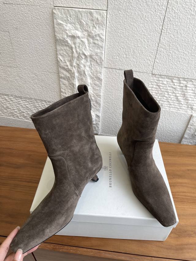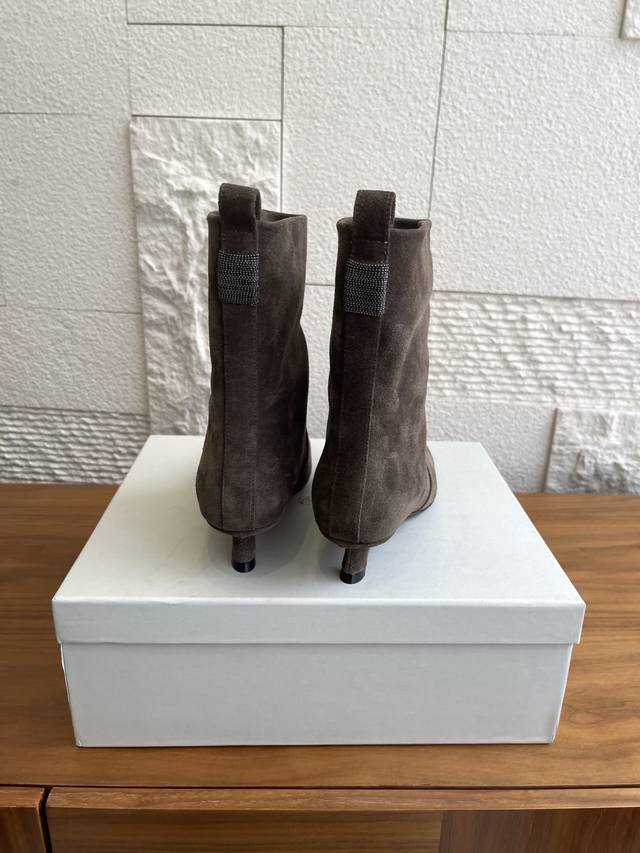 Top-tier version: Brunello Cucinelli 2025 Autumn/Winter new square-toe stiletto heeled beaded ankle boots. Exquisite materials and fine details create an urban style for these suede boots. The simple short silhouette cleverly elongates the leg line, while the asymmetrical heel adds a modern touch. The suede leather exudes a subtle, hazy sheen, and the double-ring buckle at the back is adorned with Brunello Cucinelli's signature sparkling beaded embroidery, adding a touch of romance to the overall look. Material: Original custom-made imported premium high-gloss suede calfskin. Lining: Imported cowhide. Outsole: Italian imported genuine leather outsole + TPU rubber injection molding. Heel height: 3.5cm. Size: 35-42. 41 and 42 are custom-made and non-refundable.