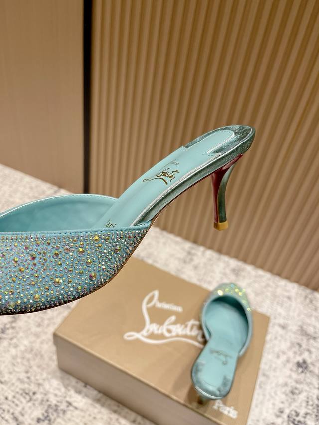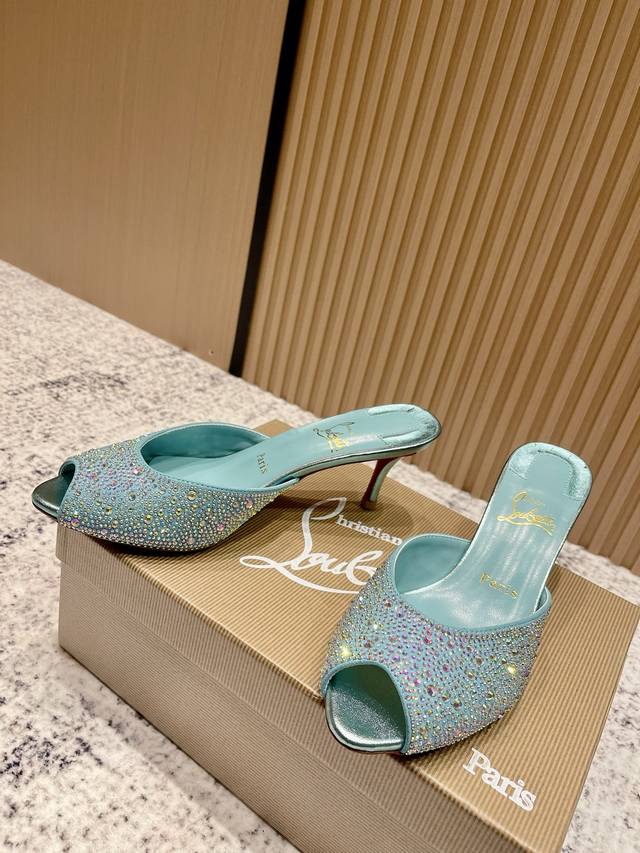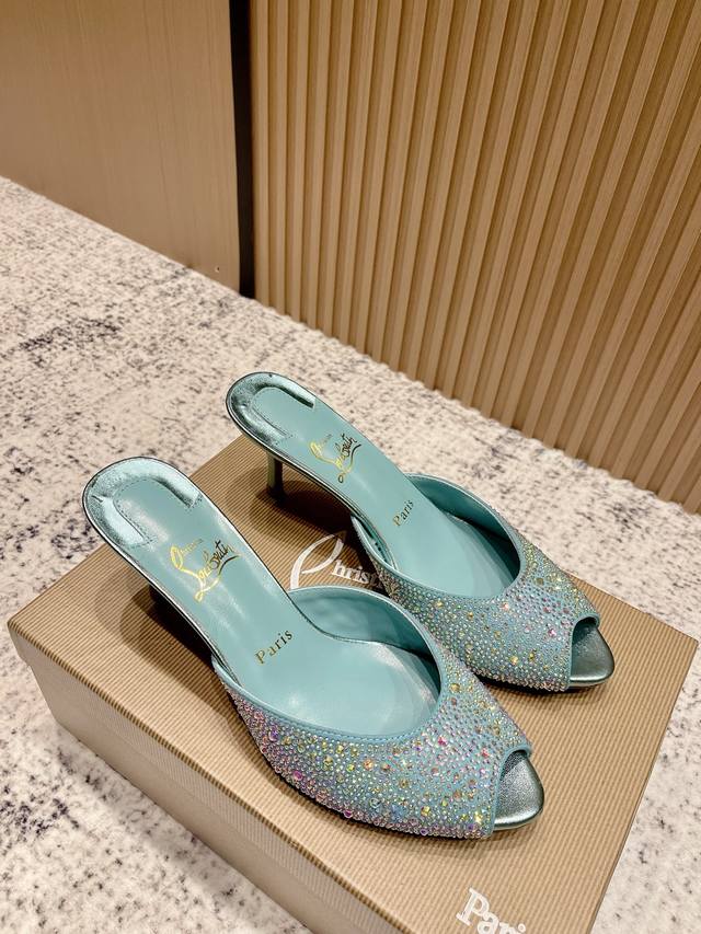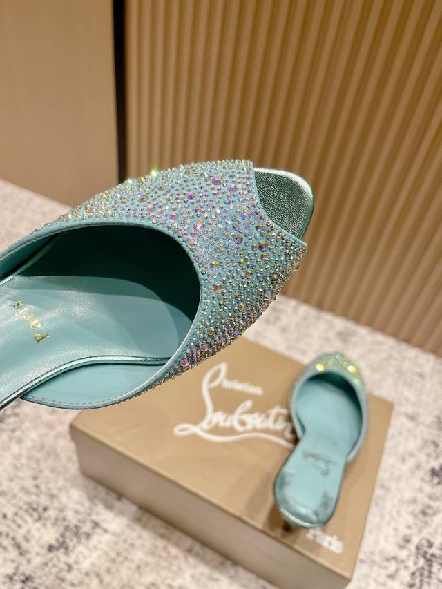Top-tier version: Christian Louboutin 2025S original replica, heavy-duty craftsmanship, classic full-diamond peep-toe high-heeled mules. Upper: Over two thousand super-sparkling rhinestones adorn the upper, with a peep-toe design that's playful yet sexy, both sophisticated and versatile. Material: Swarovski crystals. Lining: Grained pearlescent sheepskin lining. Outsole: Imported lacquered genuine leather outsole. Size: 34-43 (34, 40, 41, 42, 43 are custom-made and non-refundable). Heel height: Approx. 5.5cm, 5, 8, 10cm optional.