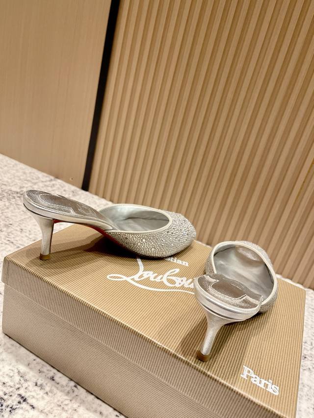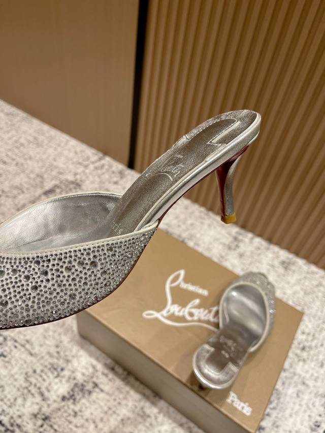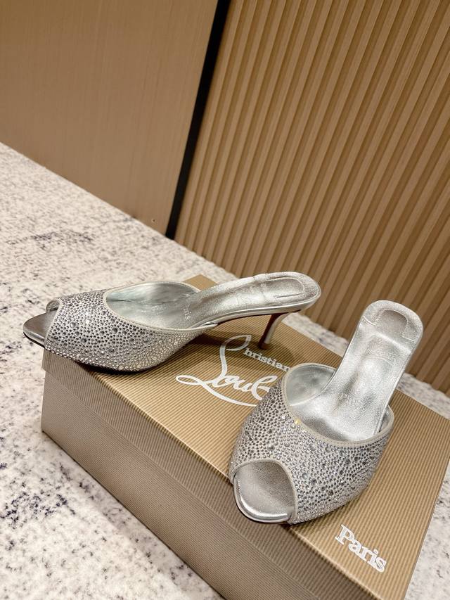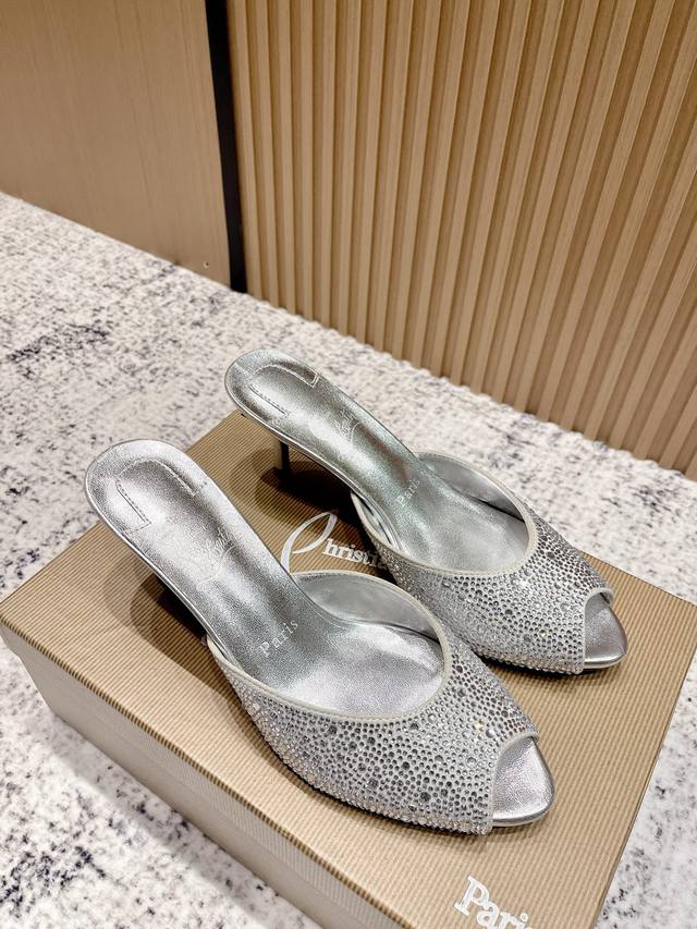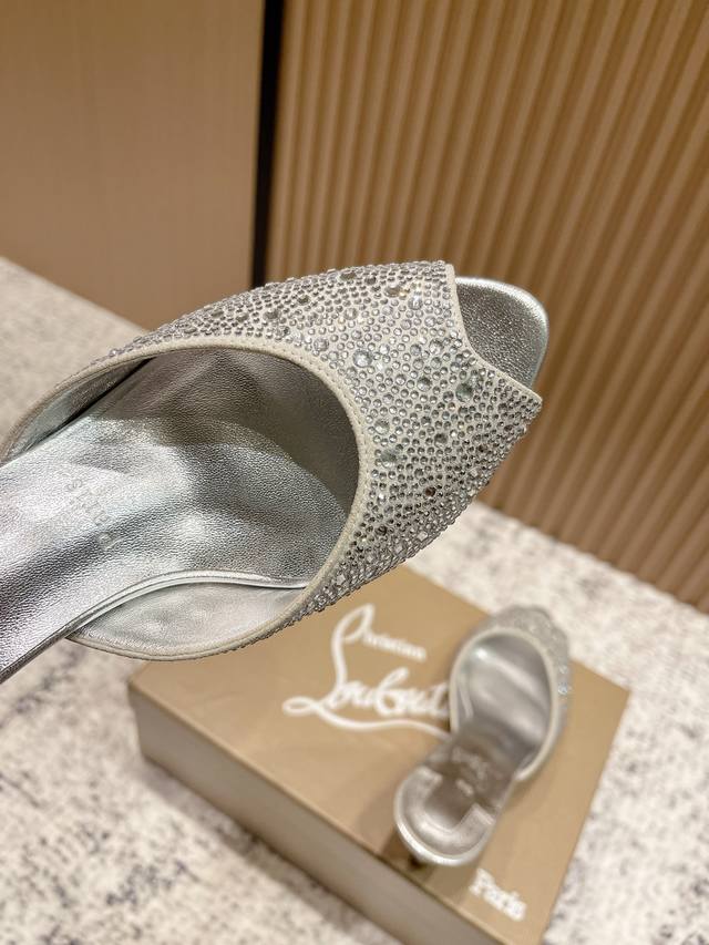 Top-tier version: Christian Louboutin 2025S original replica, heavy-duty craftsmanship, classic full-diamond peep-toe high-heeled mules. Upper: Over two thousand super-sparkling rhinestones adorn the upper, with a peep-toe design that's playful yet sexy, both sophisticated and versatile. Material: Swarovski crystals. Lining: Grained pearlescent sheepskin lining. Outsole: Imported lacquered genuine leather outsole. Size: 34-43 (34, 40, 41, 42, 43 are custom-made and non-refundable). Heel height: Approx. 5.5cm, 5, 8, 10cm optional.