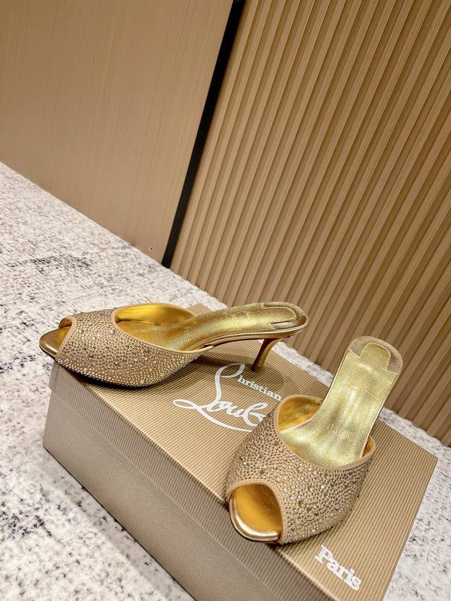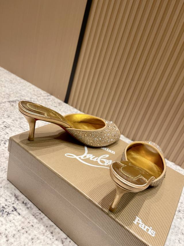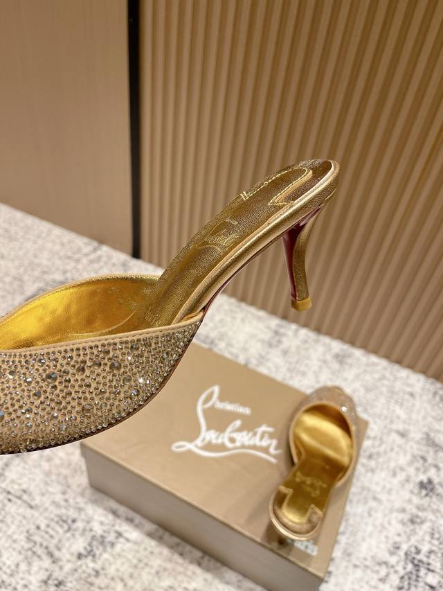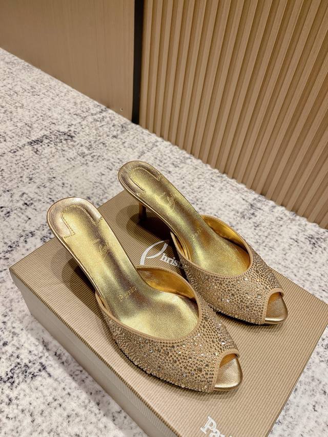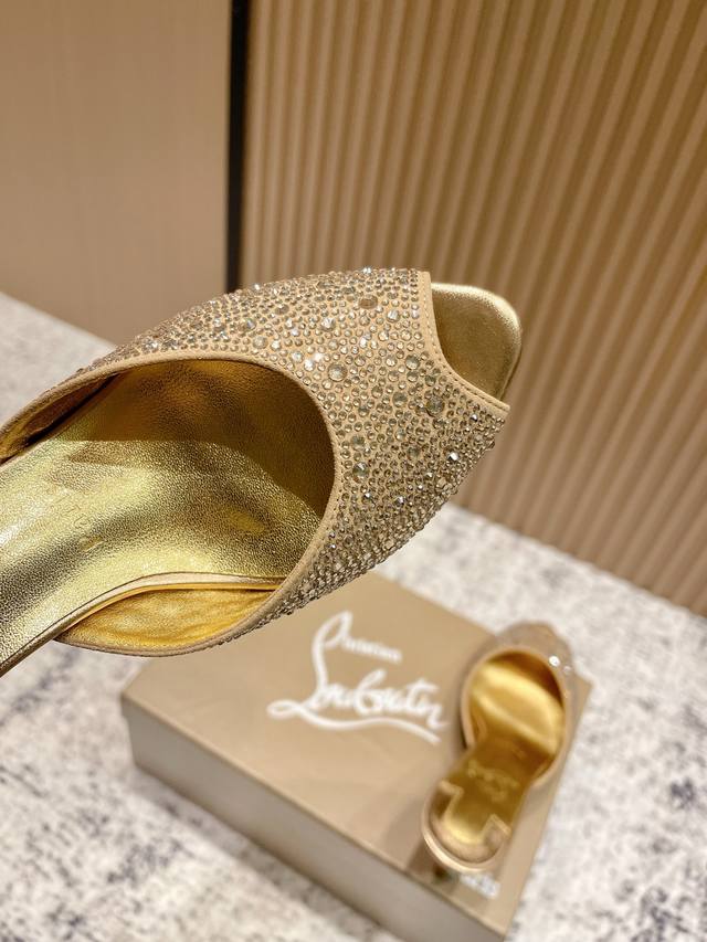 Top-tier version: Christian Louboutin 2025S original replica, heavy-duty craftsmanship, classic full-diamond peep-toe high-heeled mules. Upper: Over two thousand super-sparkling rhinestones adorn the upper, with a peep-toe design that's playful yet sexy, both sophisticated and versatile. Material: Swarovski crystals. Lining: Grained pearlescent sheepskin lining. Outsole: Imported lacquered genuine leather outsole. Size: 34-43 (34, 40, 41, 42, 43 are custom-made and non-refundable). Heel height: Approx. 5.5cm, 5, 8, 10cm optional.