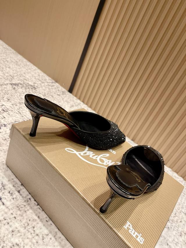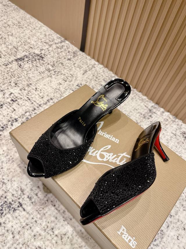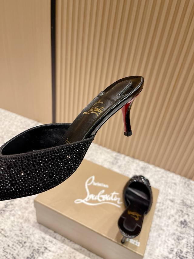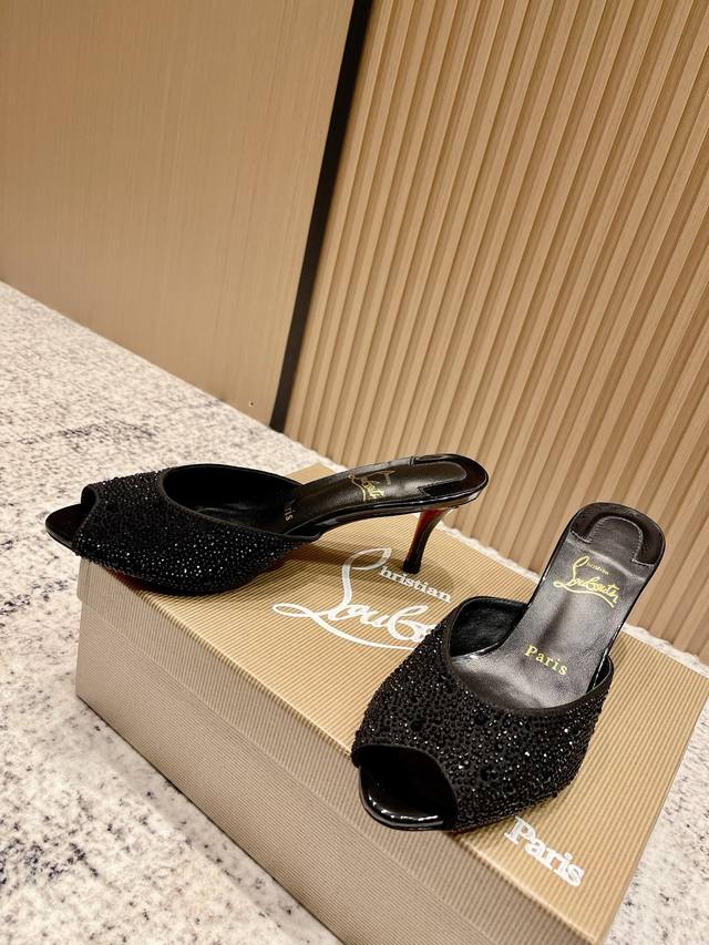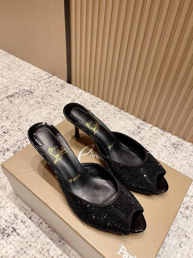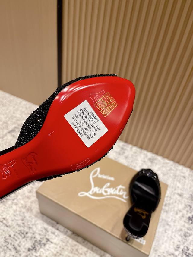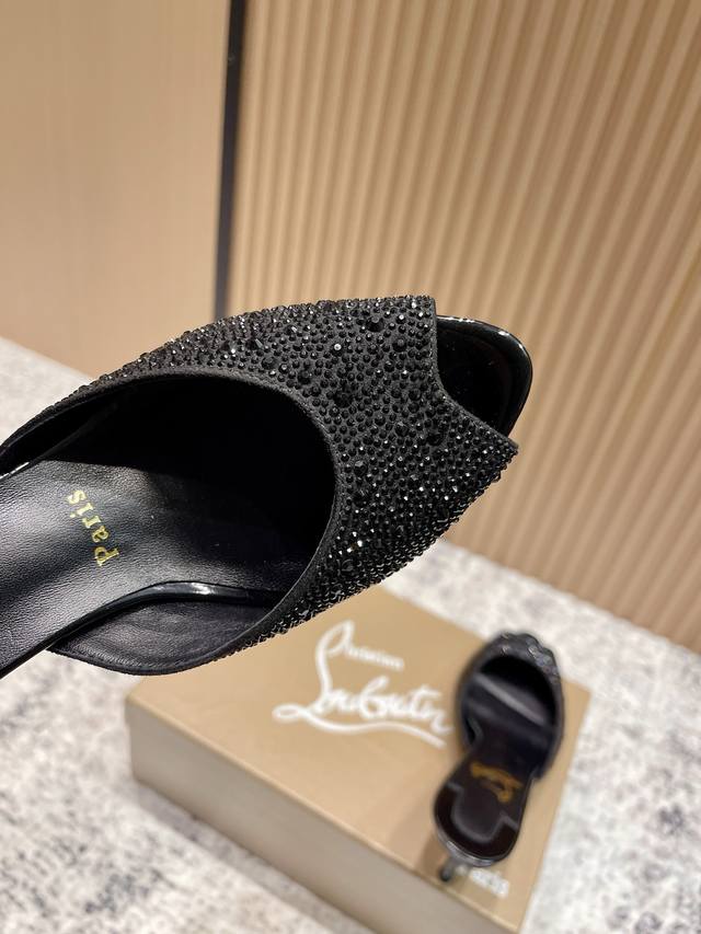 Top-tier version: Christian Louboutin 2025S original replica, heavy-duty craftsmanship, classic full-diamond peep-toe high-heeled mules. Upper: Over two thousand super-sparkling rhinestones adorn the upper, with a peep-toe design that's playful yet sexy, both sophisticated and versatile. Material: Swarovski crystals. Lining: Grained pearlescent sheepskin lining. Outsole: Imported lacquered genuine leather outsole. Size: 34-43 (34, 40, 41, 42, 43 are custom-made and non-refundable). Heel height: Approx. 5.5cm, 5, 8, 10cm optional.