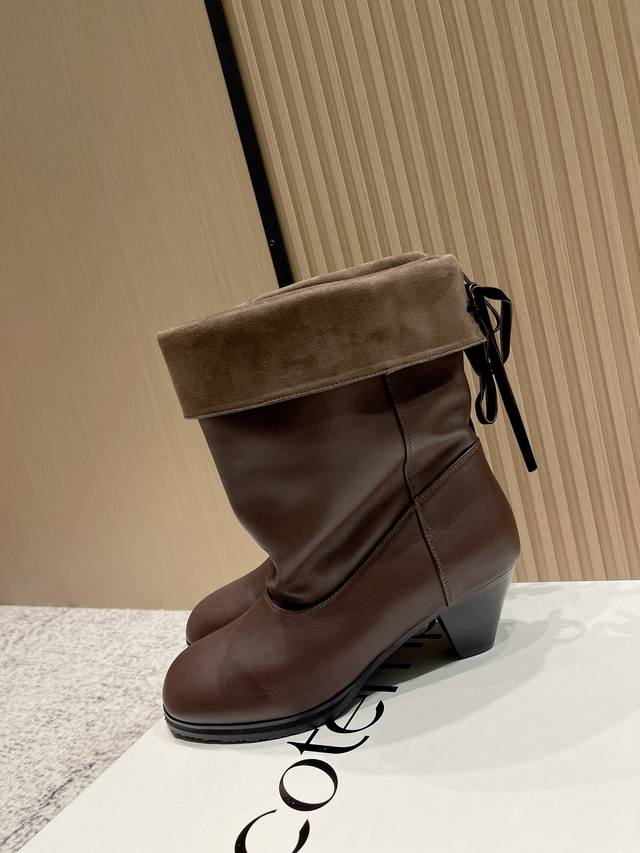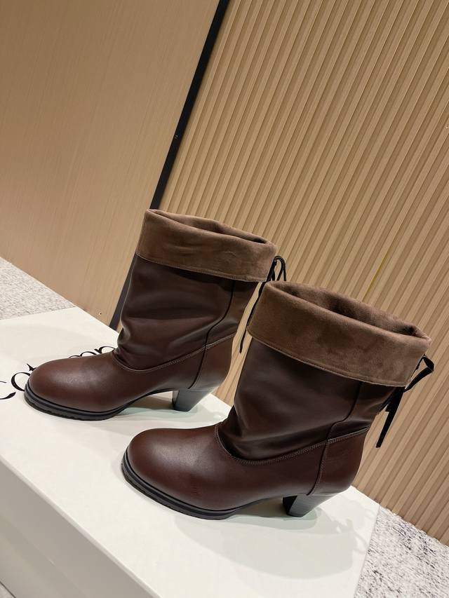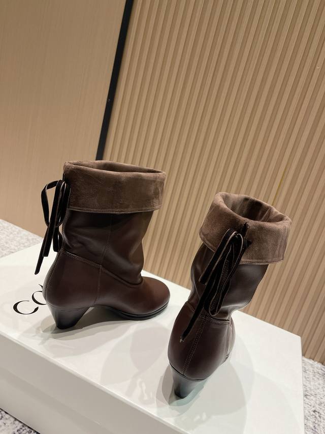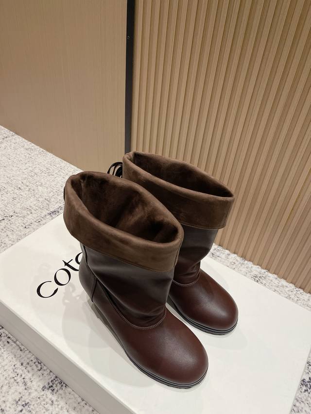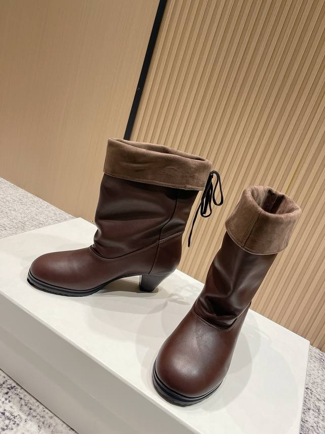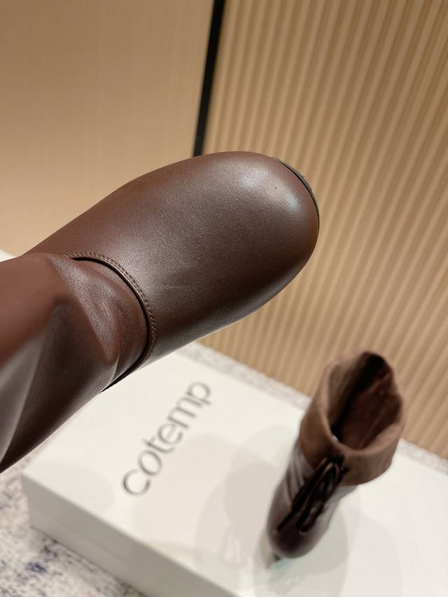 Top-tier version: Cotemp Winfair 25 Aw round-toe pleated boots. The fine-grained cowhide leather boasts a delicate and even sheen. The inner and outer leather panels on the boot shaft create a striking contrast of soft textures. Continuing Cotemp's design, the Regalo features a delicately rounded toe, a fine-grained cowhide upper, and a wider boot shaft, offering a soft, stackable, and effortlessly chic look. Presenting a neutral, clean-cut, modern style perfect for autumn and winter. Material: Cowhide; Lining: Sheepskin; Outsole: Rubber. Sizes: 35-41. Sizes 40 and 41 are custom-made, non-refundable and non-exchangeable.