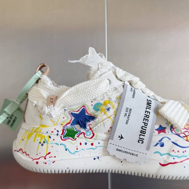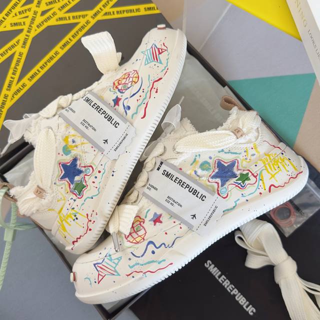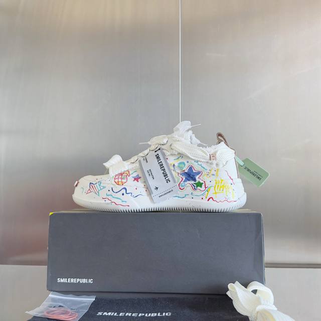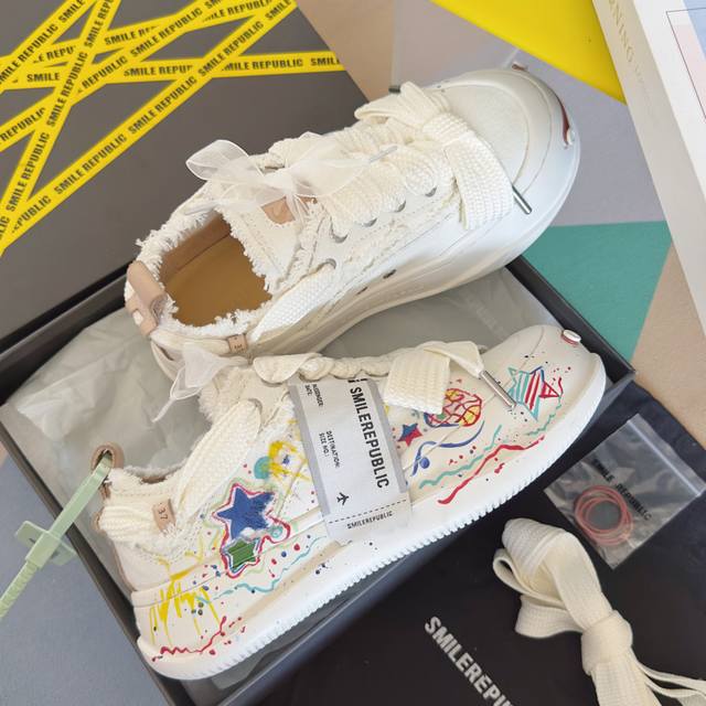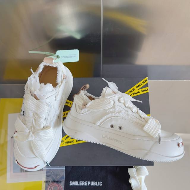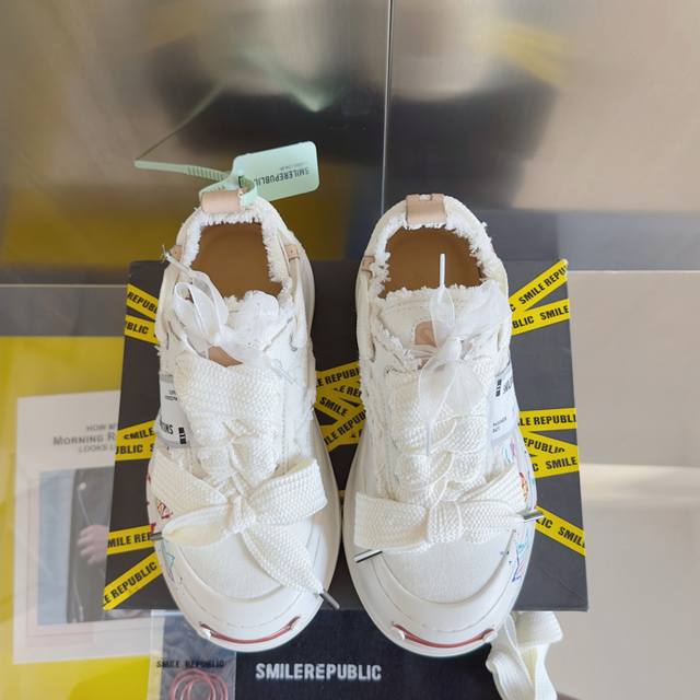 Top-tier version: Couple style Smilerepublic Tan Jianci same style thick-soled open-toe canvas shoes, casual sports shoes for couples. Original purchase, developed and manufactured, a popular online hit, a couple's casual series of oversized shoes, beggar shoes, sports shoes. Smilerepublic is an American brand, featuring today's popular elements, frayed laces, wide shoelaces with a bow texture, and a retro oversized sole, creating a strong visual impact! It also represents the latest trendy signature color scheme. The custom paper label logo on the side of the shoe is of course the most eye-catching feature. Comes with exquisite packaging from the official store. Material: Original custom high-density canvas. Lining: Imported top-layer cowhide lining. Sole: Original molded rubber material. Sole thickness: 4.5cm. Size: Women's 35-40, Men's 39-45.