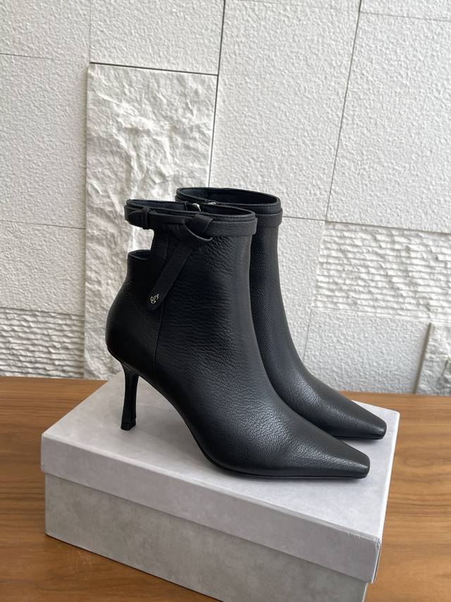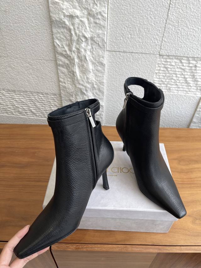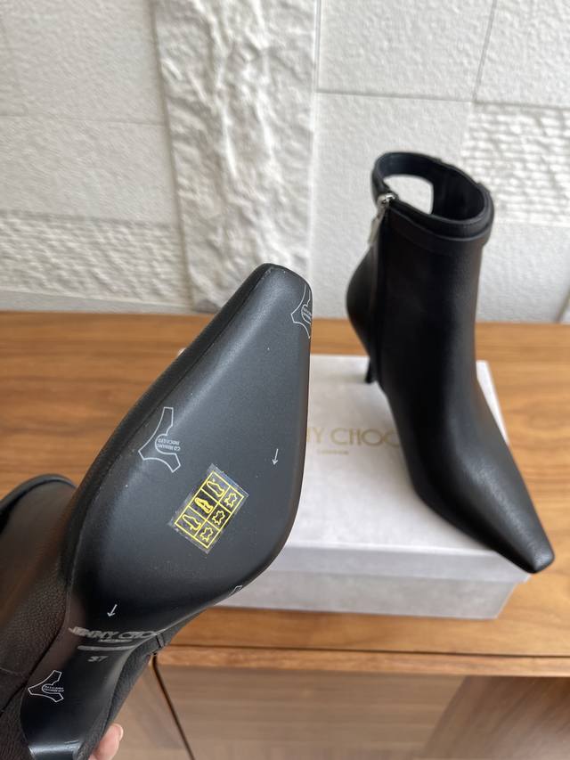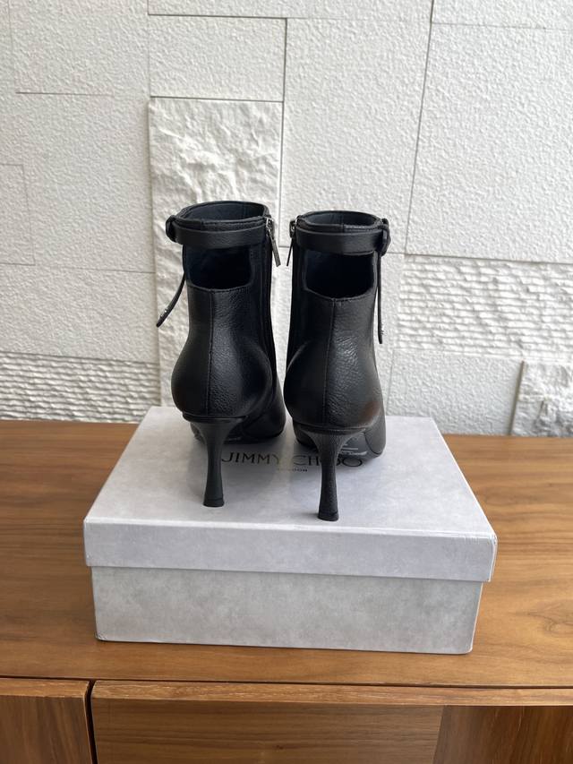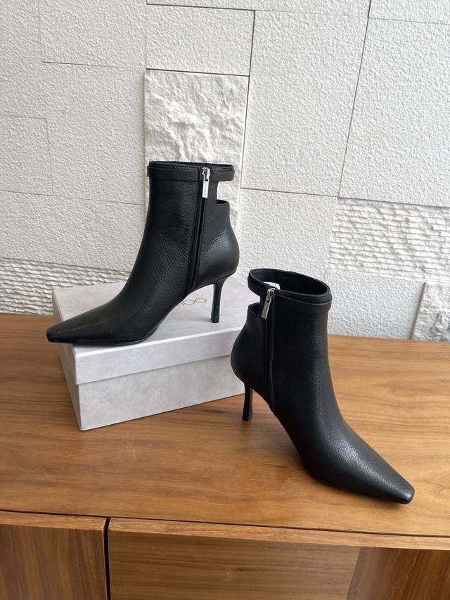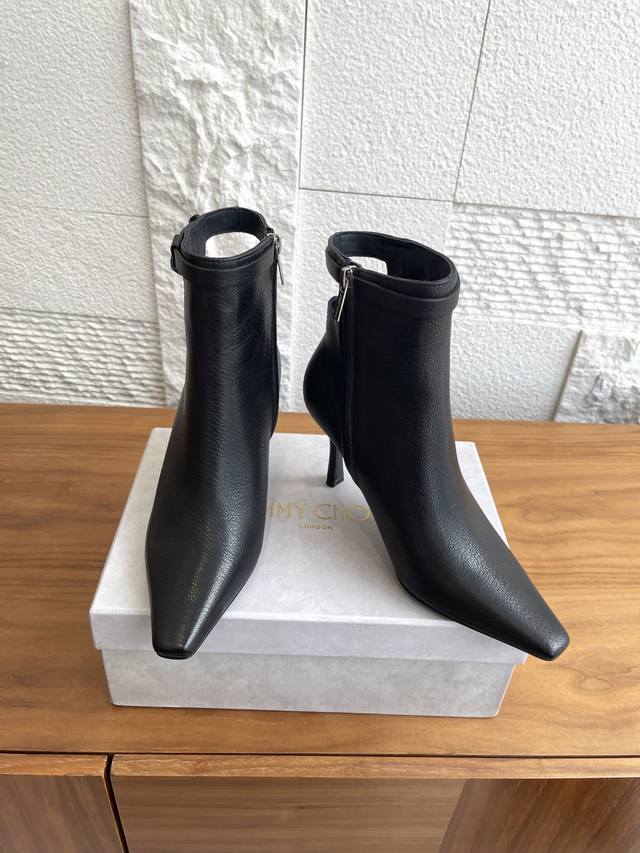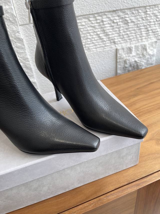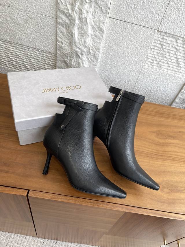 Top-tier version: Jimmy Choo 25Ss Autumn/Winter New Arrival Camie Ankle Boot 85. The Camie Ankle Boot 85 series ankle boots are crafted from glossy lambskin, featuring a pointed toe and a stylish, sleek stiletto heel for a captivating look. A wraparound ankle strap adorned with eye-catching metal hardware adds a trendy touch to the modern, sleek silhouette. Material: Imported lambskin; Lining: Imported lambskin; Outsole: Italian imported genuine leather; Heel height: 8.5cm; Size: 35-42 (40, 41, 42 are custom-made and non-refundable).