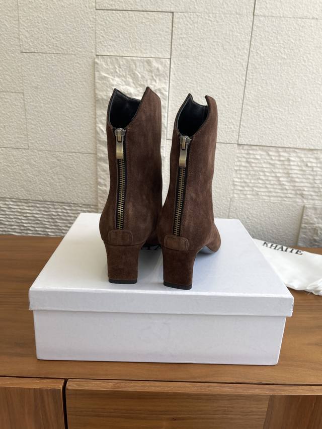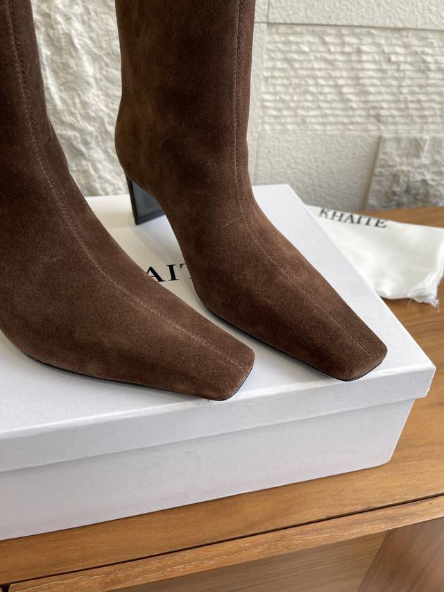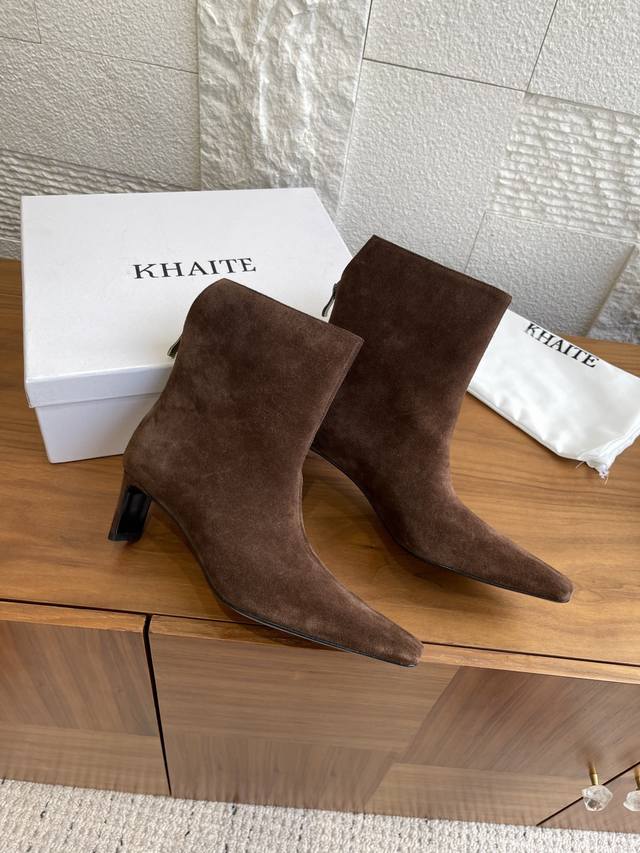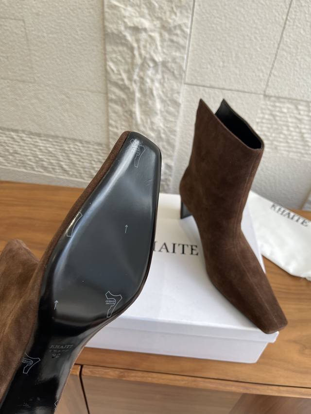 Khaite Ona ankle boots enhances the ease of wearing and pulling on this suede square-toe ankle boot. The smooth blade heel contrasts sharply with the square toe, creating a slimming and versatile look. Material: Imported suede, imported calfskin. Lining: Imported sheepskin. Outsole: Italian imported genuine leather. Heel height: 5cm. Size: 35-40. Custom orders are non-refundable and non-exchangeable.
