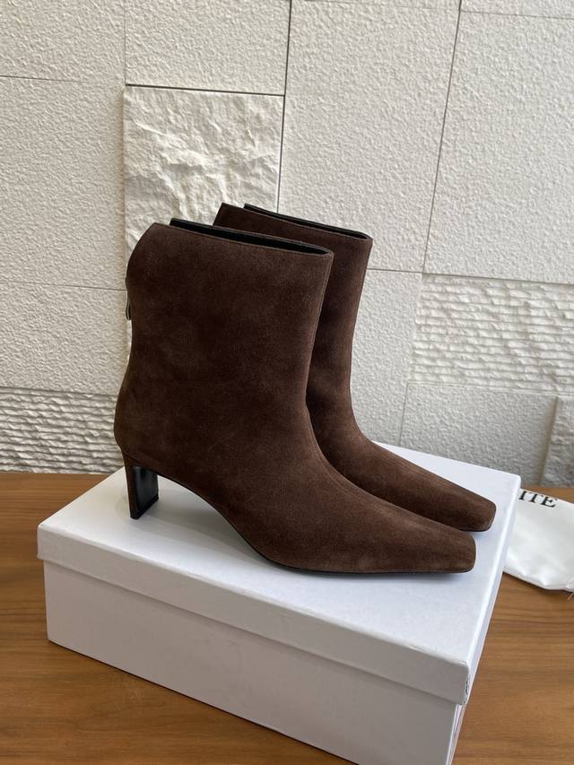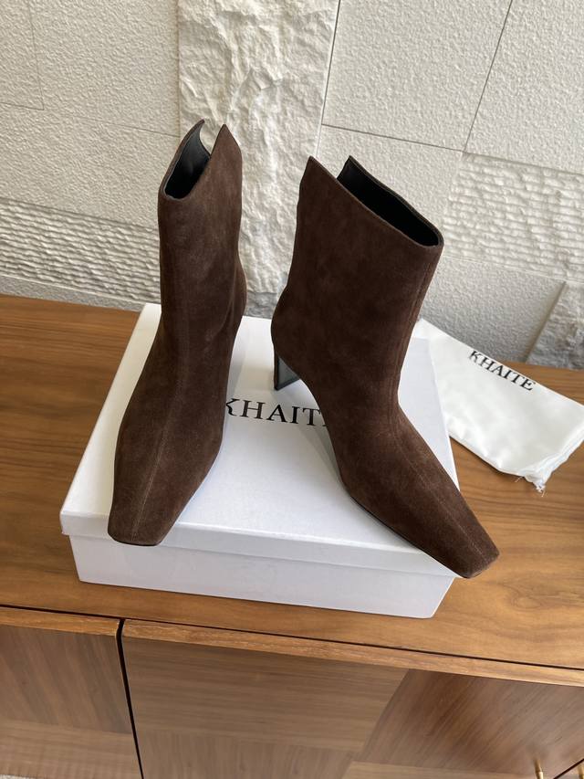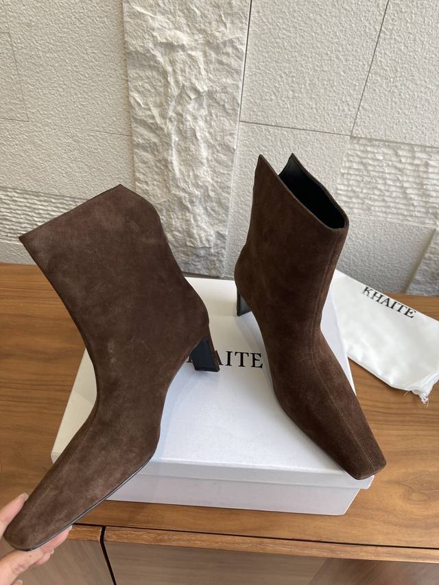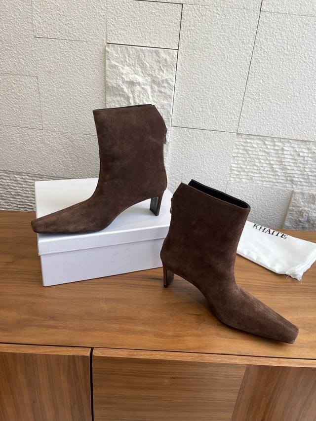 Khaite 2025 Autumn/Winter New Square Toe Back Zipper High-Heeled Ona Ankle Boots. The unique notched back design of these