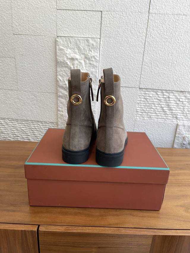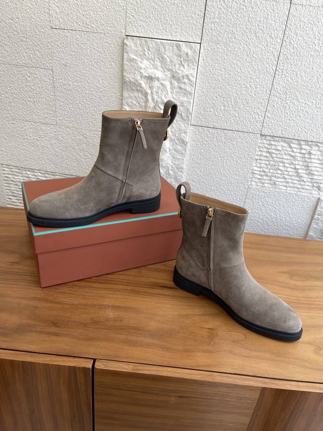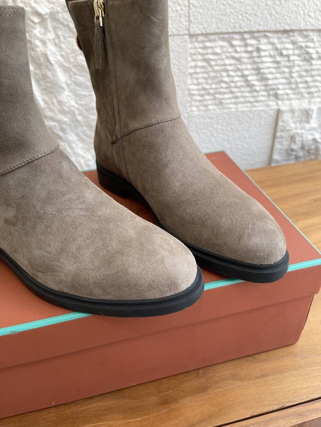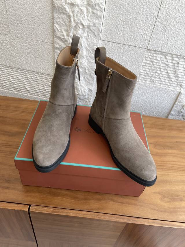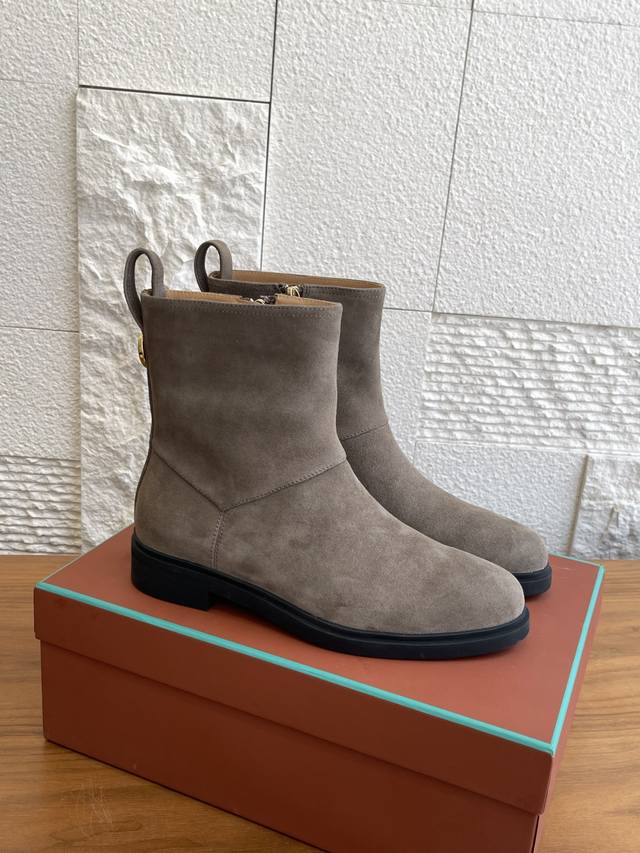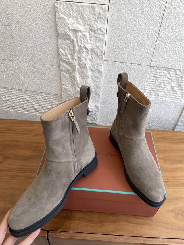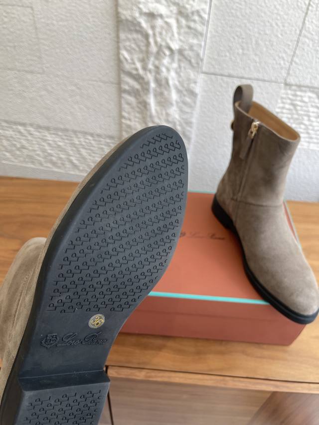 Top-tier version: Loro Piana 25Ss Fall/Winter New Kilda Side Zipper Ankle Boots. These iconic ankle boots are crafted from suede leather, giving them a rustic yet unique retro aesthetic. They feature an inner zipper closure with a matching zipper pull, metallic details at the back with the brand logo engraved, a leather circular zipper pull, and a Loro Piana non-slip rubber sole. The casual yet sophisticated style is suitable for both urban looks and relaxed weekend outfits. Material: Imported suede; Lining: Imported sheepskin; Outsole: Original molded rubber outsole; Size: 35-41 (40-41 are custom-made and non-refundable).