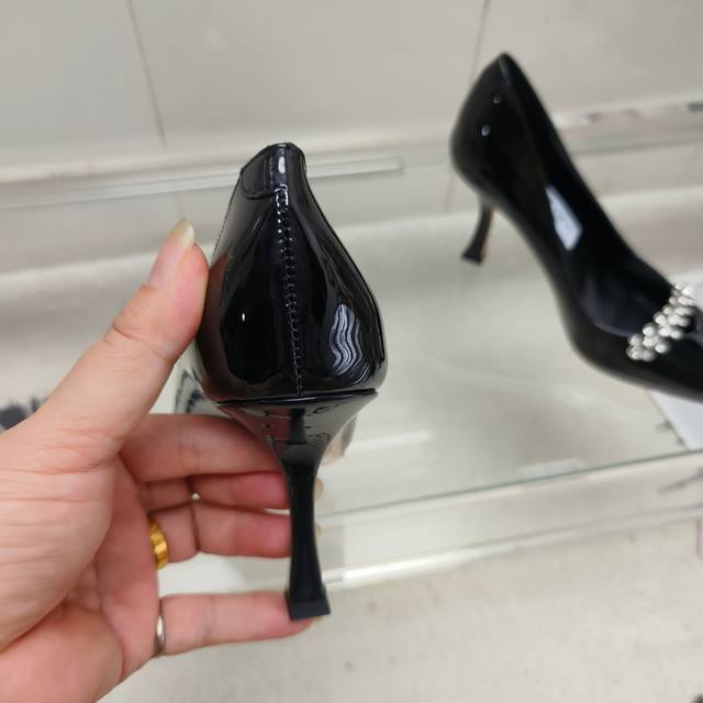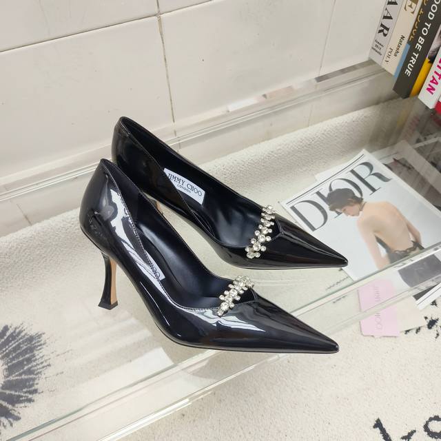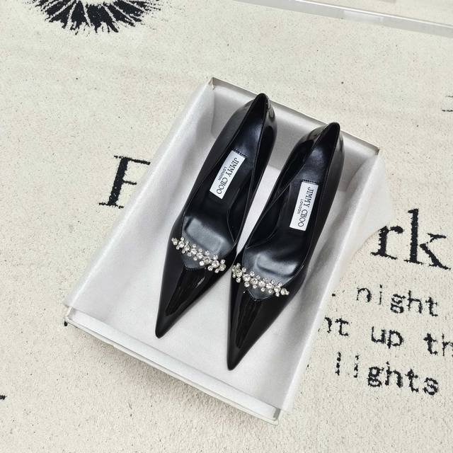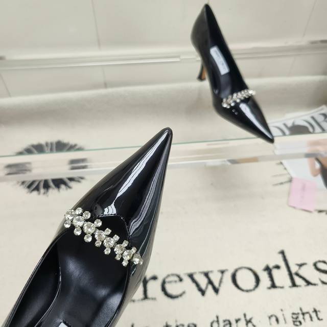 Top-tier version of Jimmy Choo Belinda Pum series high heels, crafted from high-gloss patent leather for a modern silhouette. The distinctive pointed toe and 9cm heel, along with the exquisite crystal-embellished straps, create a captivating look. Upper: Imported patent leather; Lining: Sheepskin; Heel height: 9cm; Outsole: Italian genuine leather; Sizes: 35-39; 40. Custom orders are non-refundable and non-exchangeable.