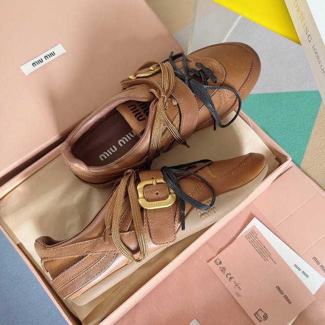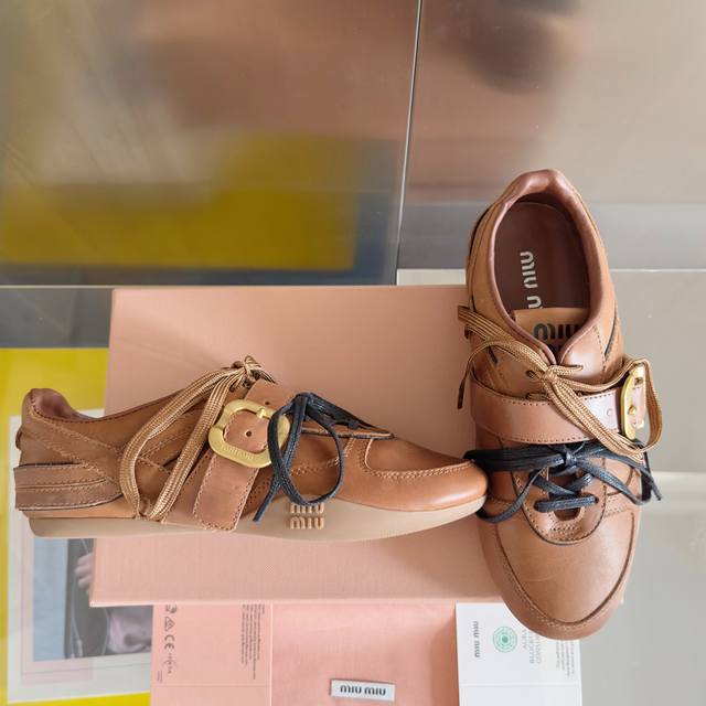Top-tier version: Women's Miu Miu latest runway Gymnasium series brogue casual sneakers, German training shoes, Cornetto shoes. Original purchase and development, combining the iconic buckle from the fashion show with the sporty style of sneakers, reinterpreted with soft leather, presenting a retro look and exquisite features. Comes with exquisite boutique packaging. Material: Original custom top-grain cowhide. Lining: Original custom soft sheepskin lining. Outsole: Original molded non-slip rubber material. Sole thickness: 1.5cm. Size: Women's 35-41.