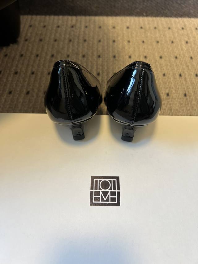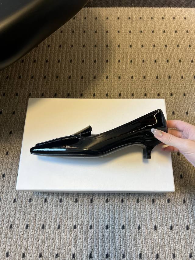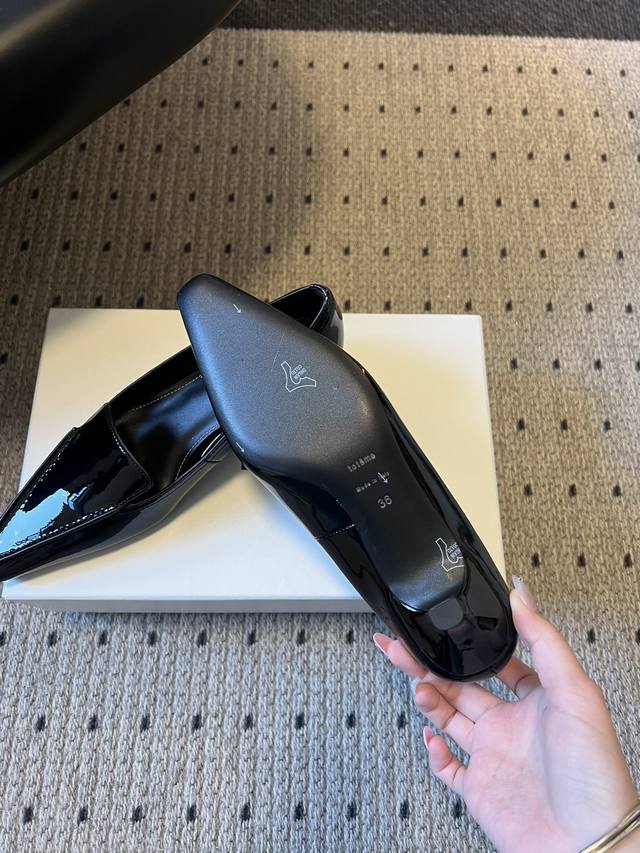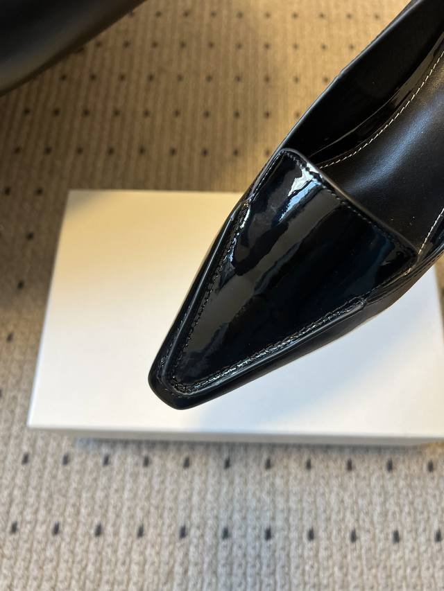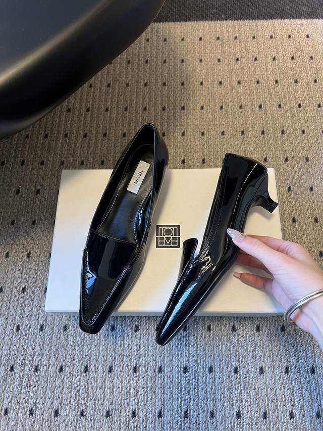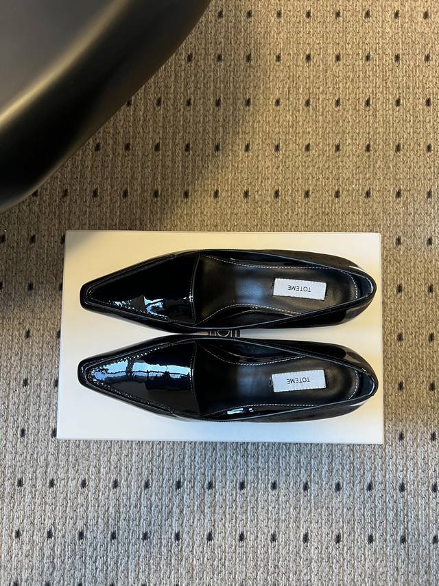 Toteme 26Ss Early Spring New Low-Heeled Pointed-Toe Casual Shoes DDD Toteme was founded in 2014 by Elin Kling and Karl Lindman, headquartered in Stockholm, Sweden. It focuses on Scandinavian minimalist aesthetics, emphasizing the combination of practicality and classic design. DDD The pointed-toe silhouette combines architectural and elegant elements, while the 4cm low heel balances comfort and style, suitable for commuting, leisure, and other occasions. DDD A classic piece for minimalist outfits, it can be paired with wide-leg pants, leather skirts, trench coats, etc., to create a sophisticated professional look or a casual everyday style. DDD Upper: Patent Leather DDD Lining: Sheepskin DDD Sole: Italian Genuine Leather Outsole DDD Sizes: 35-41, Sizes 40 and 41 are custom-made and non-refundable DDD Heel Height: 4cm DDD