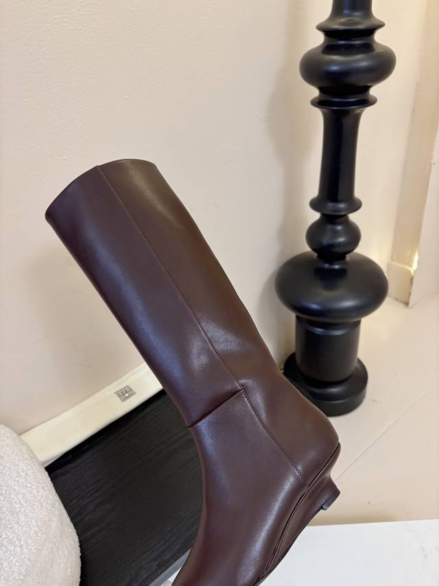 Toteme25Ss new autumn/winter retro wedge-heeled boots with pointed toe and side zipper! The stylish, minimal pointed toe and raised heel design are versatile and provide a stable feel. The shoe's slender and stylish silhouette, with a slight build-up, makes legs appear thinner. These versatile slimming boots easily create a stylish, long-legged look! And they look great with dresses and miniskirts without much thought. Upper made of fine calfskin leather. Lined with sheepskin. Imported Italian leather outsole. Heel height: 4.5cm. Sizes: 35-42, 40, 41, 42. No returns or exchanges. Comes with original packaging.