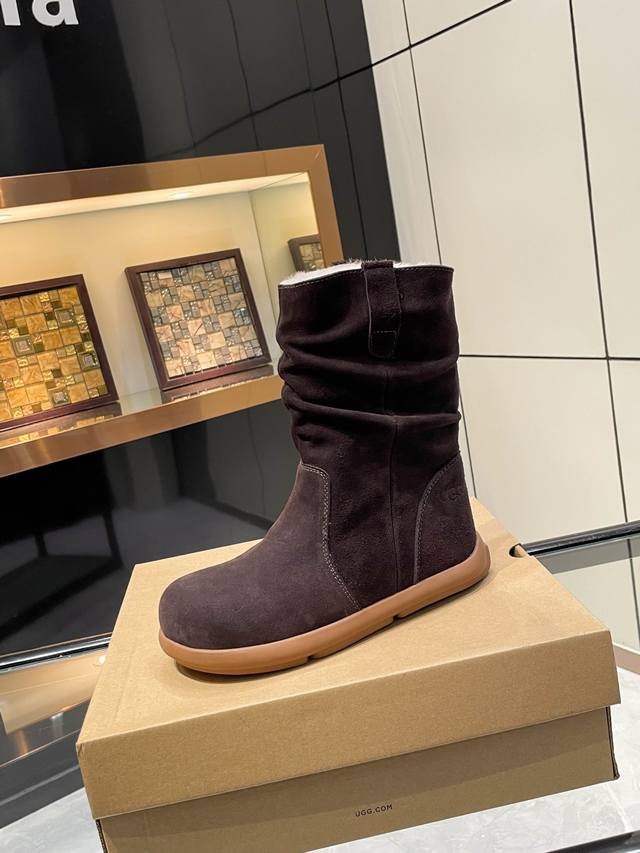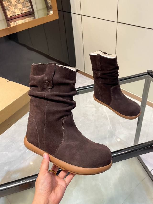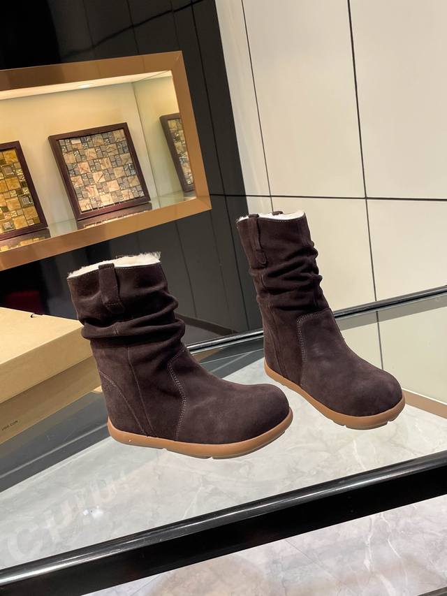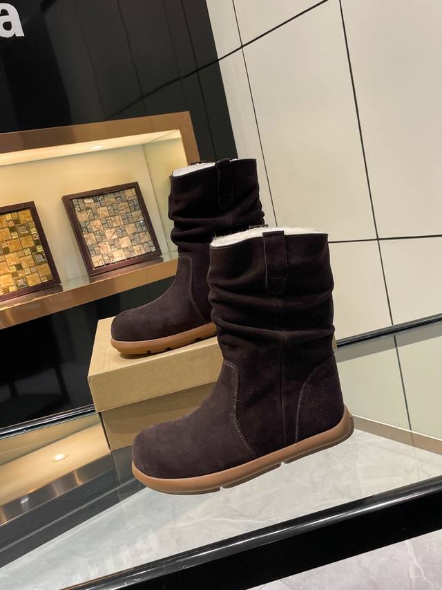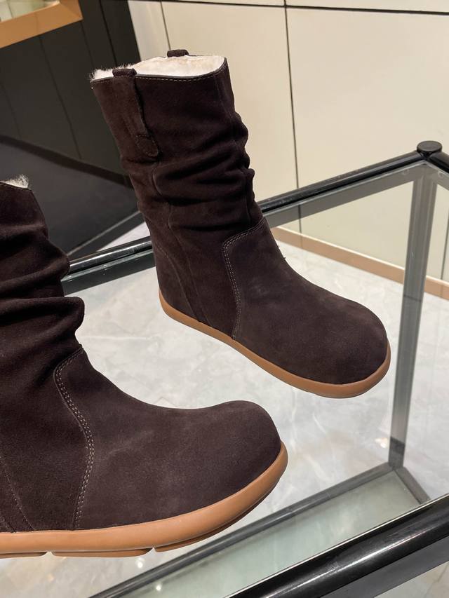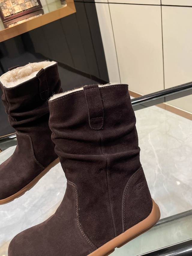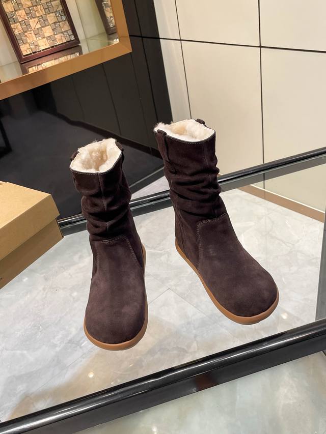 Ugg. 2025. Small potato sole. Exclusive first release of pleated wool boots. Material: Outer fabric, cow suede; Lining, insole, Australian imported pure wool. Craftsmanship: Hand-pleated. Longer thighs with a flattering last. Available in three colors: Brown, Khaki, and Almond. Sizes 35-40.