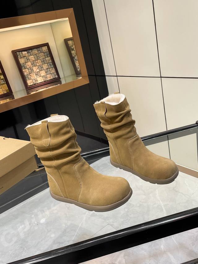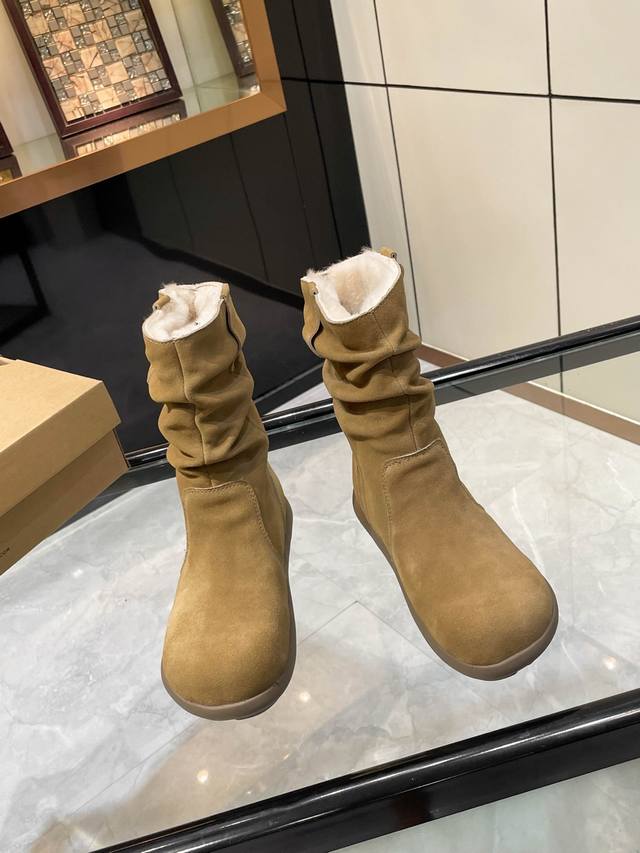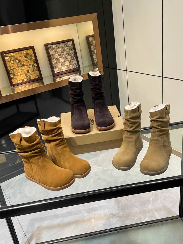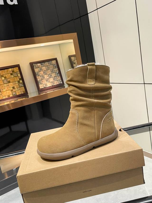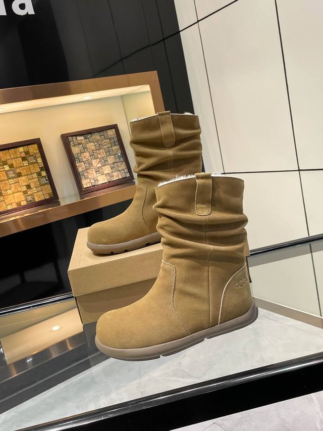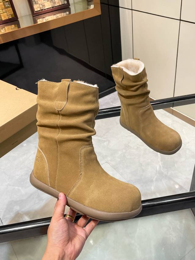 Ugg. 2025. Small potato sole. Exclusive first release of pleated wool boots. Material: Outer fabric, cow suede, lining, insole, Australian imported pure wool. Craftsmanship: Hand-pleated. Longer thigh shape. Available in three colors: brown, khaki, and tan. Sizes 35-40.