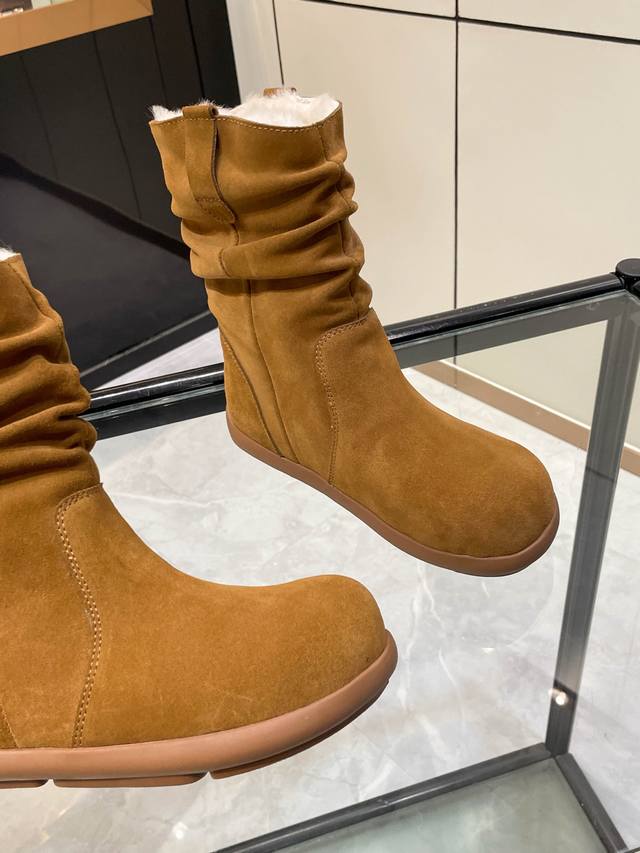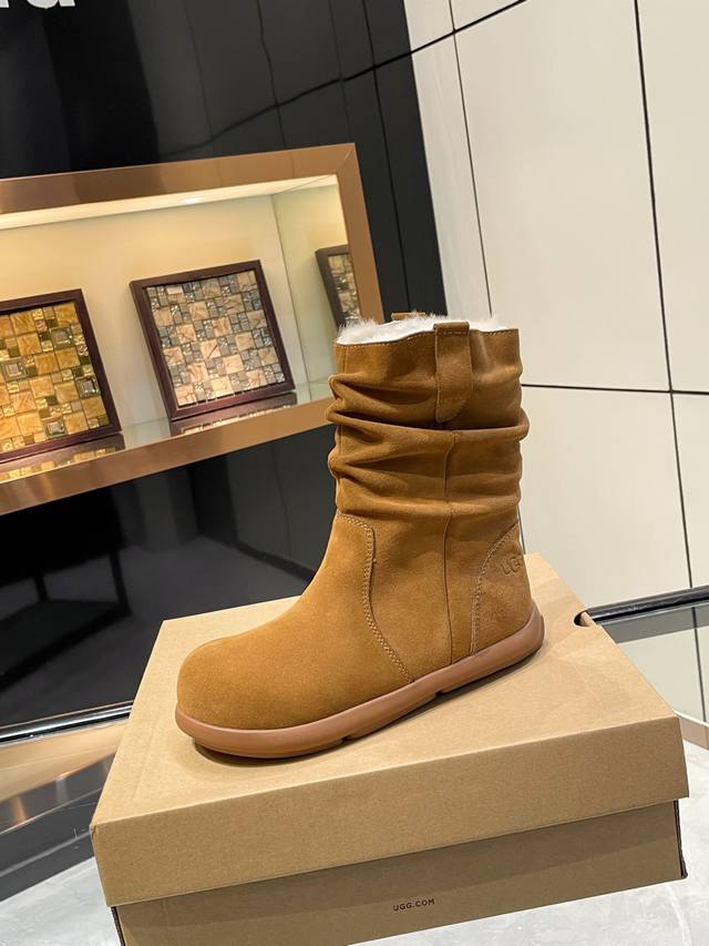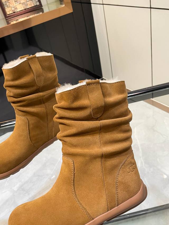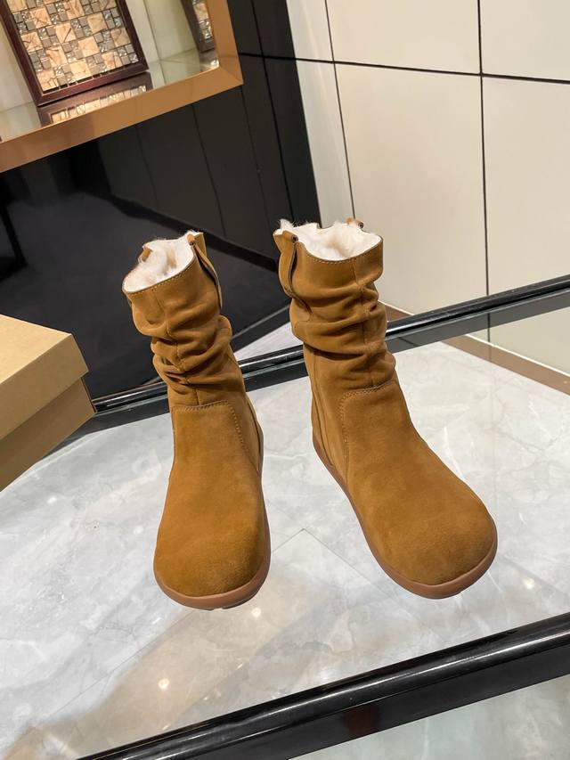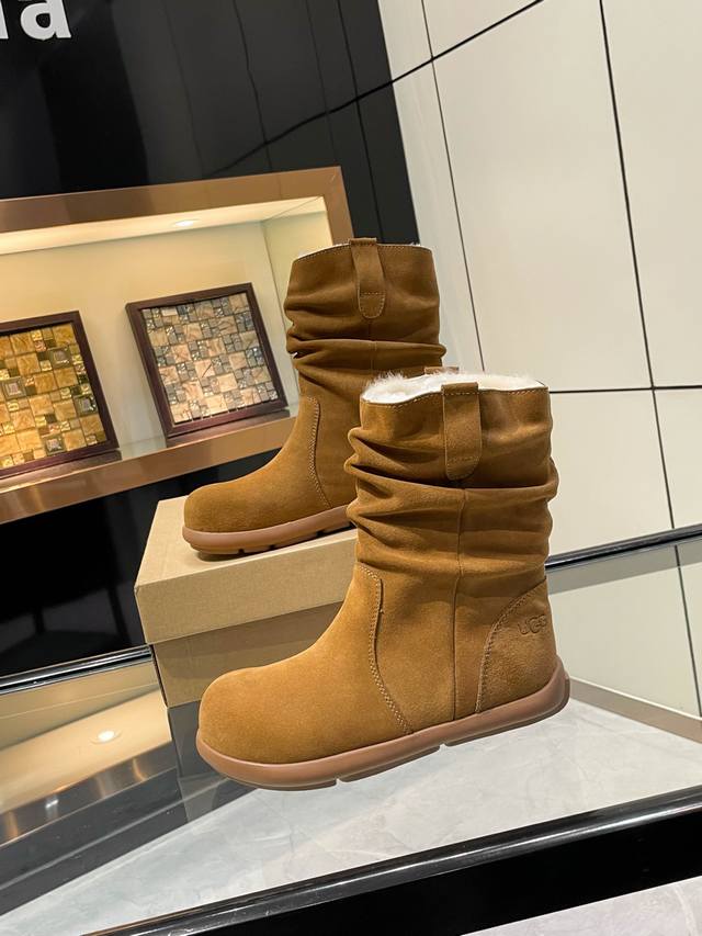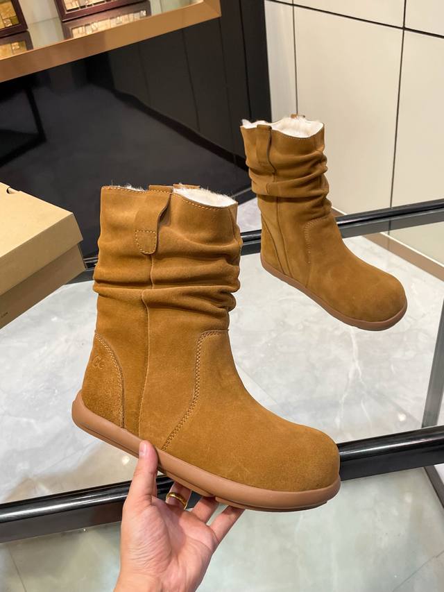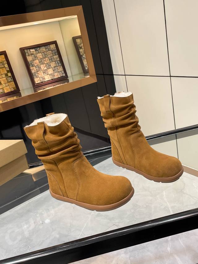 Ugg. 2025. Small potato sole. Exclusive first release of pleated wool boots. Material: Outer fabric, cow suede lining, insole, Australian imported pure wool. Craftsmanship: Hand-pleated. Longer thigh shape. Available in three colors: brown, khaki, and tan. Sizes 35-40.