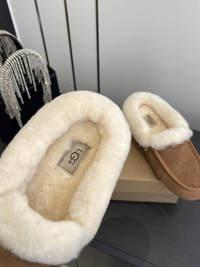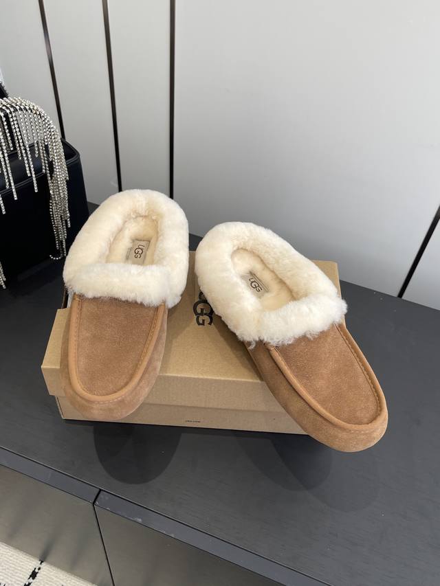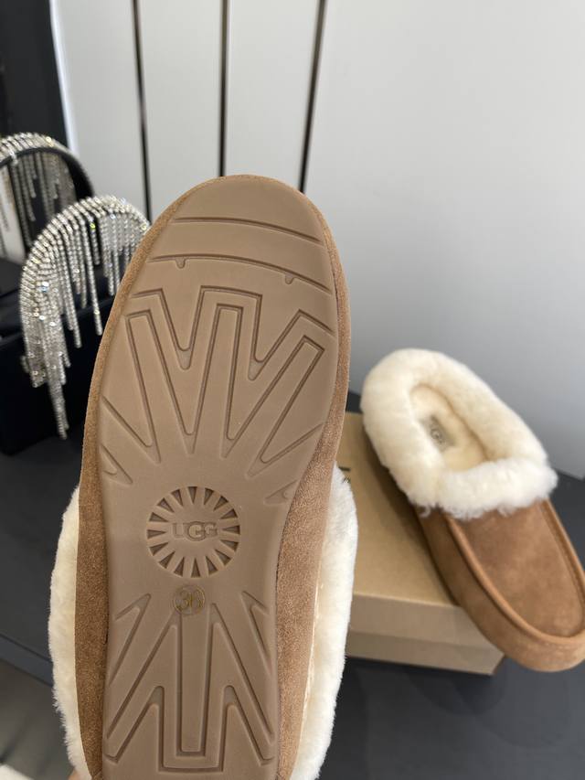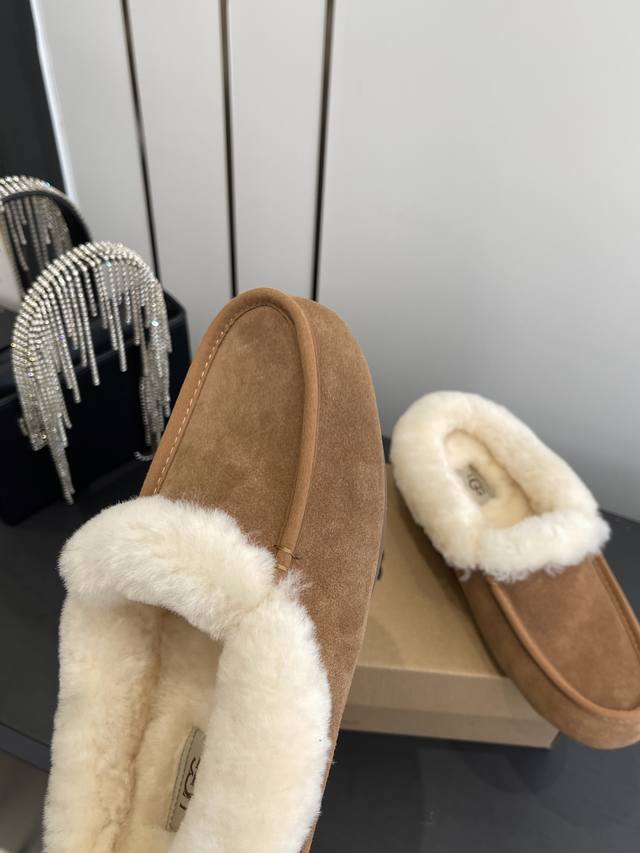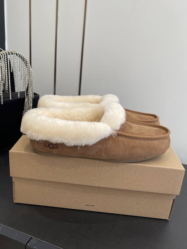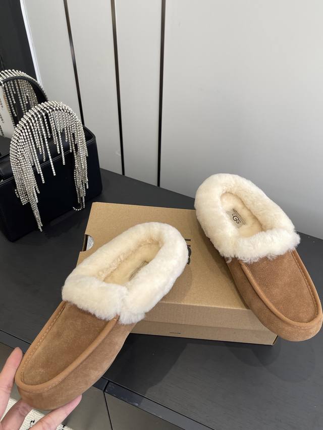 Ugg 25Ss Autumn/Winter New Slip-on Loafers, New Generation Series, Ansley Mules, Fashionable and Comfortable, Low-Cut, Flat, Slip- on Casual Loafers . Classic suede leather with 10mm wool lining. Soft and comfortable suede collar on the insole. Features the classic Ugg hot-embossed brand logo on the back. High-quality and lightweight. Thin rubber sole, non-slip, wear-resistant, and comfortable. Sizes: 35-40