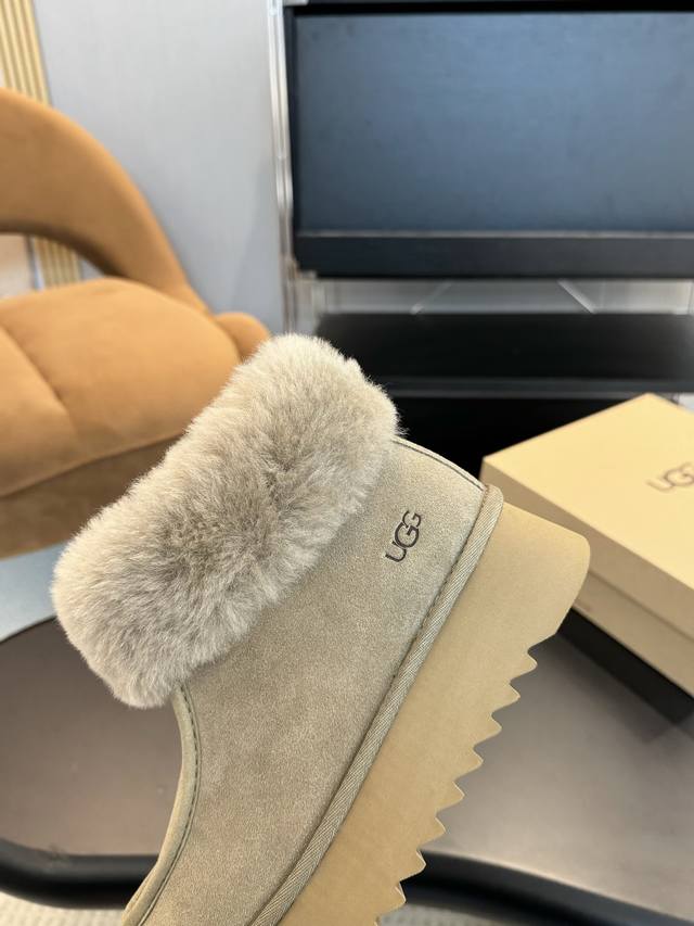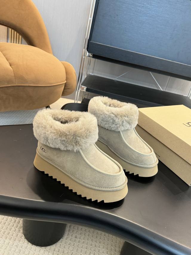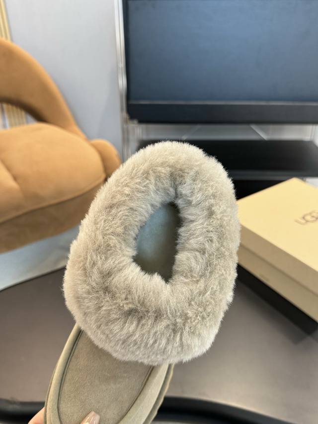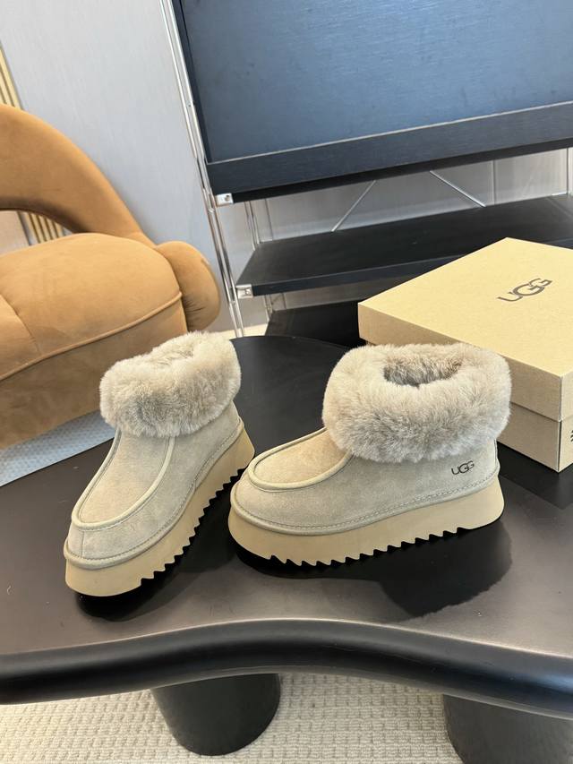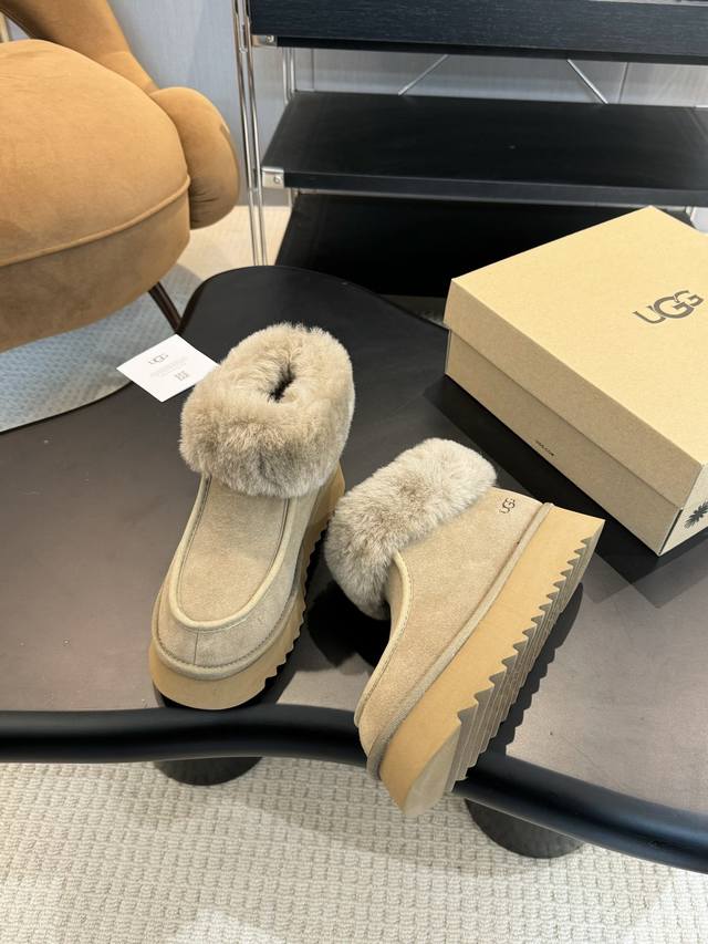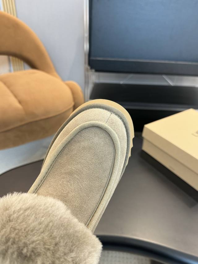 Ugg continues the ever-popular round toe design, adding a new non-slip washboard outsole. The dense, rounded collar is versatile. Look at the toe shape and lining of my dog; it took three months and multiple adjustments to achieve this. It features a cowhide suede upper, Longfeng sheepskin lining, 4.5mm outsole thickness, and is available in chestnut, mustard, and antelope brown colors. Sizes 35 to 40