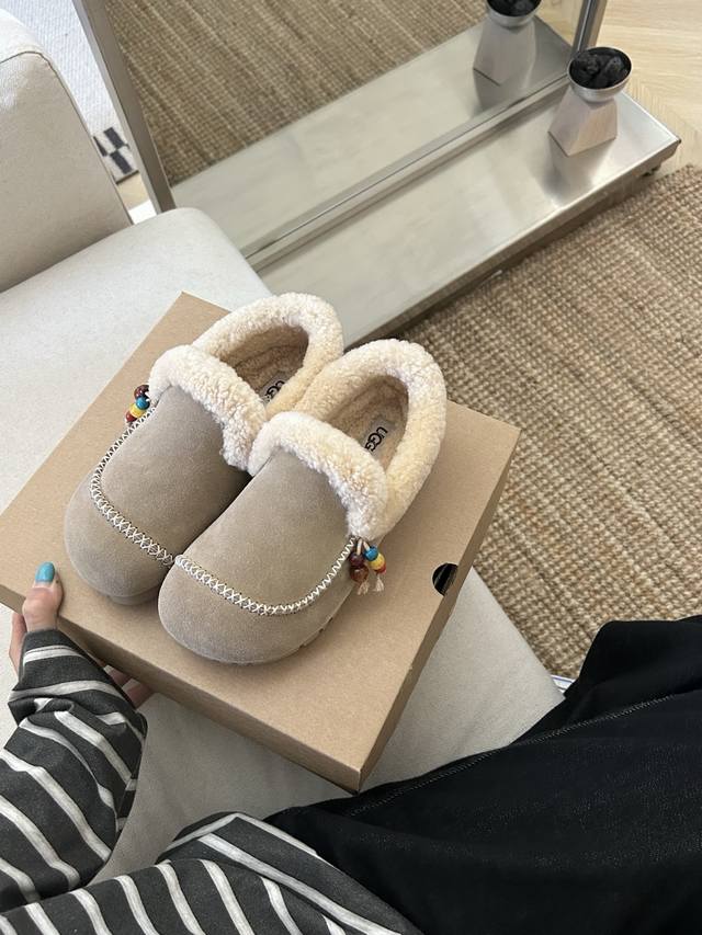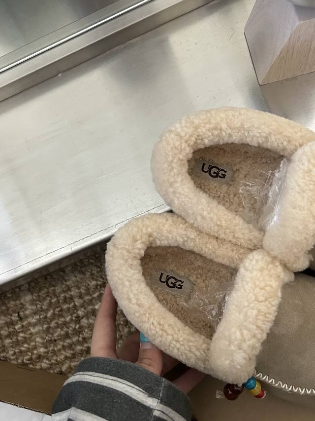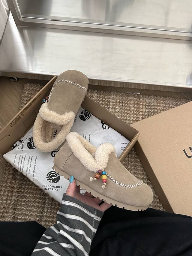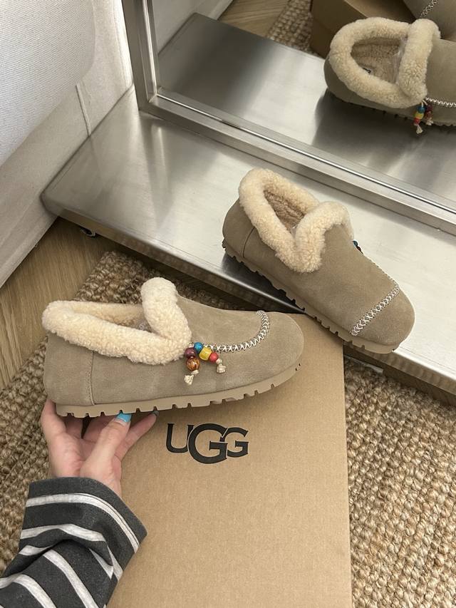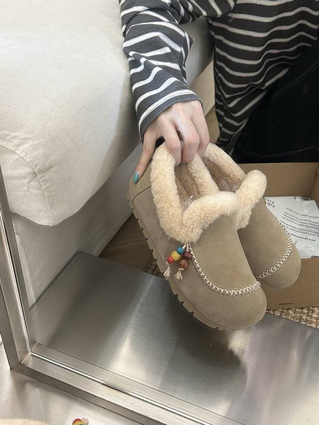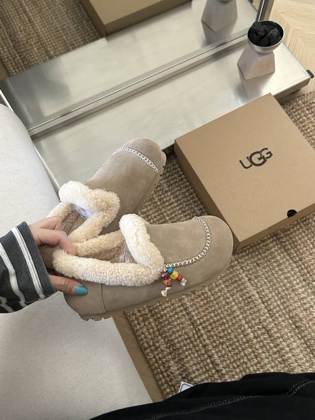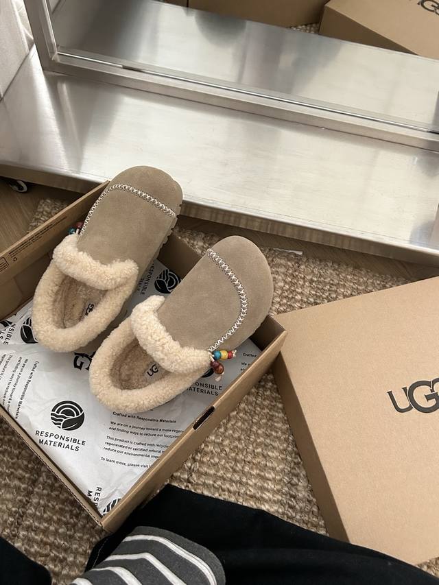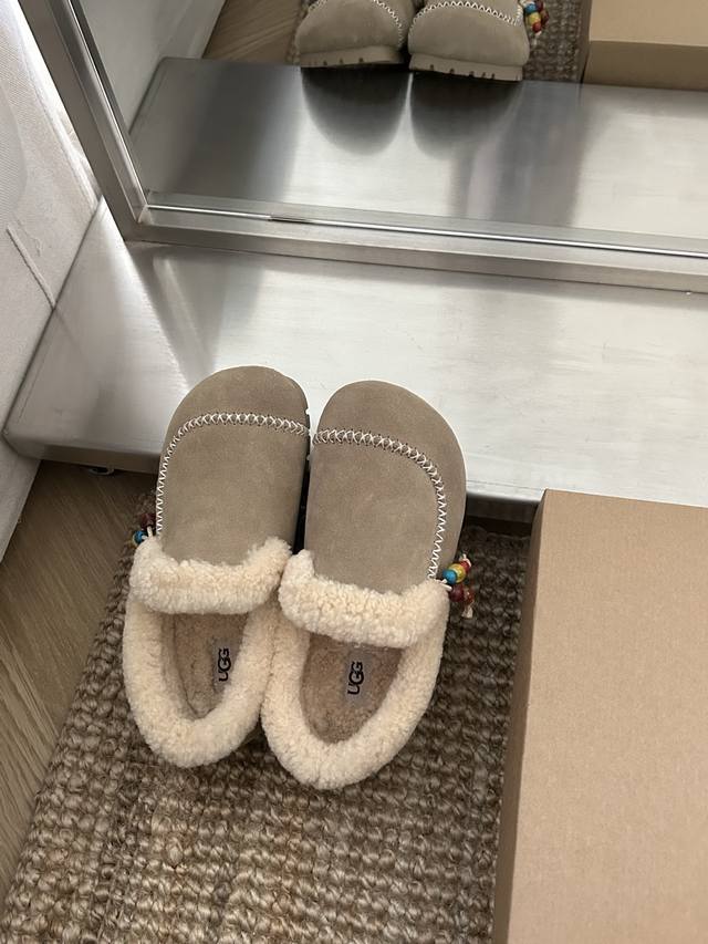 Ugg Little Red Book Mules Beaded Slip-on Shoes, trendy stitching design, warm suede lining, small tassel decoration on cowhide and wool, three colors: chestnut and rapeseed! Sizes 35-40!