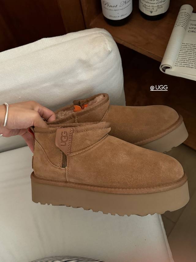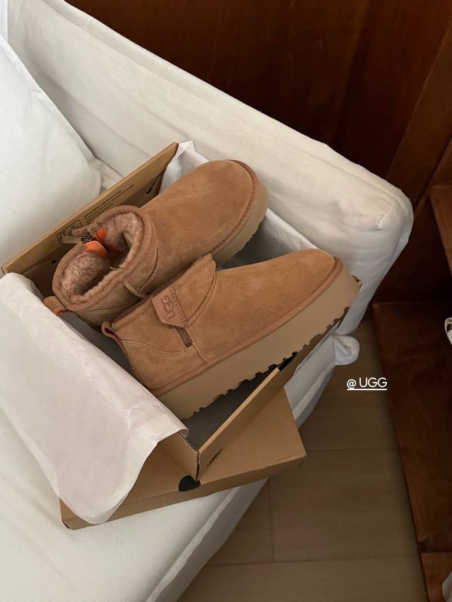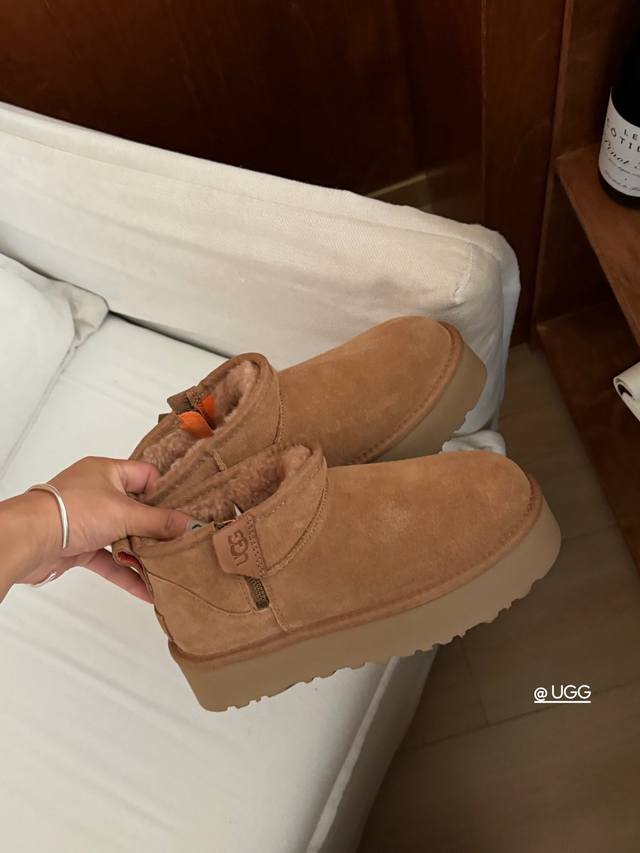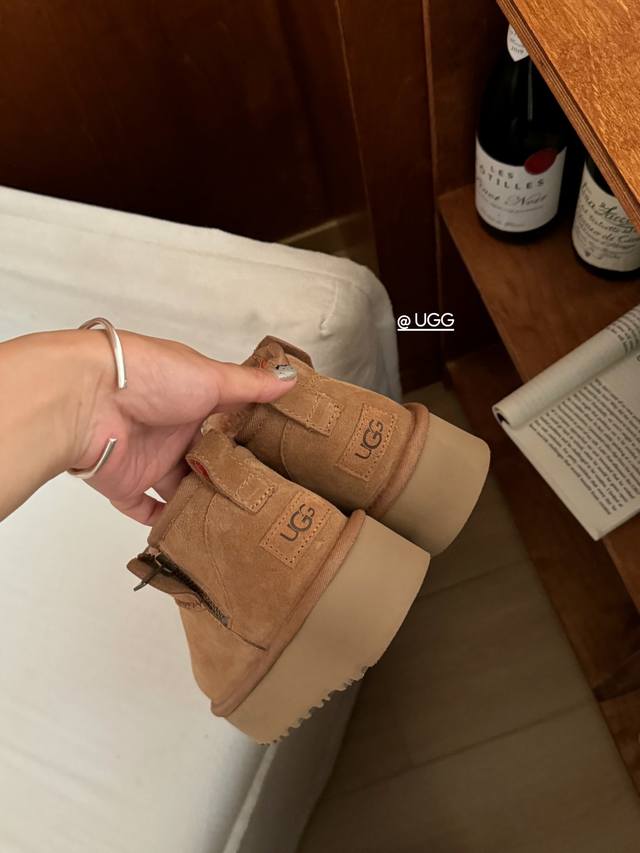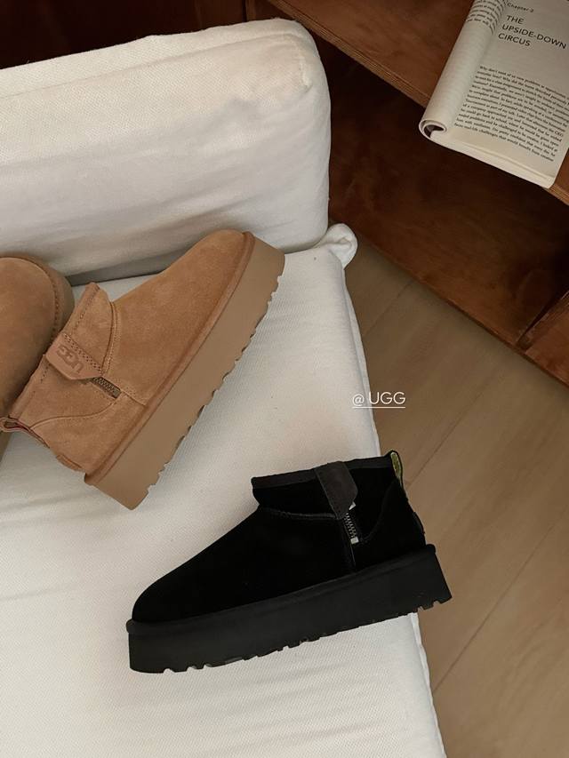 Ugg# Mini platform side zipper low-top boots. Side zipper with hand-stitched details. Textured metal zipper for easy on and off. Size: 35-40.